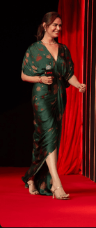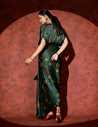Digitally printed with luscious florals on soft georgette satin, this hand-draped kaftan gown is designed to make a statement. Featuring a bold plunge neckline and a flirty front slit, it blends elegance with allure — perfect for evenings where you want to turn heads. The fluid drape ensures effortless movement, making it a standout in every setting.