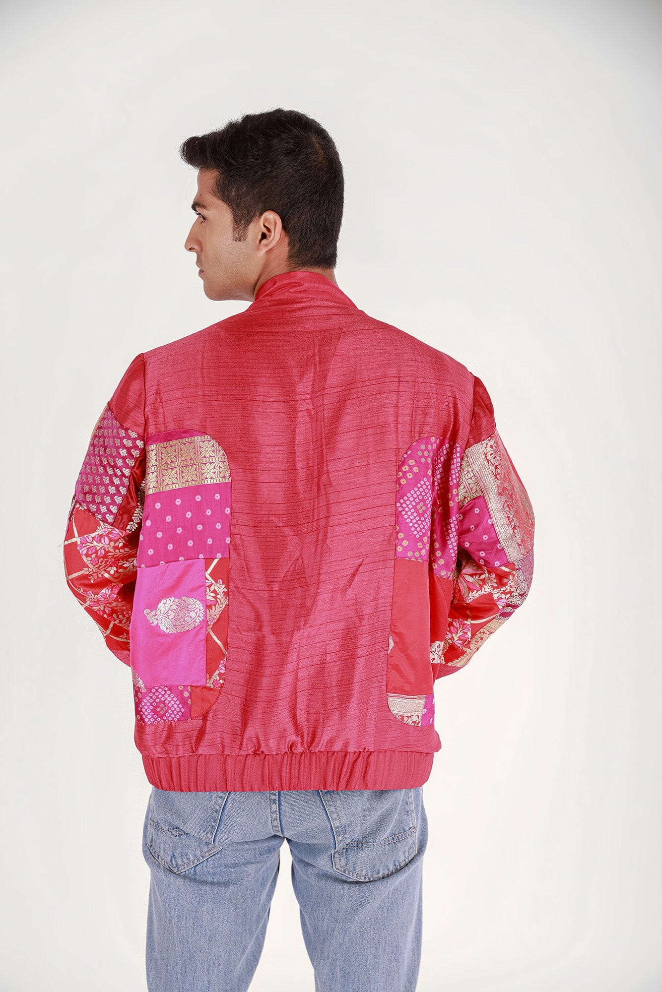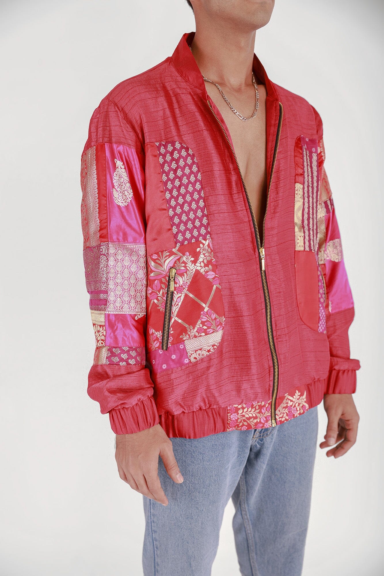 Nuestra chaqueta bomber unisex Roma Silk está confeccionada con una base de seda que también tiene parches de tela de seda mashru con un tema de rosa, morado y rojo.