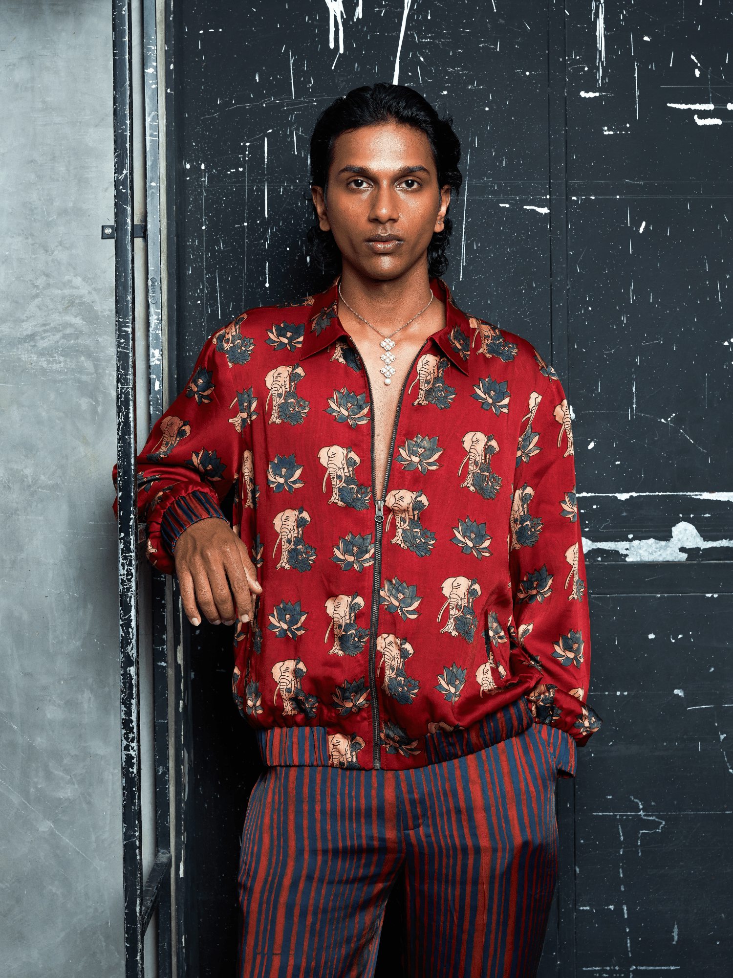 A statement bomber jacket featuring the Gentle Giant print, colour-blocked with Rustic Stripes for contrast. Designed with a structured collar and a relaxed fit, iit brings bold print and clean tailoring together — an elevated layer for evenings, travel, and effortless occasion dressing.