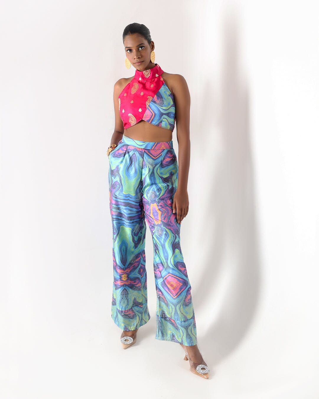 Haz una declaración audaz con nuestro pantalón de cintura alta con estampado holográfico. Confeccionados con una lujosa tela de seda banarasi, estos pantalones presentan un cautivador estampado holográfico que combina un atractivo futurista con una elegancia clásica para lograr un look verdaderamente fascinante. El pantalón viene con elástico en la espalda para mayor comodidad.