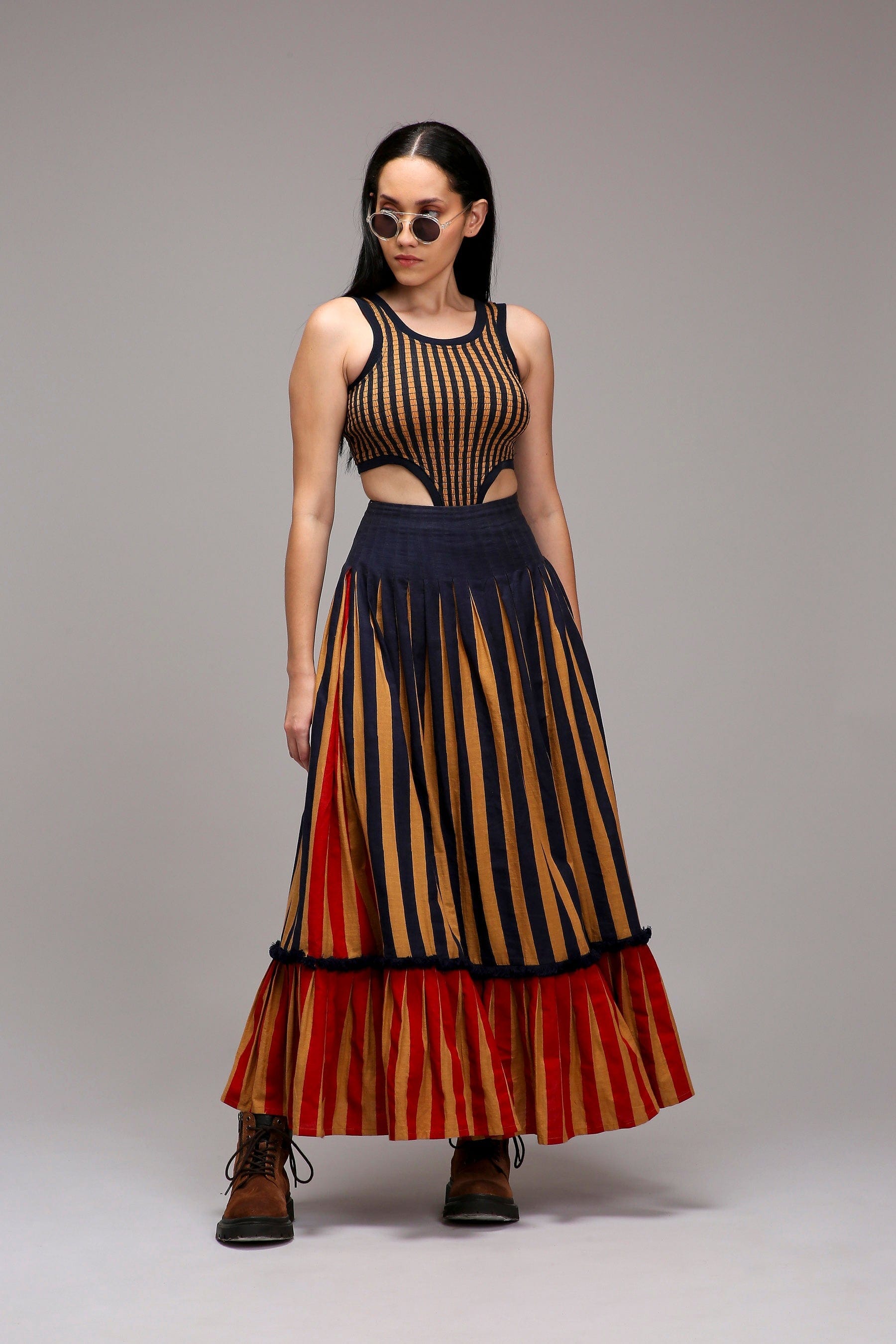 Crafted from handwoven cotton, this smocked bodysuit features cotton rib detailing at the neckline, armholes, and hem for a snug, comfortable fit. Made with hand-block printed fabric, it blends traditional craftsmanship with a modern silhouette. Pair it with a skirt, saree, or jacket from the collection to complete the look.