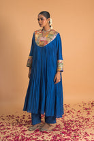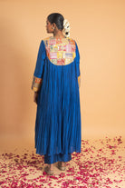 The Kurta Set in Blue features Gota applique work on the neckline of the gathered Kurta. The outfit is paired with an organza dupatta with a Gota border and Chanderi pants.