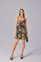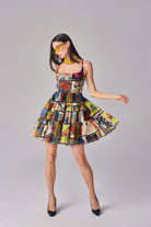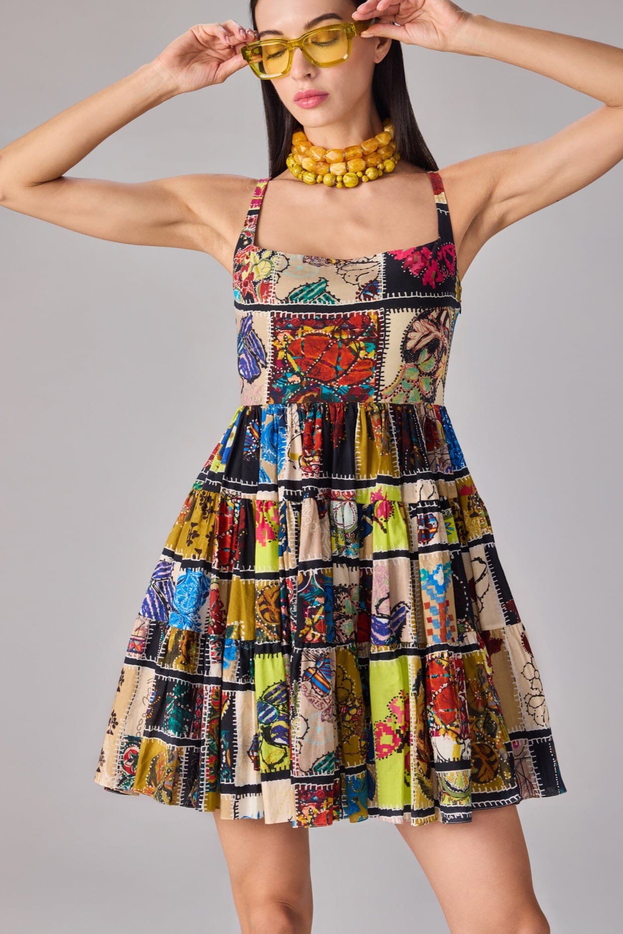 Abstract Patchwork Print Mini Dress With Square Neckline
