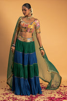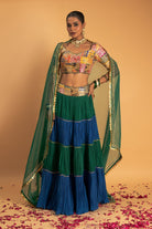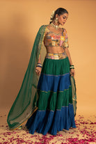 The Green and Blue Lehenga Set features Gota applique work on the belt of the gathered Lehenga. The outfit is paired with Gota applique blouse and an organza dupatta with a Gota border.