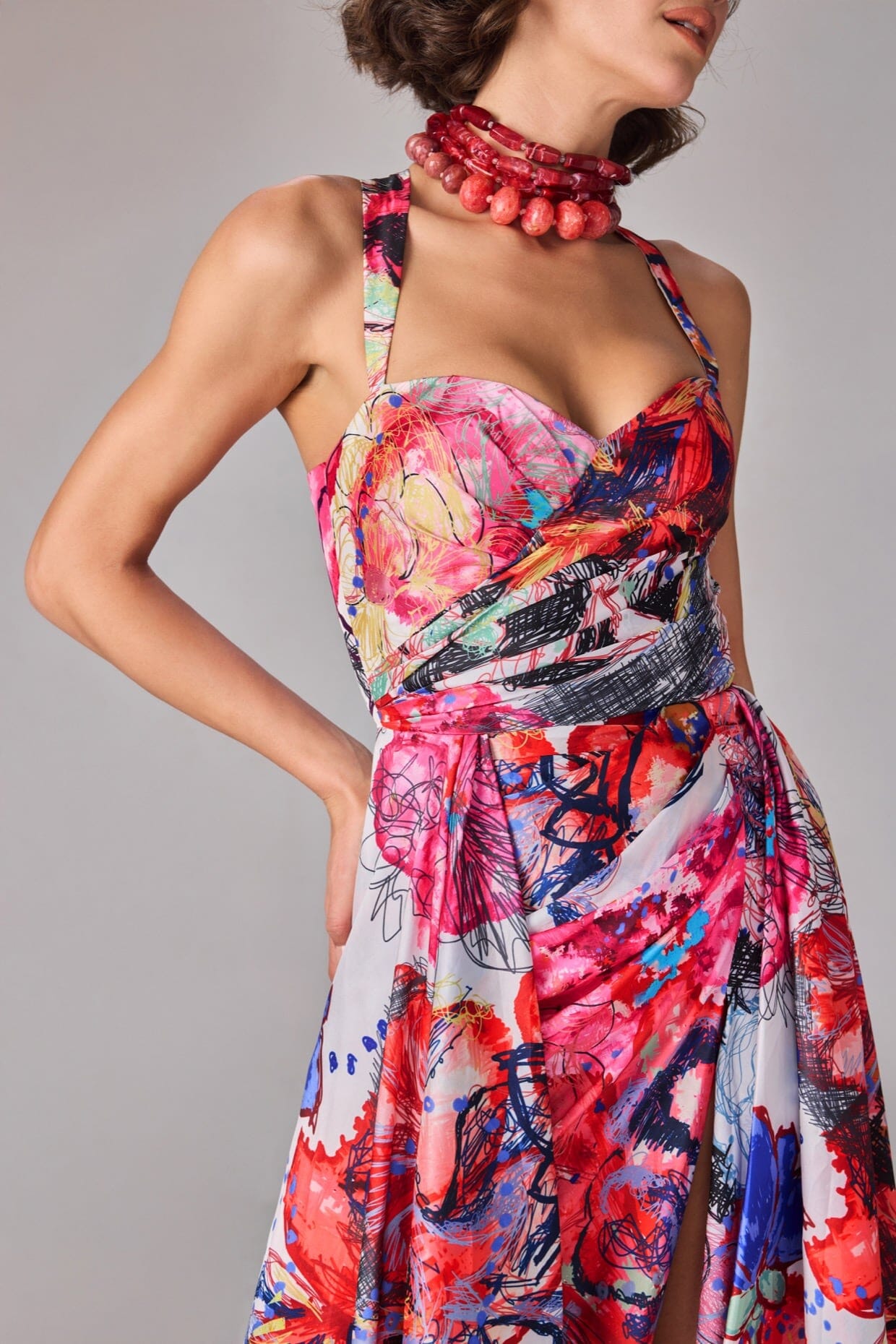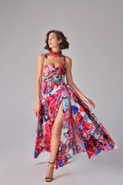 Floral Print Sweetheart Neck Maxi Dress With Surplice Bustier, Cross Back Straps, Elasticated Back Support And Customisable Side Slit
