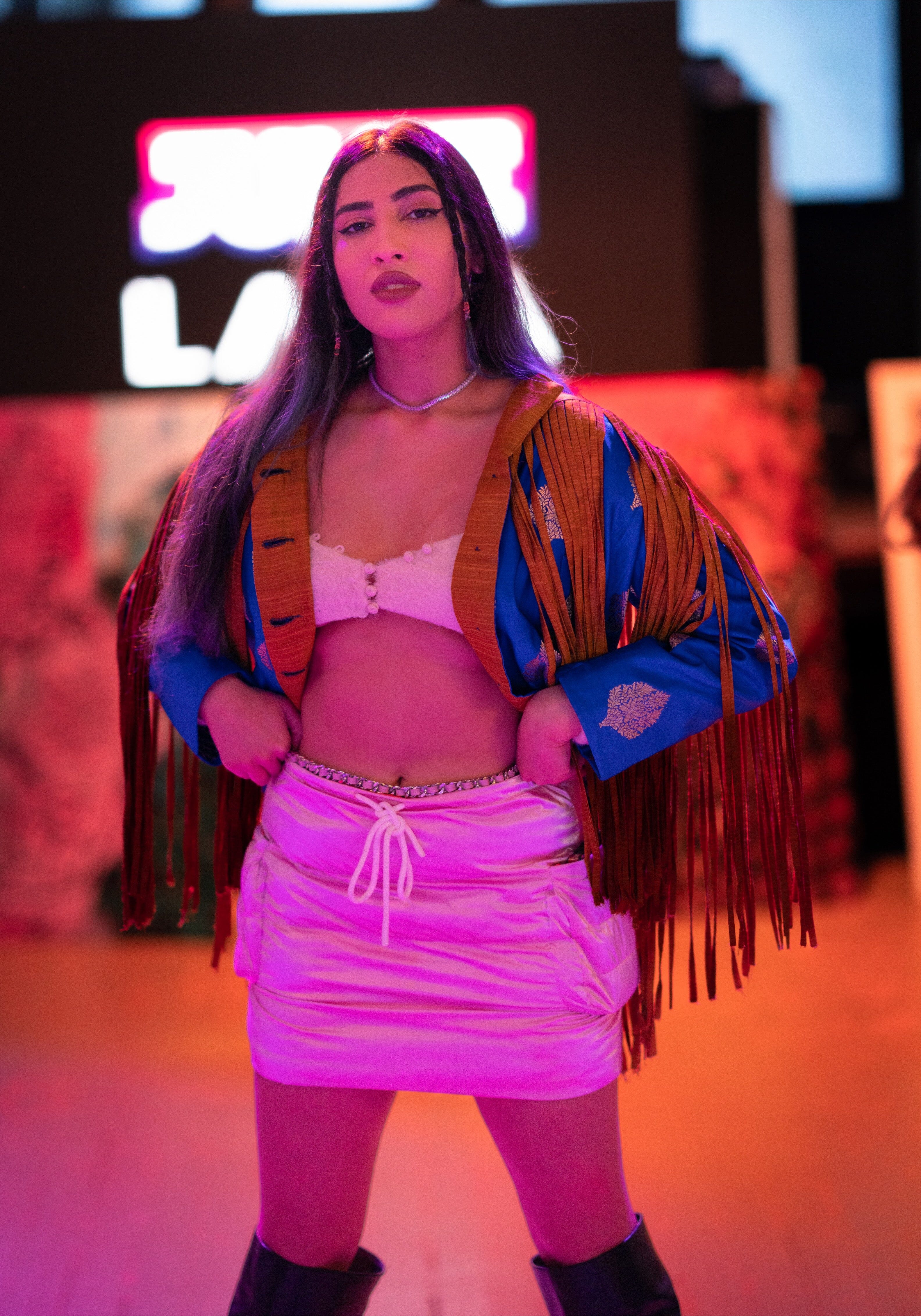 CONJUNTO KURTA HALTER CON ESTAMPADO DE BLOQUES DE CHITI