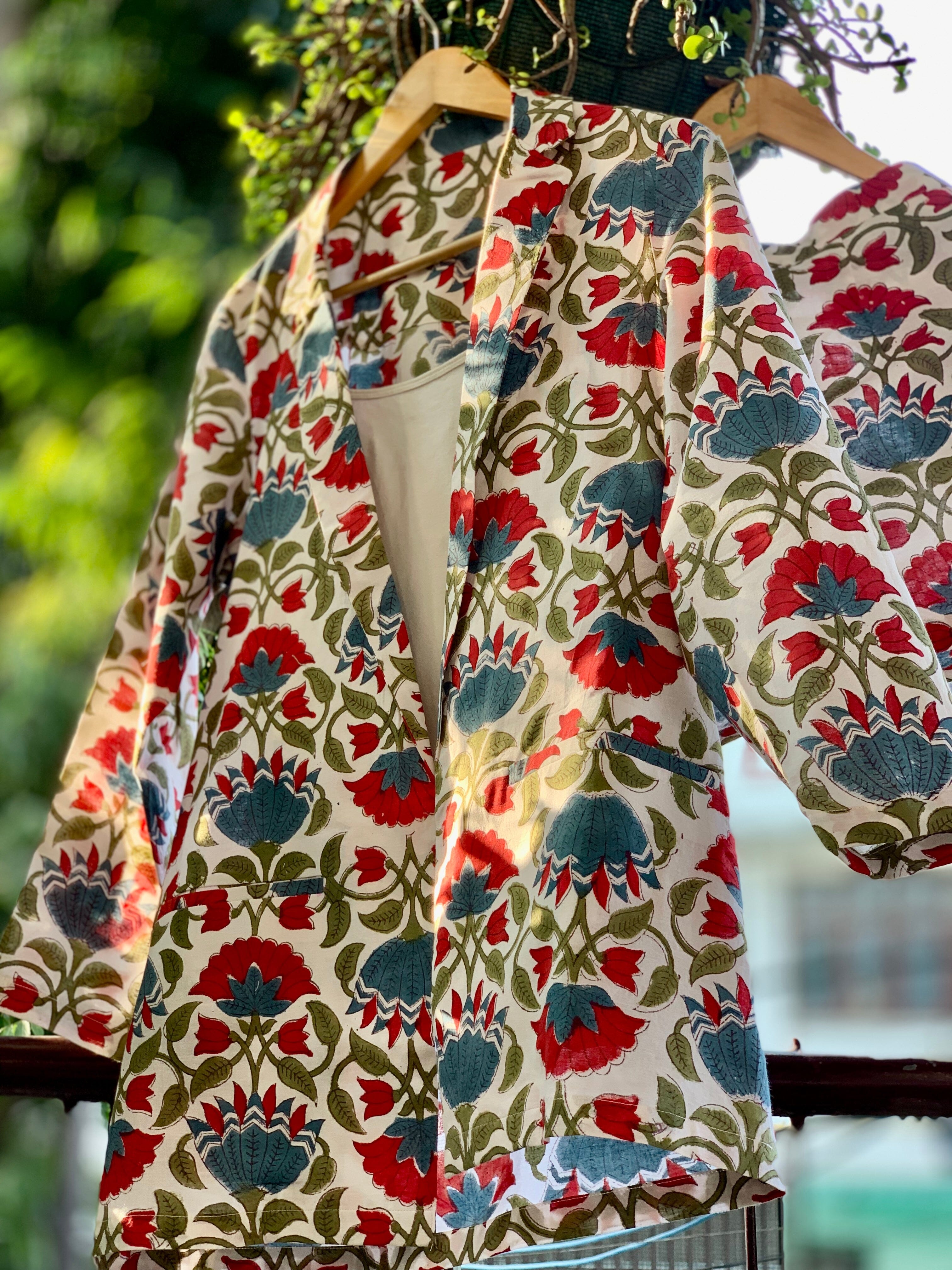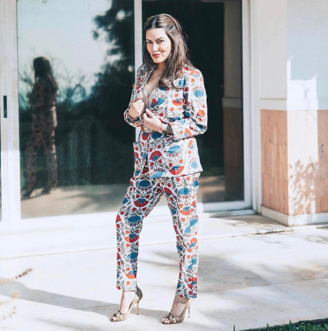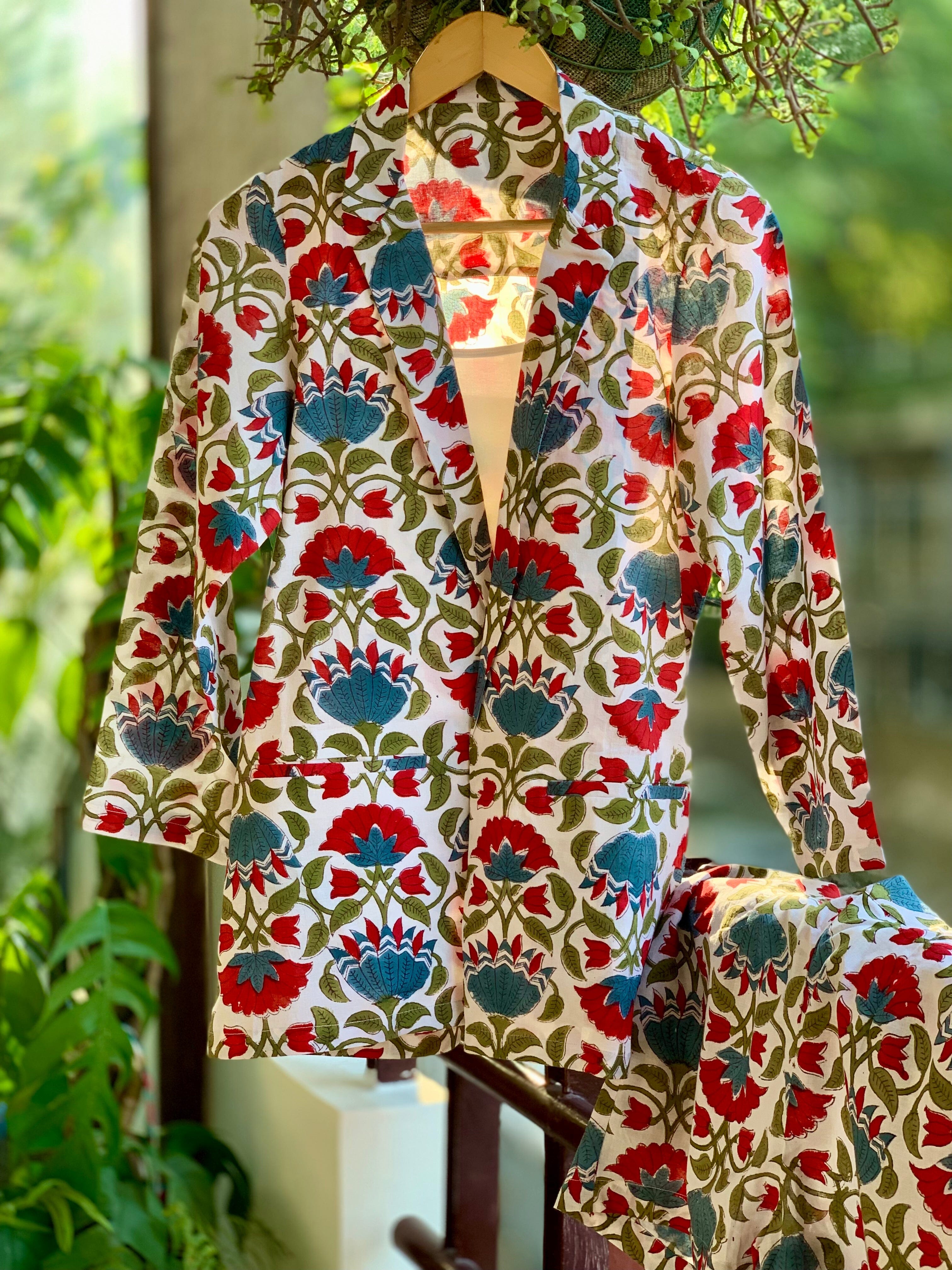 Conjunto de pantalón y blazer floral verde mar