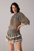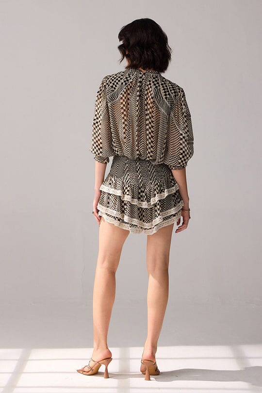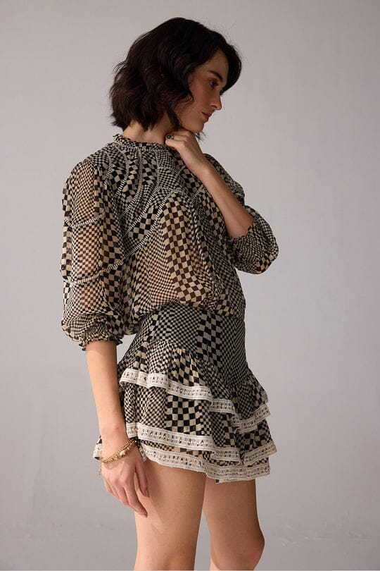 Add an edge to your wardrobe with our checkered printed mini skirt, featuring delicate lace detailing and layered, divided panels.
