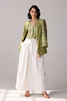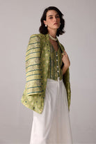 Make a statement with our viscose georgette jacket, featuring the signature Patola print and hand-embroidered sequin work all over.