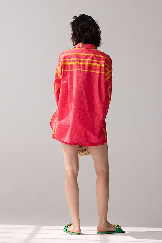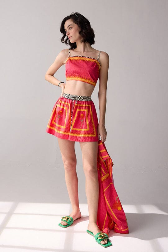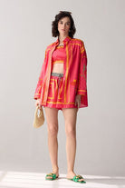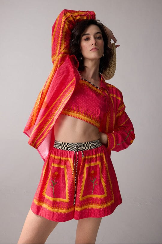 Spice up your casual style with this effortlessly cool co-ord set. Featuring a pink printed oversized shirt, a chic crop top, and matching shorts, this set blends relaxed comfort with playful style, perfect for an easygoing yet fashionable appeal.