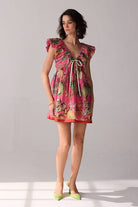 Here's a waist-cinched mini dress, adorned with a captivating print, perfect for making a statement wherever you go.