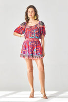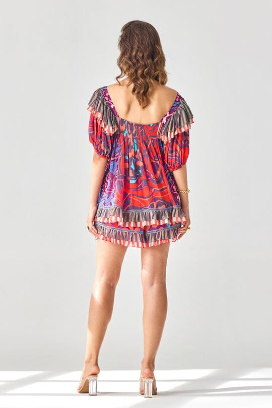 These printed viscose georgette shorts feature playful ruffle and lace detailing, blending comfort and style for effortless everyday statements.