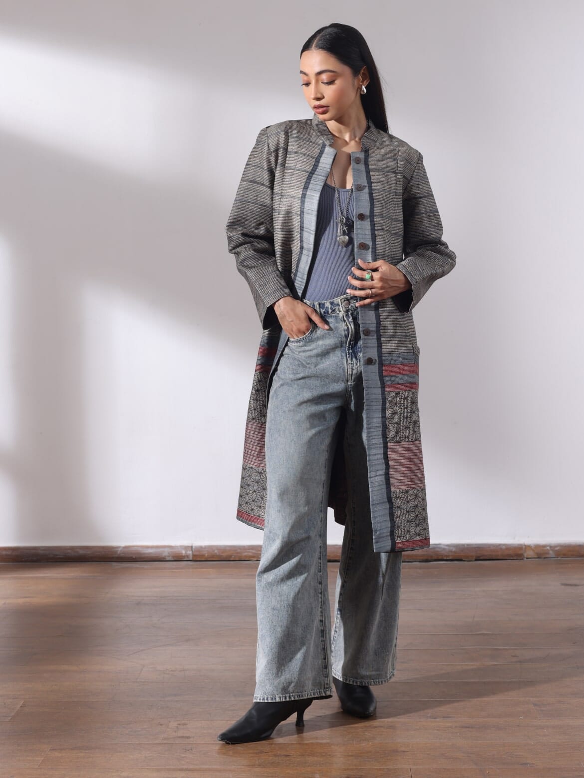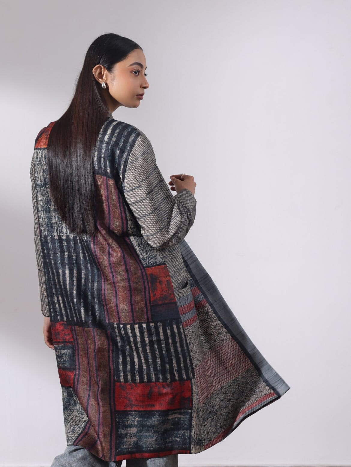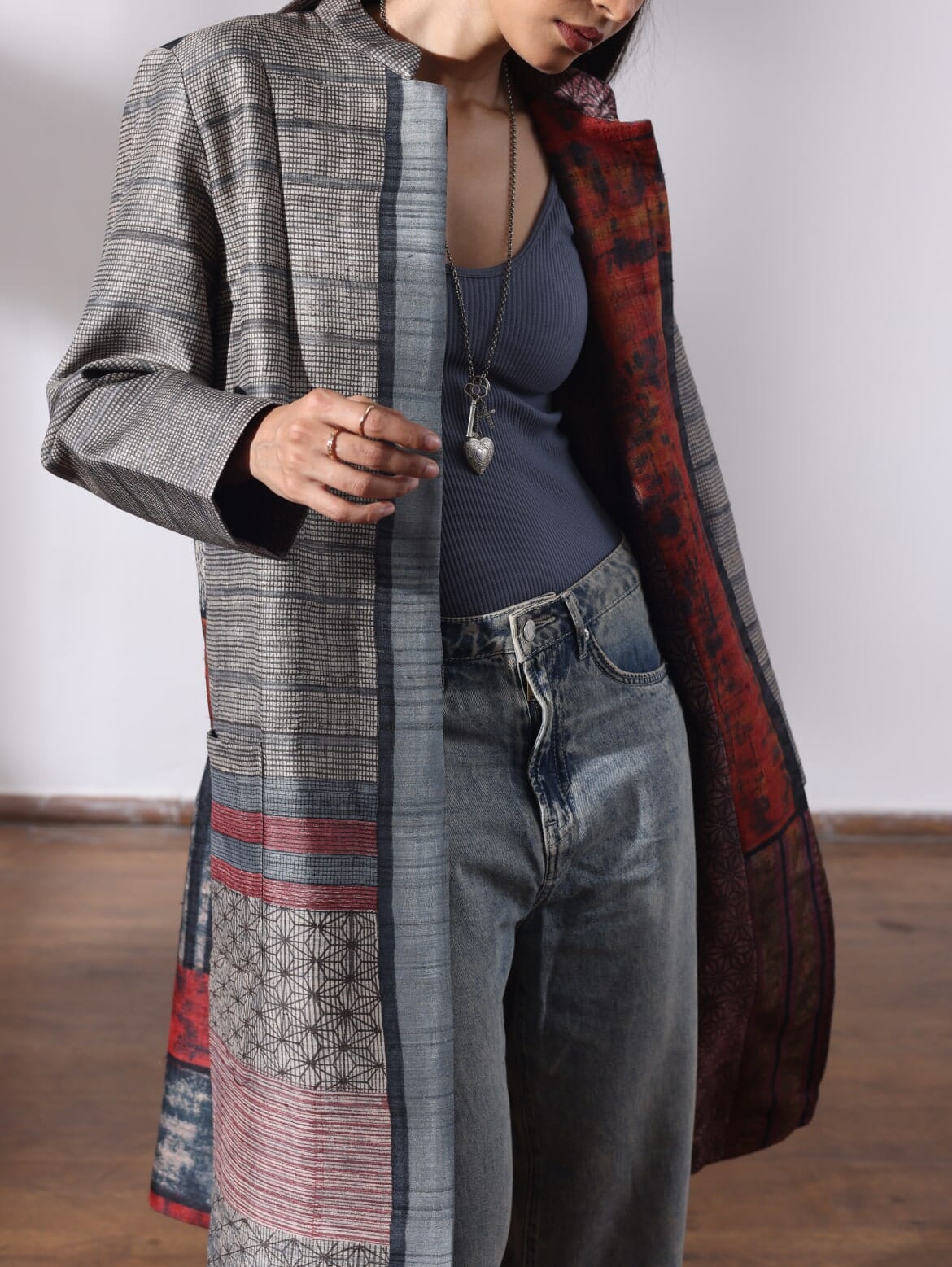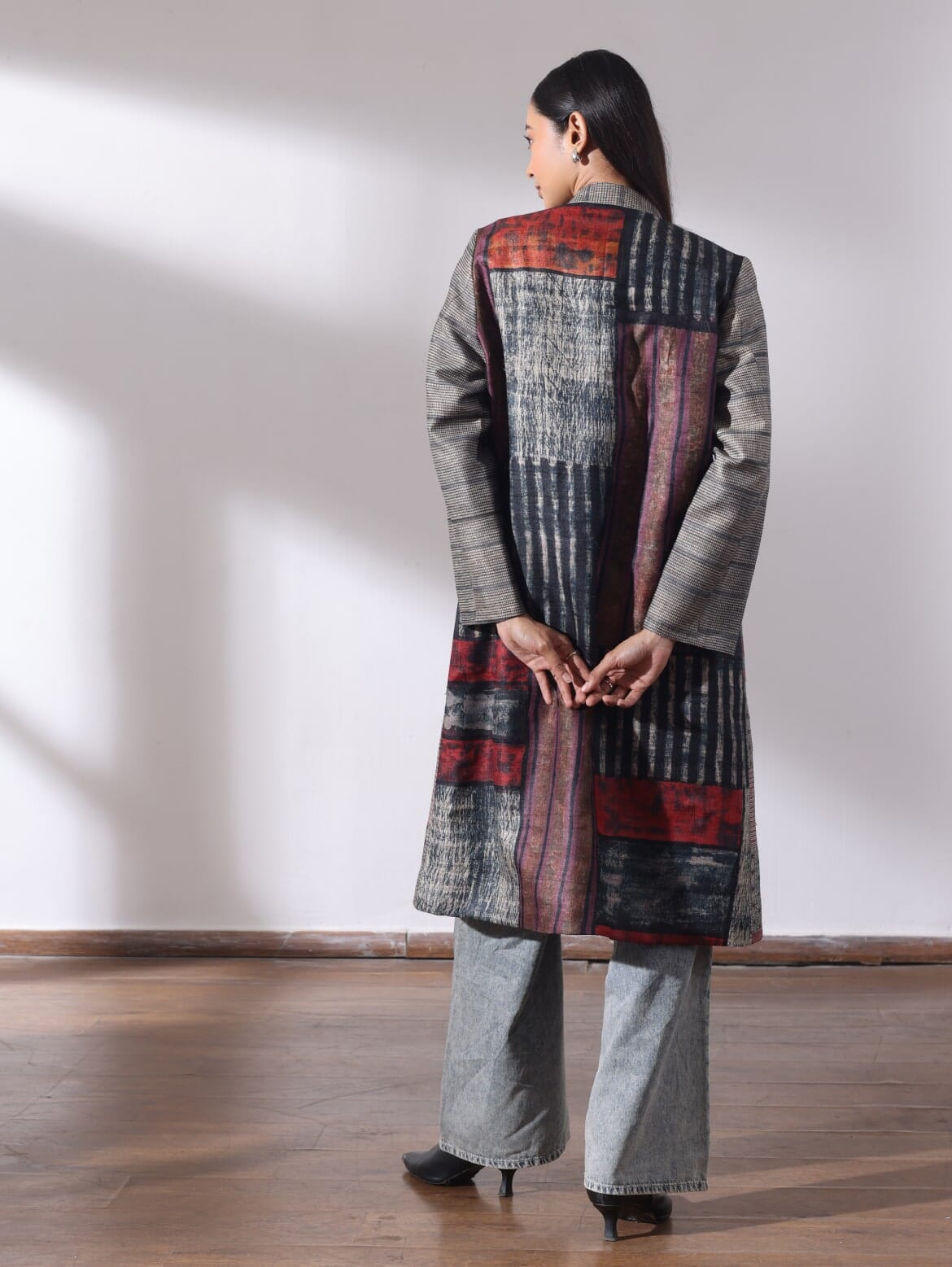 With subtle tones and bold craftsmanship, this tussar silk jacket showcases a beige base textured with precise stitch lines over block-printed geometric patterns. Grey accents add depth like shifting desert shadows, whilst a touch of red glows like embers at dusk, bringing warmth to its balanced palette.