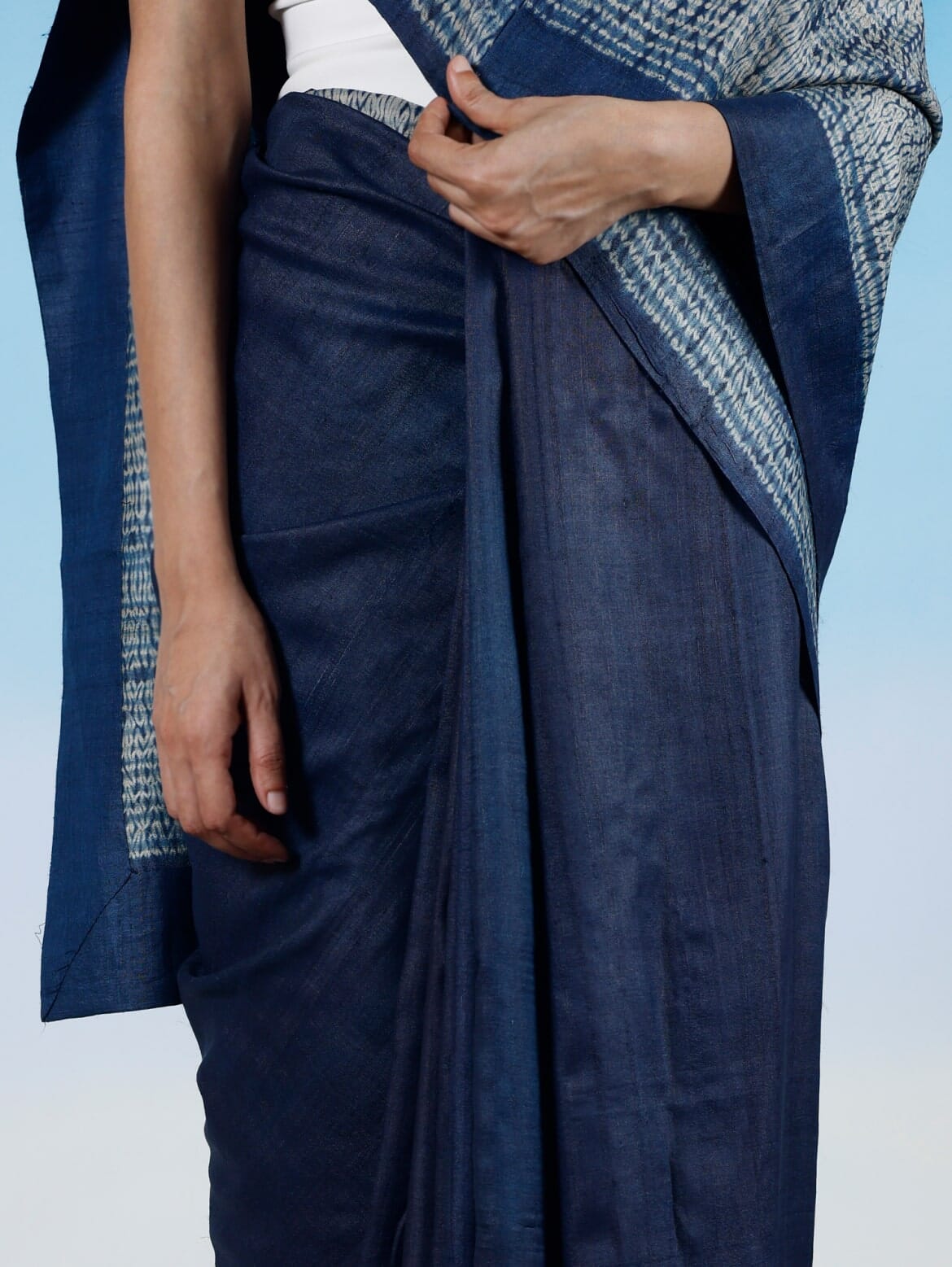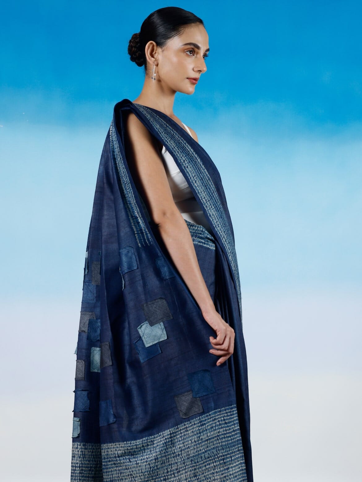 Natural indigo paints this Tussar sari in deep blue hues, embellished with Shibori and Patchwork techniques. The artisan creates fine parallel stitches that are pulled to create an area impermeable to the dye, resulting in organic, dotted stripes along the border and pallu. This elegant wood grain pattern is contrasted with a tactile collage of indigo dyed patchwork in the pallu.