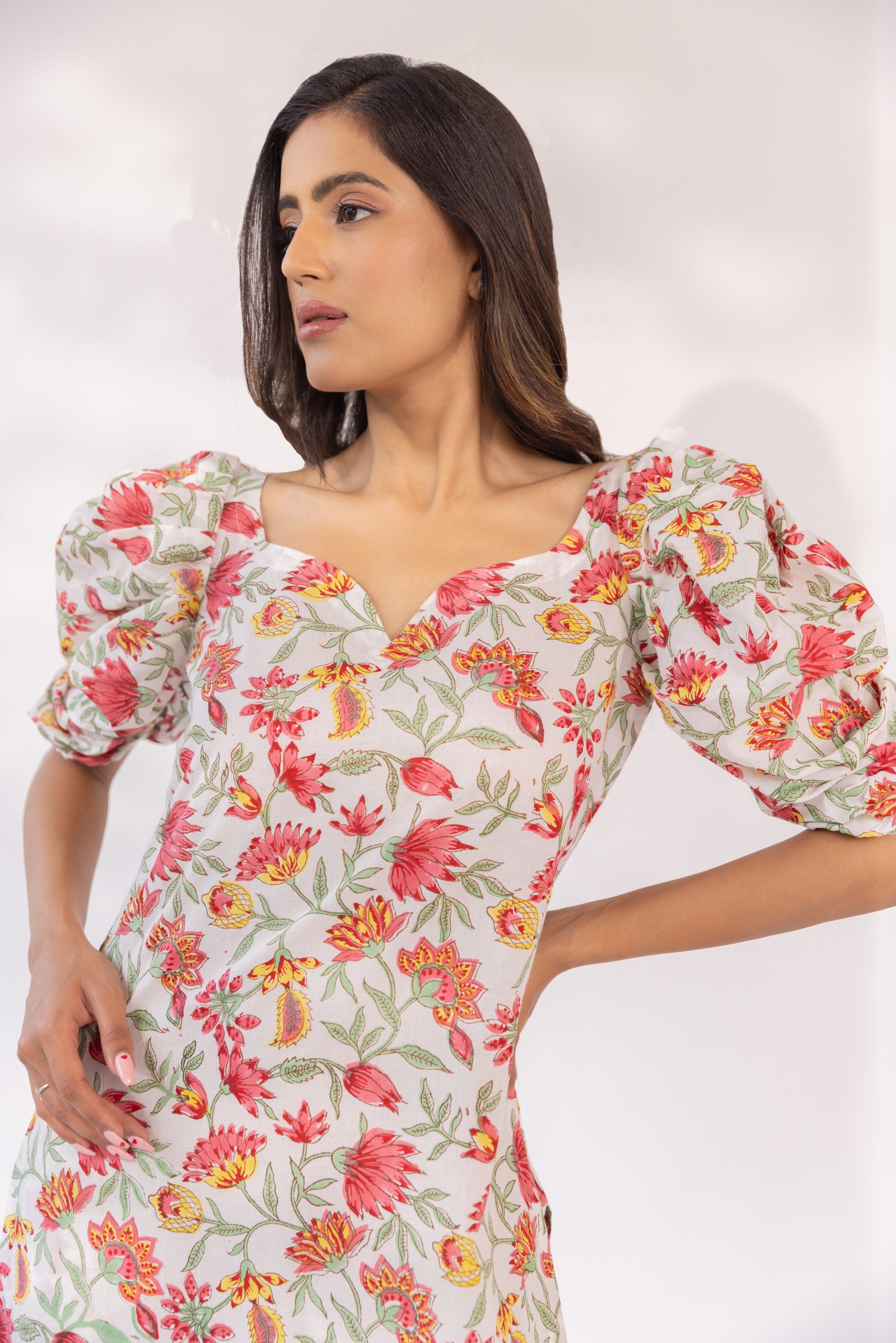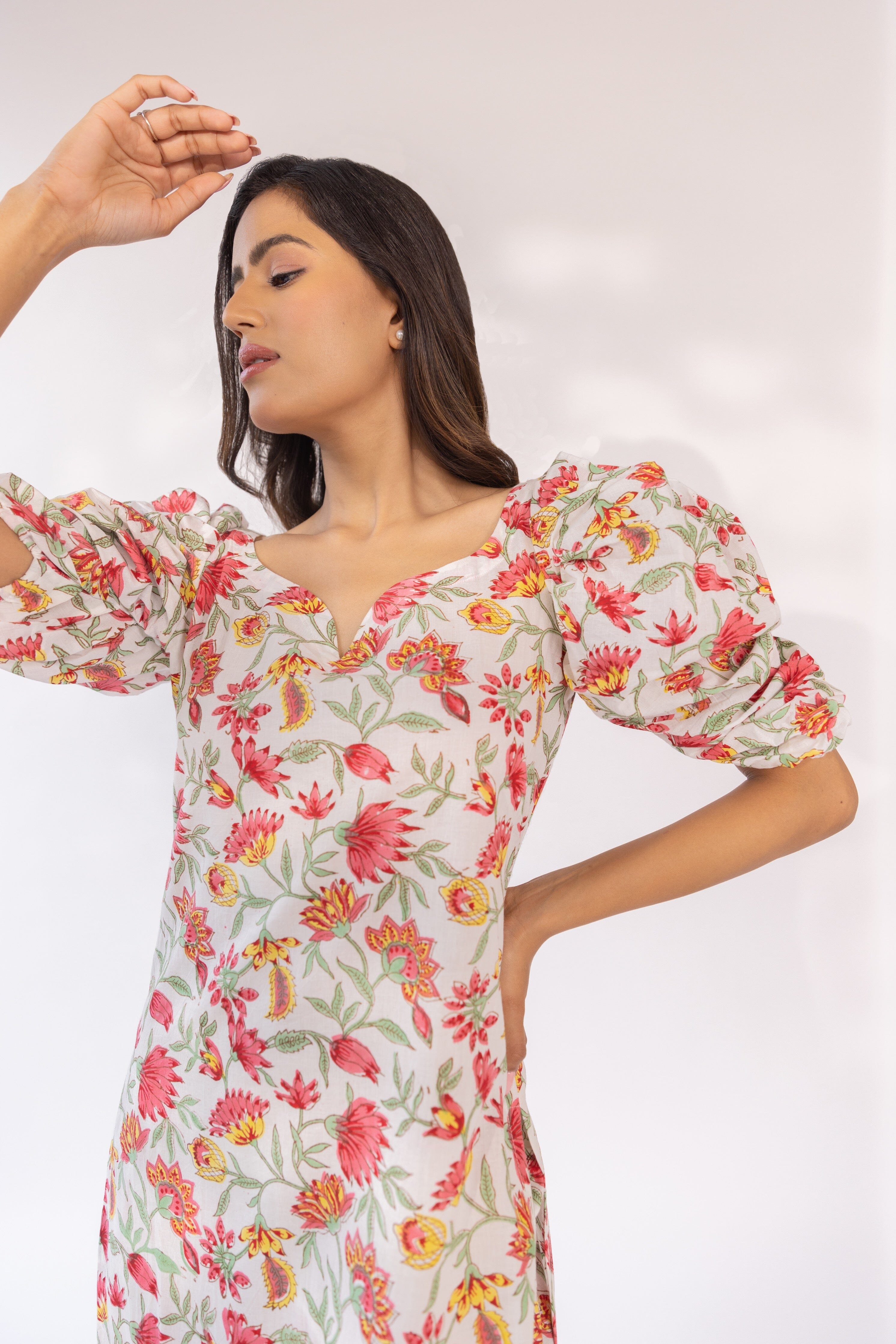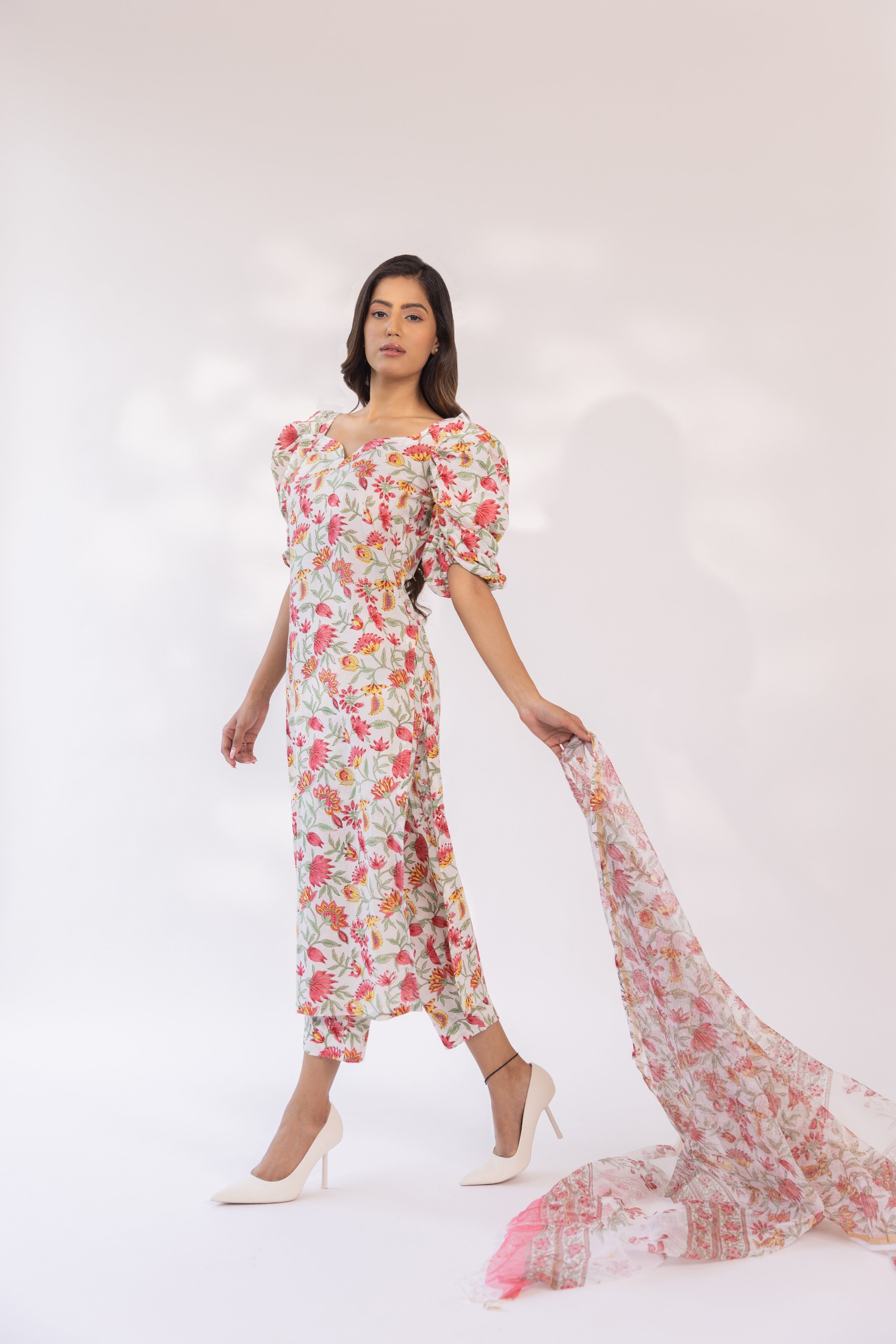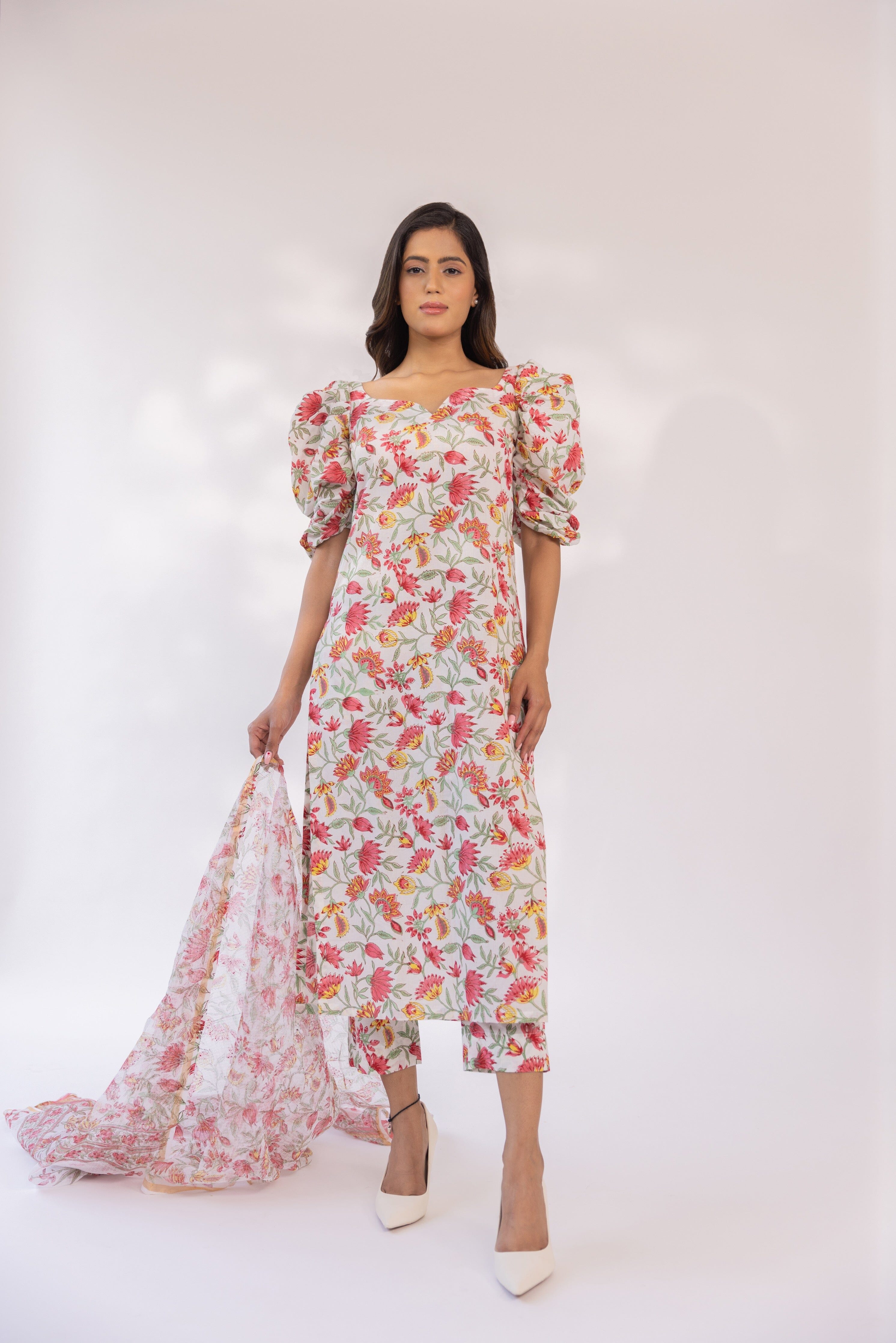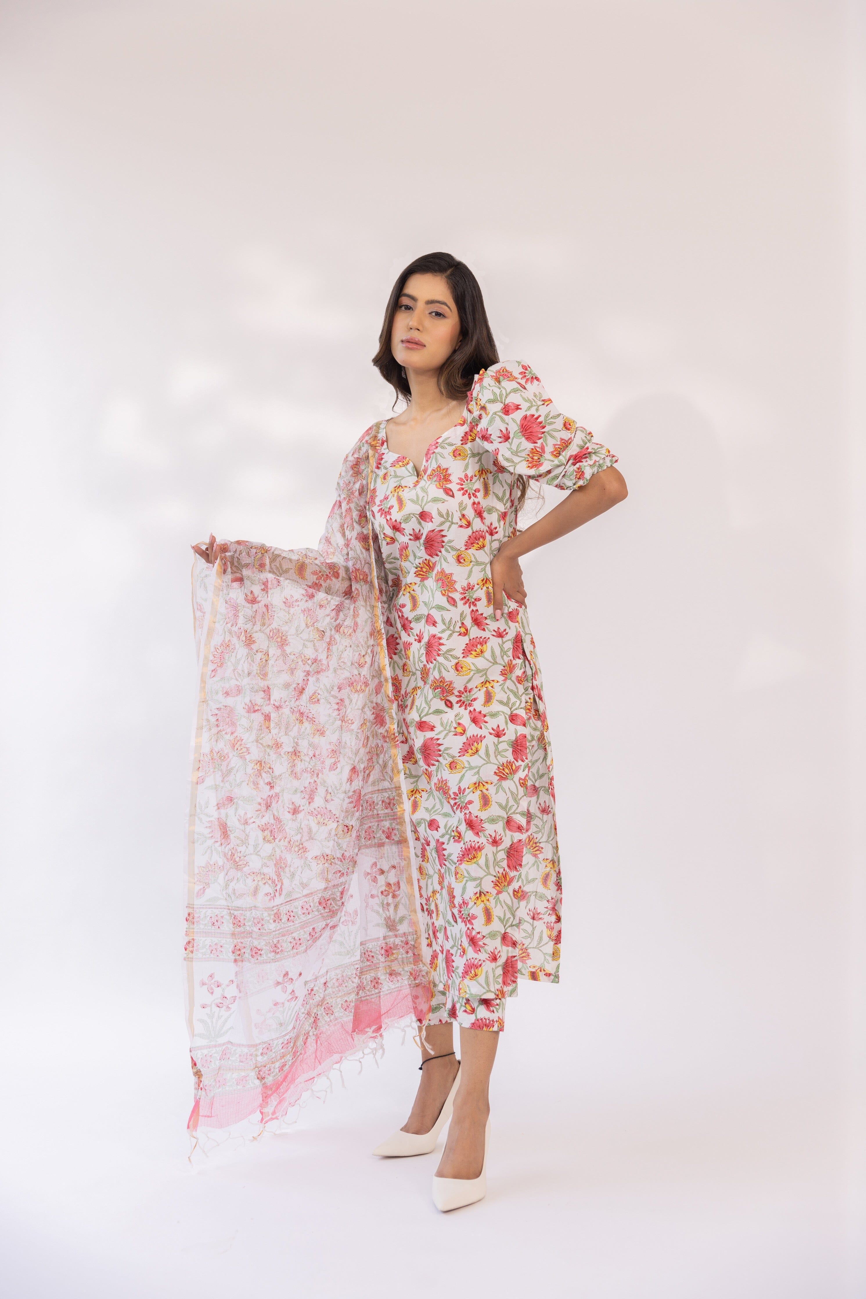 CONJUNTO KURTA AMOLI CON ESTAMPADO DE BLOQUES Y DUPATTA