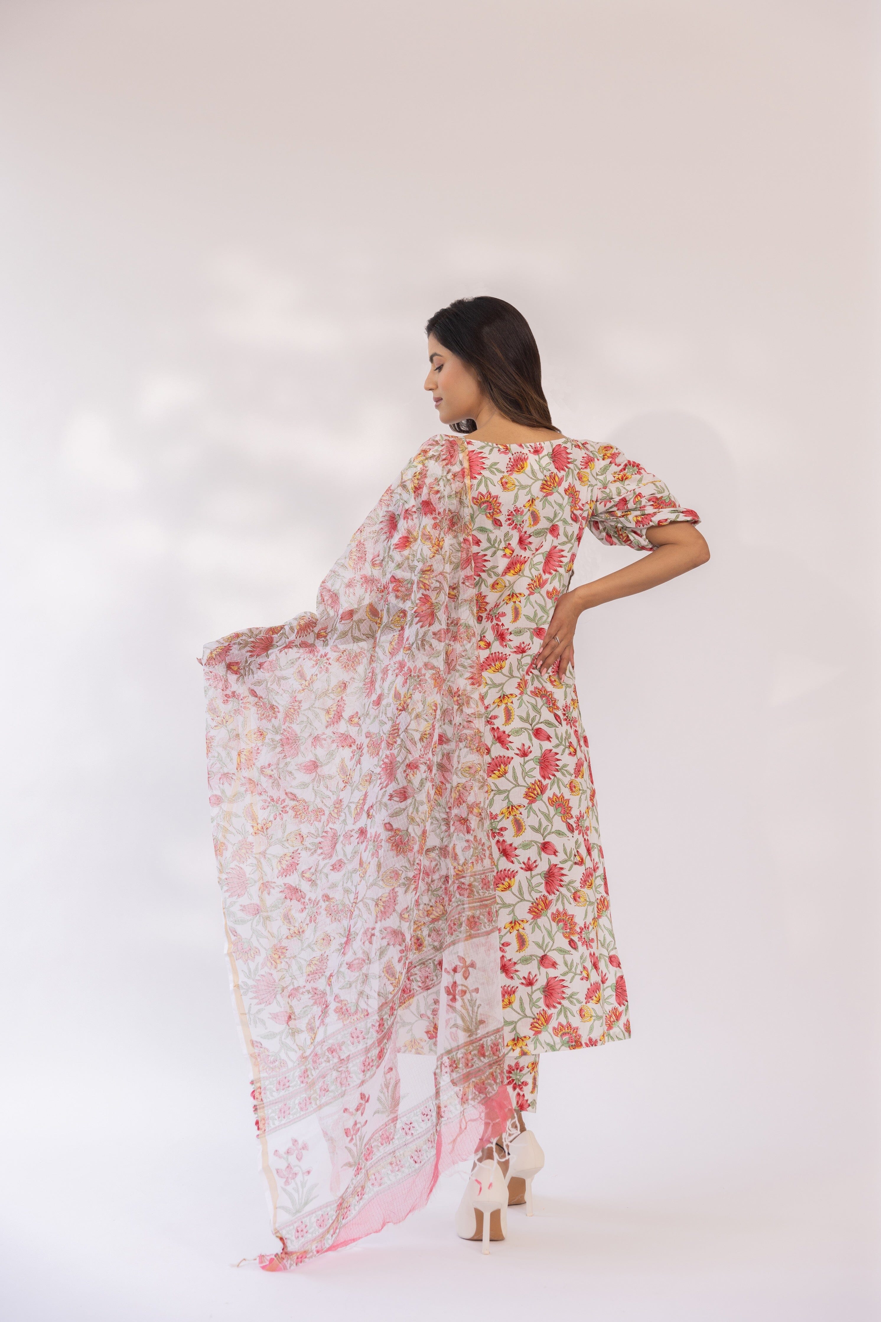 Con un conjunto de kurta con estampado de bloques en base de algodón, detallado con escote en forma de corazón y manga estilo capucha, combinado con pantalones a juego y dupatta cottadoria.