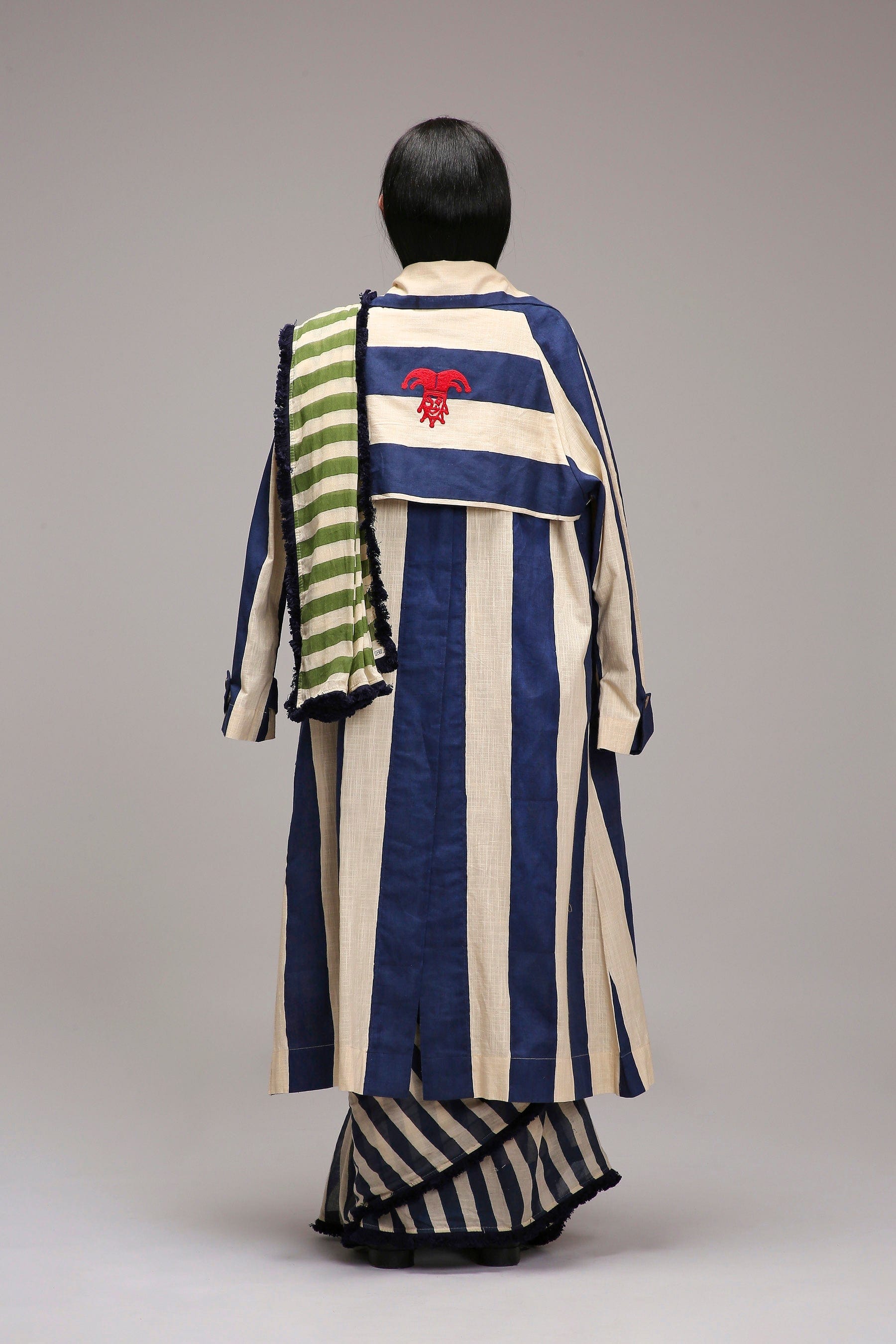 Crafted from handwoven cotton with hand-block prints, this set pairs a smocked bodysuit with a soft mul cotton saree. The saree features intricate block printing and fringed tassels, while the fitted bodysuit offers ribbed detailing for a snug fit. Comes with a joker trench jacket from the collection for a complete, layered look.