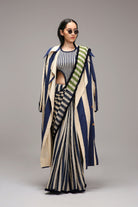 Egg-Shell Bodysuit with Trench & Dual Striped Saree Set (3 PCS)