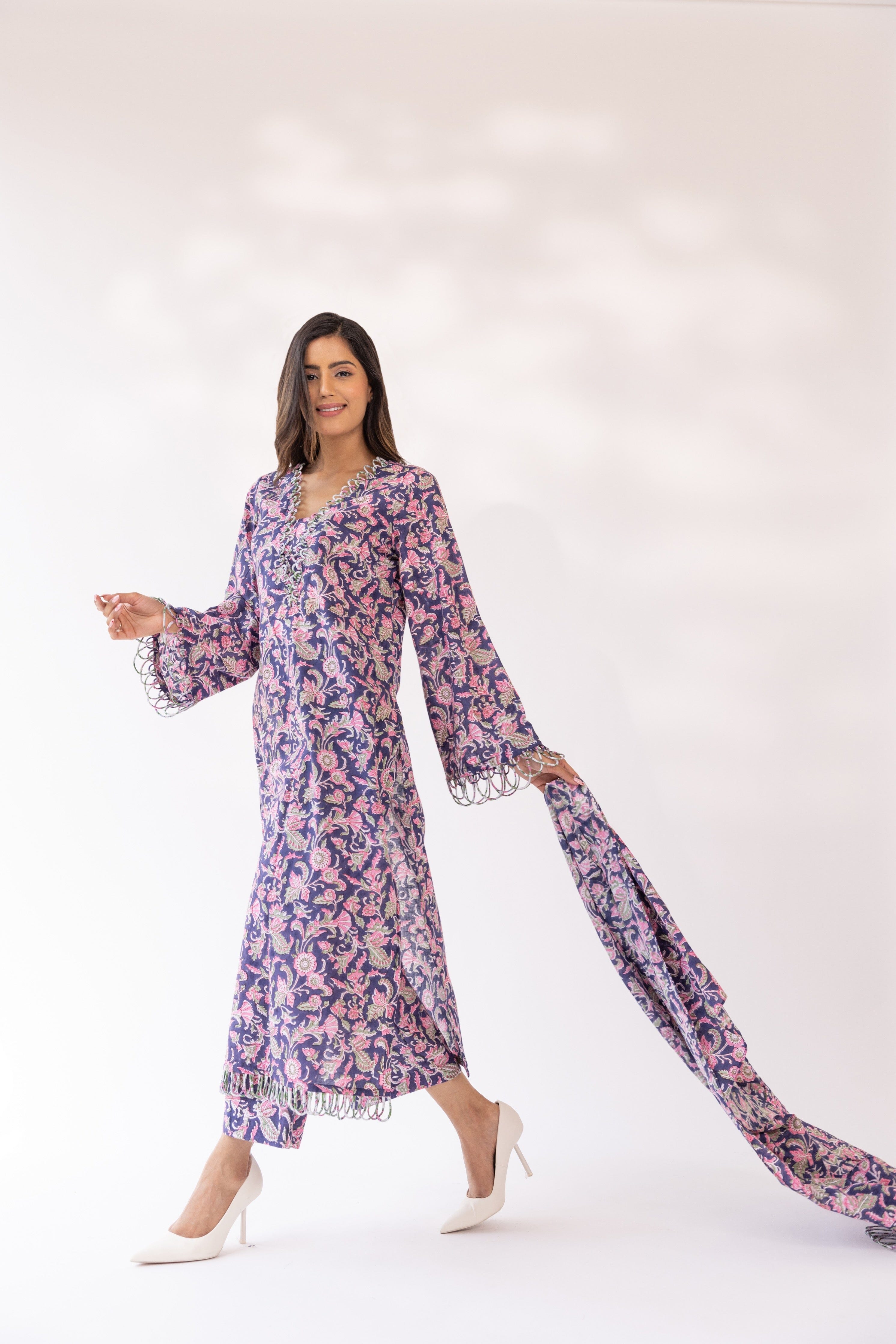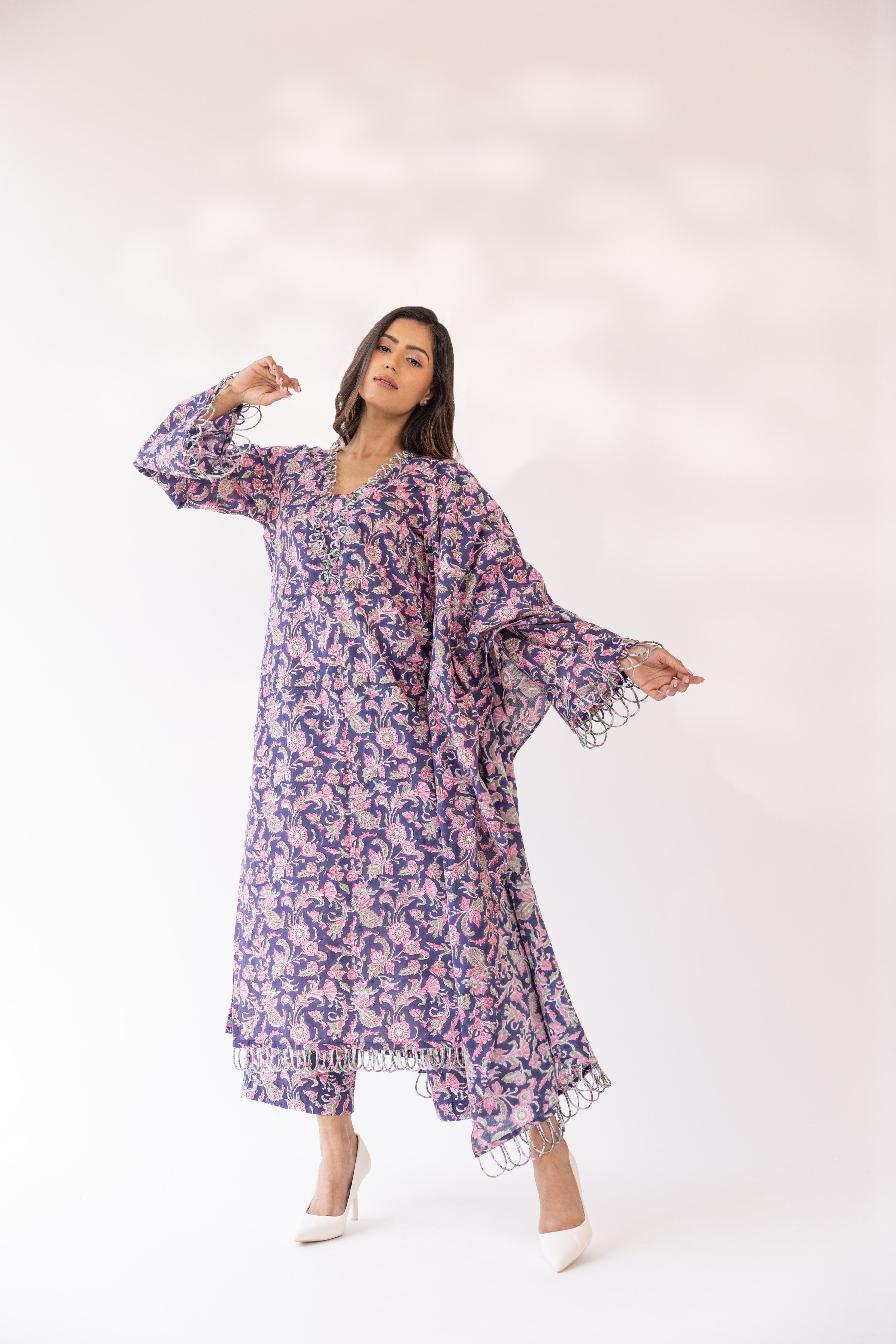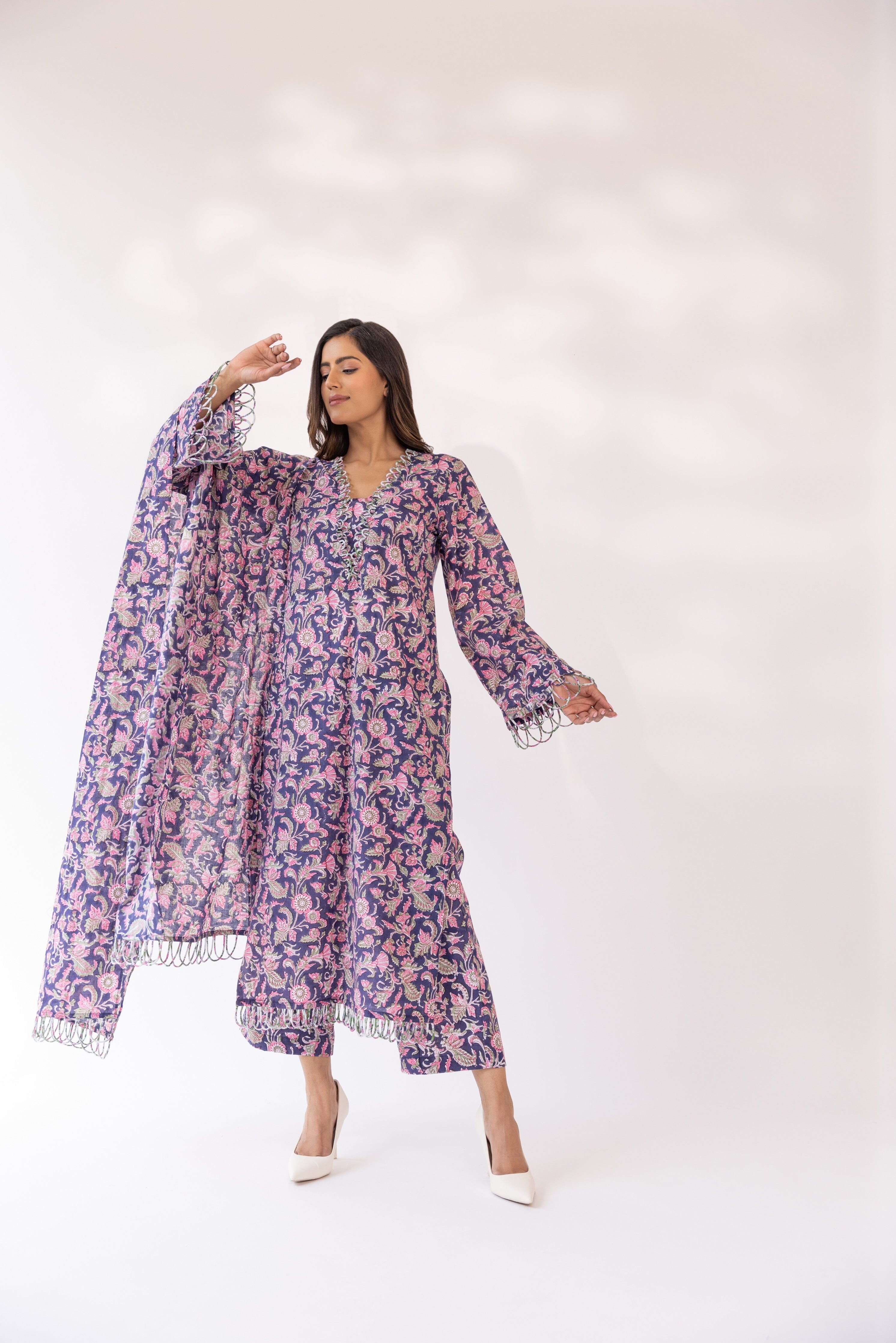 Con una kurta morada con base de algodón detallada con bordes festoneados, combinada con pantalones y dupatta a juego.