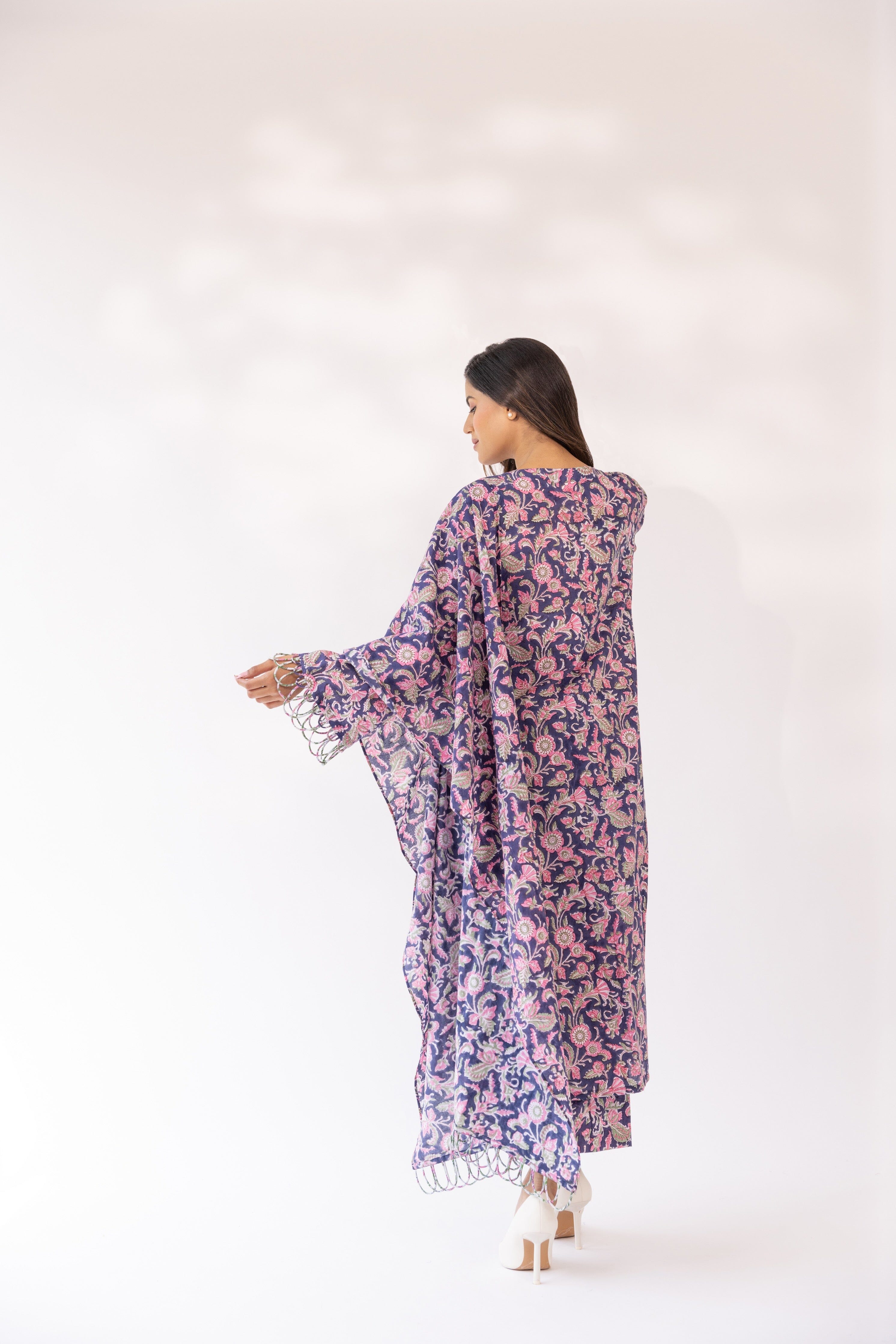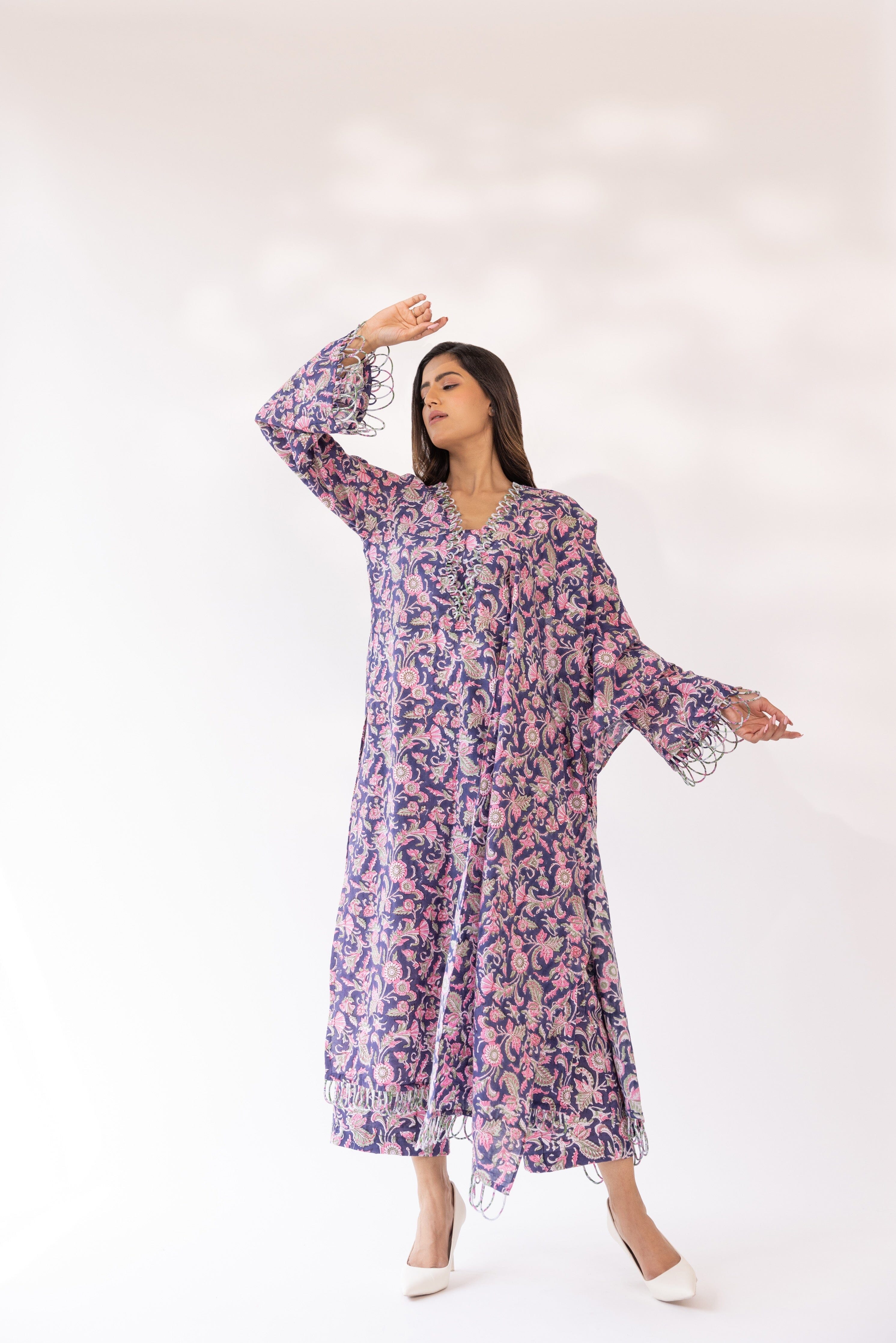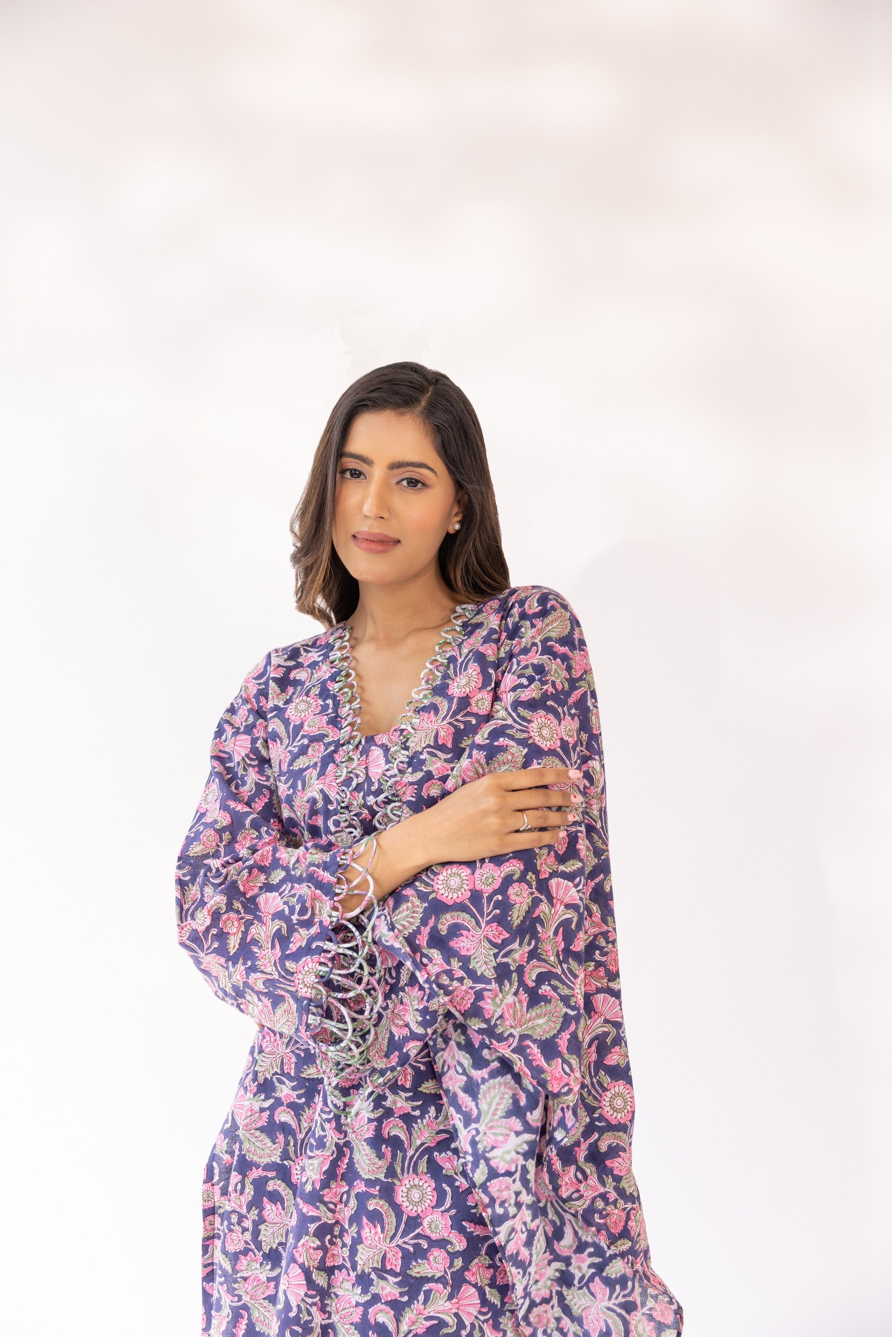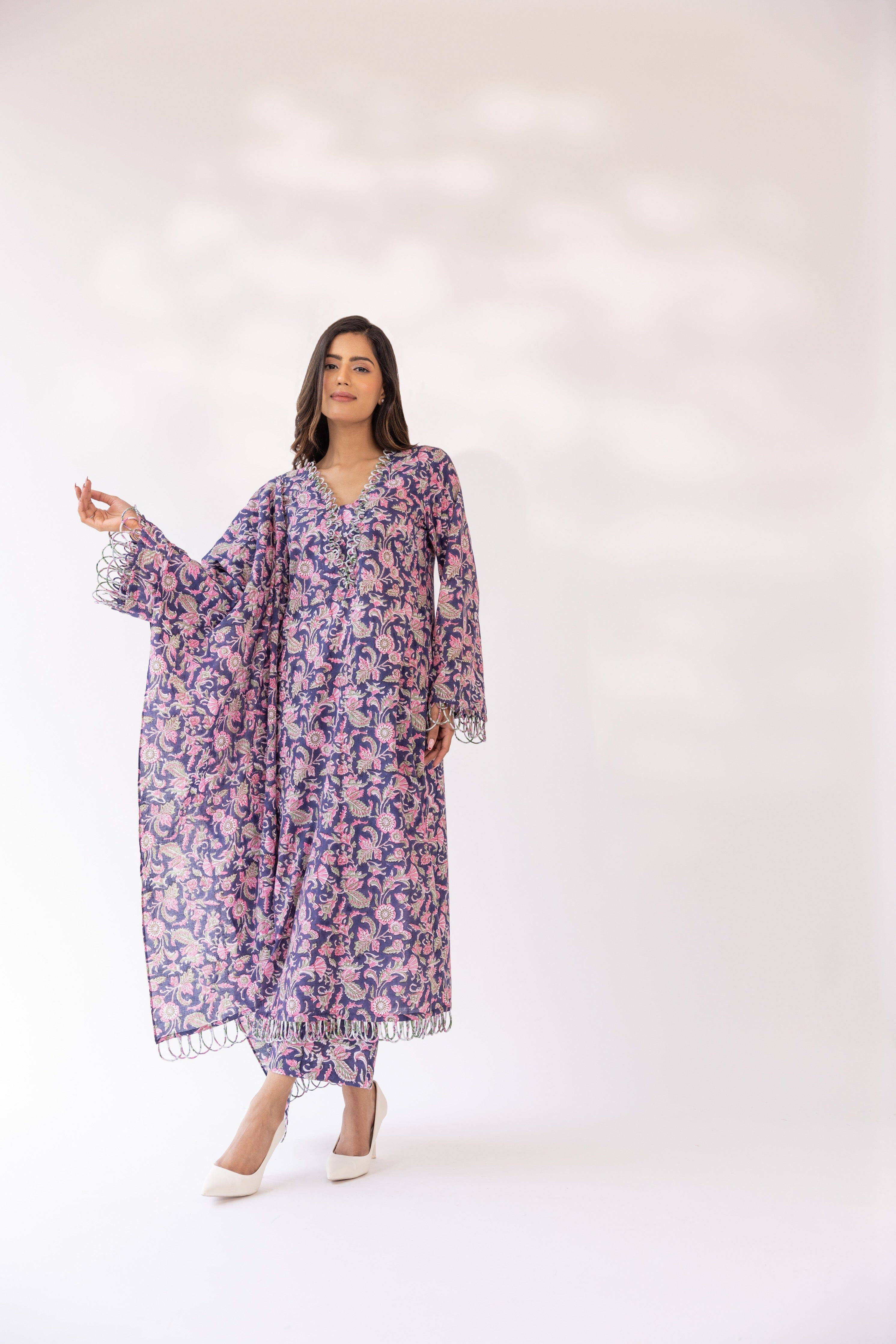 Con una kurta morada con base de algodón detallada con bordes festoneados, combinada con pantalones y dupatta a juego.