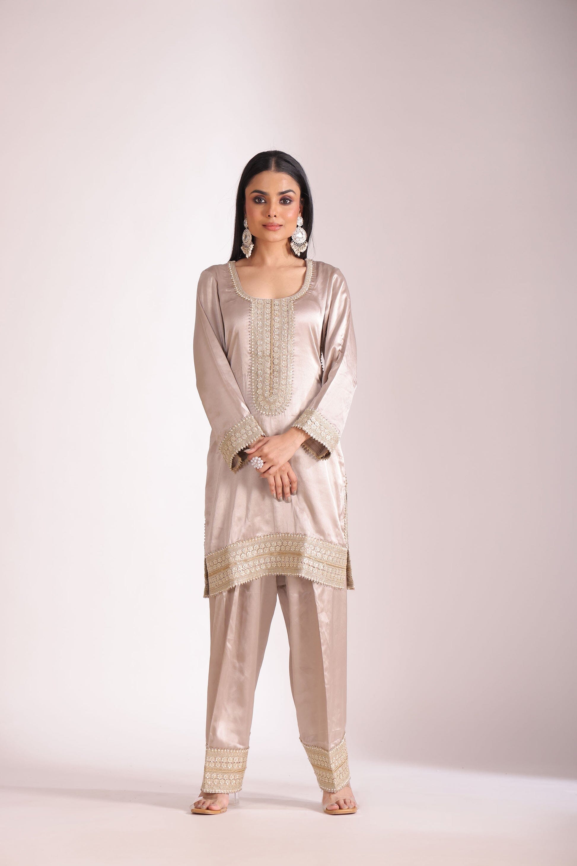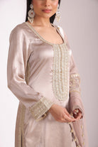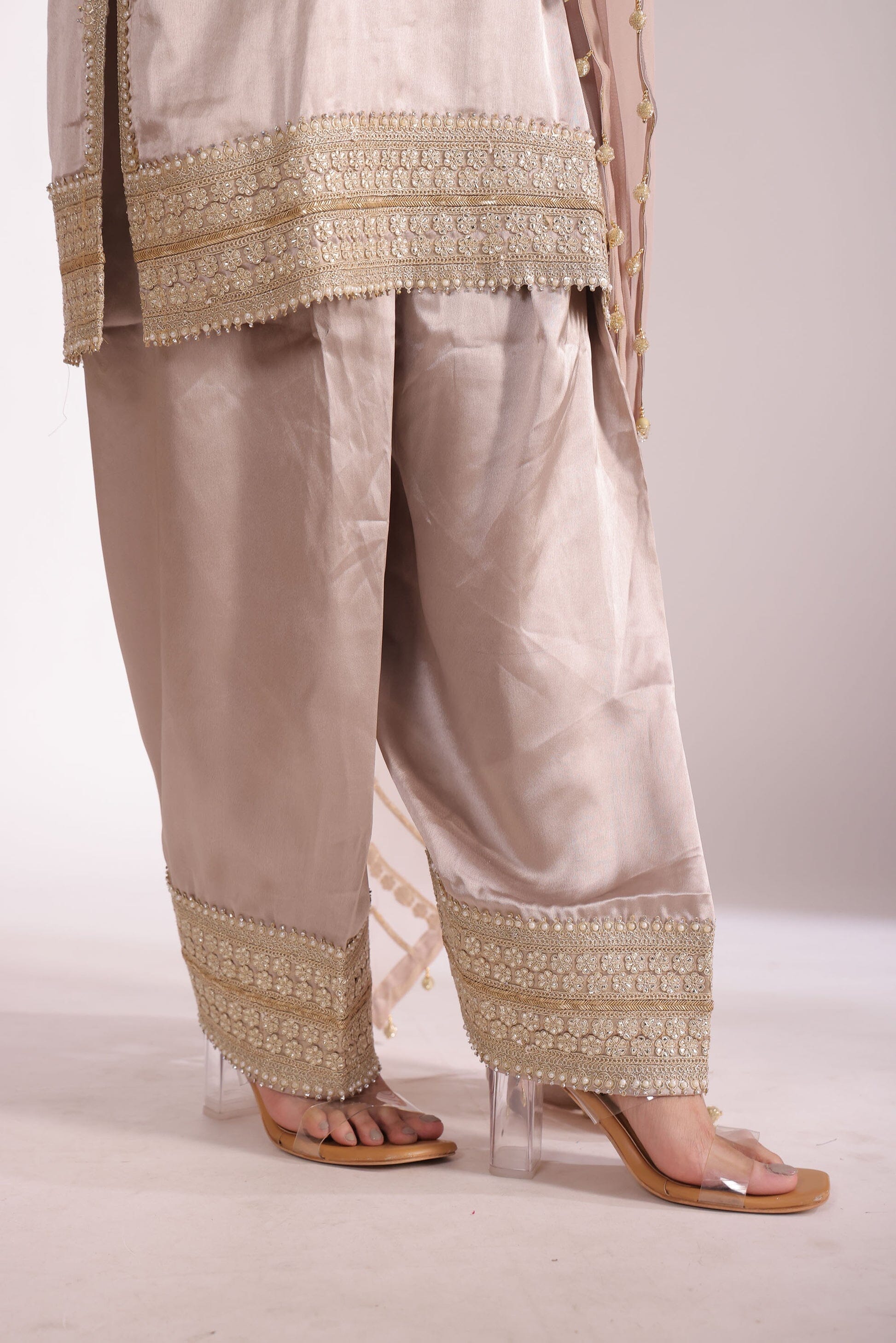 This three piece set includes Kurta with Farsi Salwar and Dupatta Beige Kurta with defined neckline with work detailing along with detailed work on the hem of sleeves and kurta and fasrsi salwar facing with gota and embroidered tappings on the neckline and sleeves. Beige Farsi Salwar. Beige Net sequins embroidered dupatta with drops finishing.