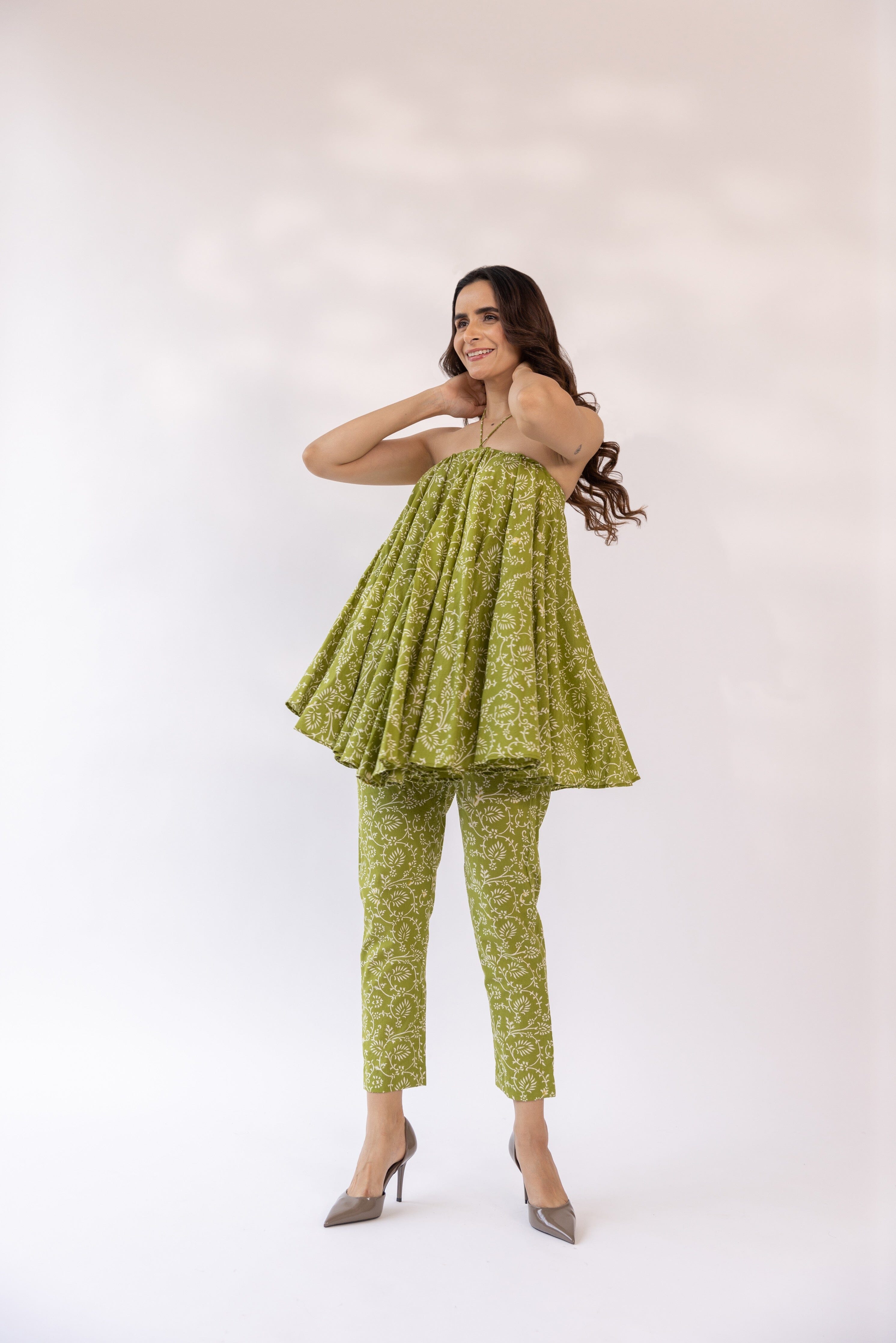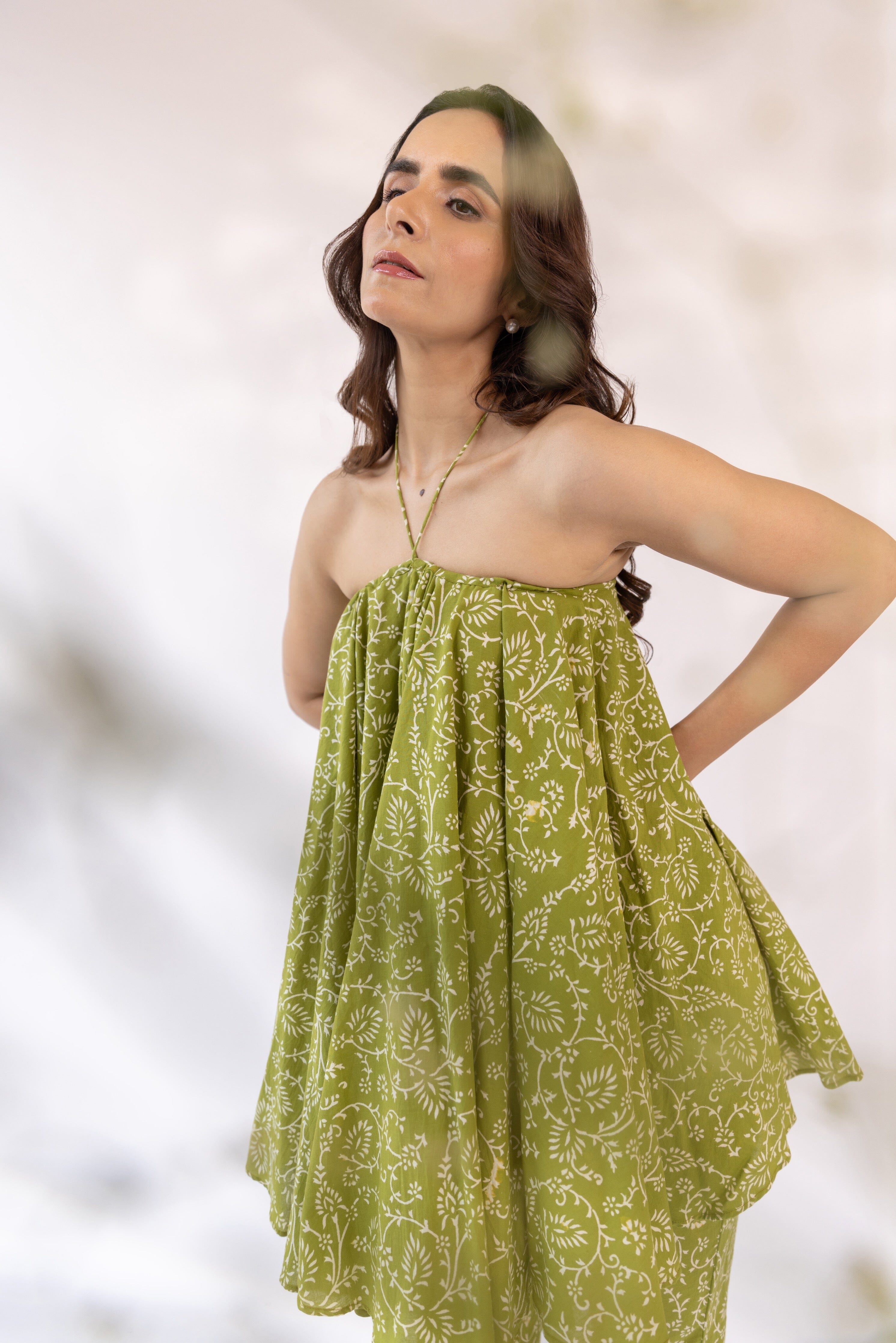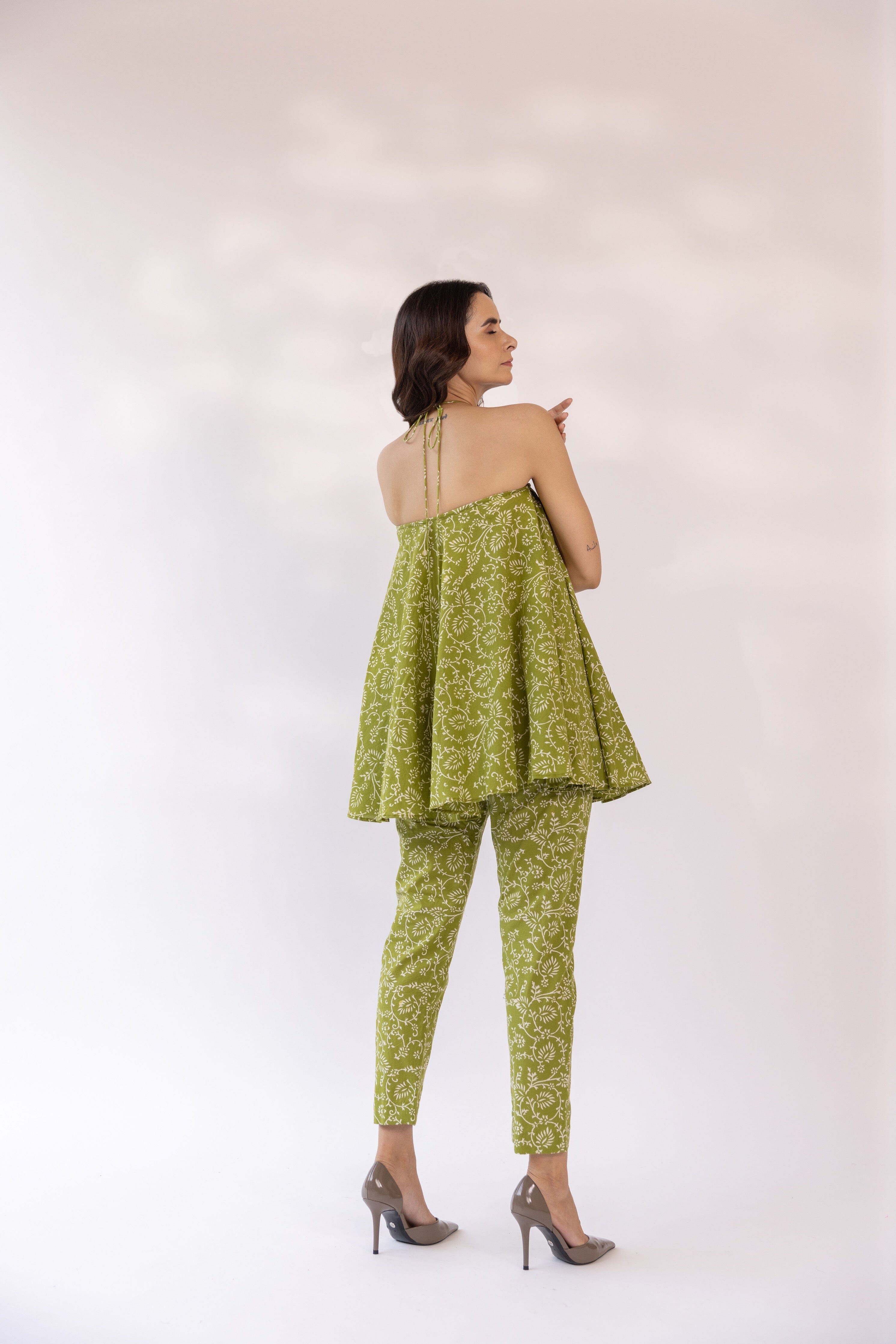 Con un conjunto de kurta halter con estampado de bloques verdes, combinado con pantalones de corte recto.