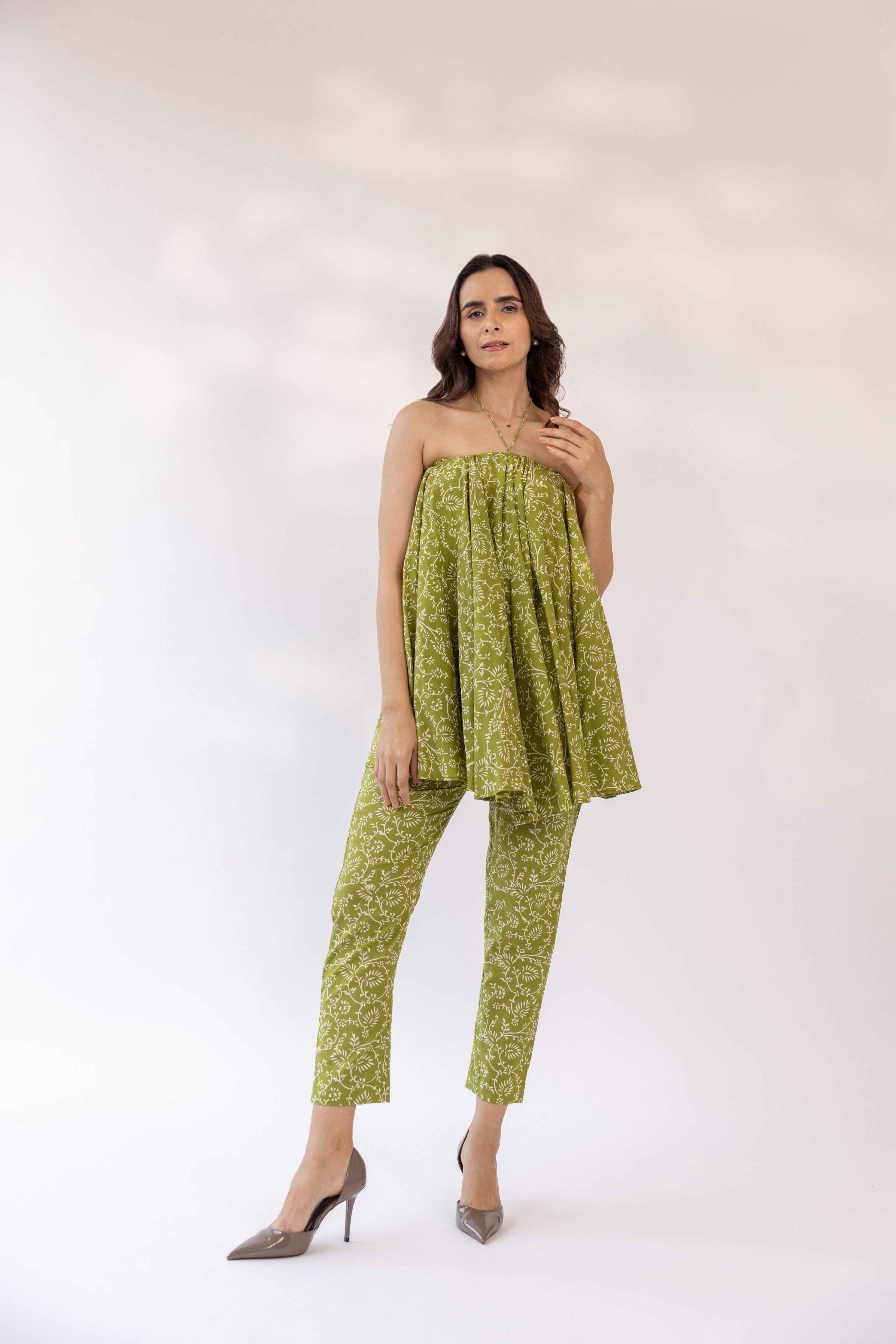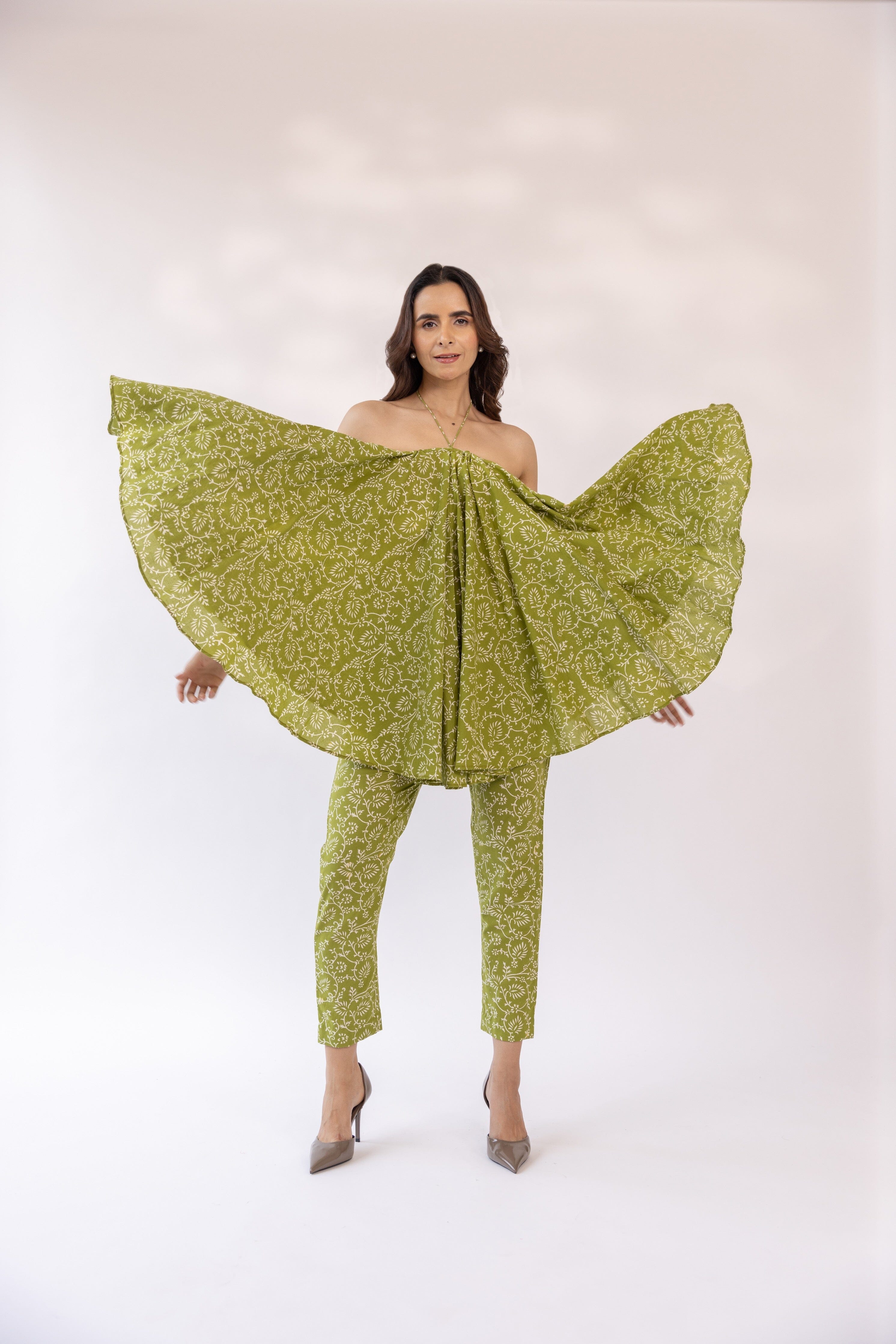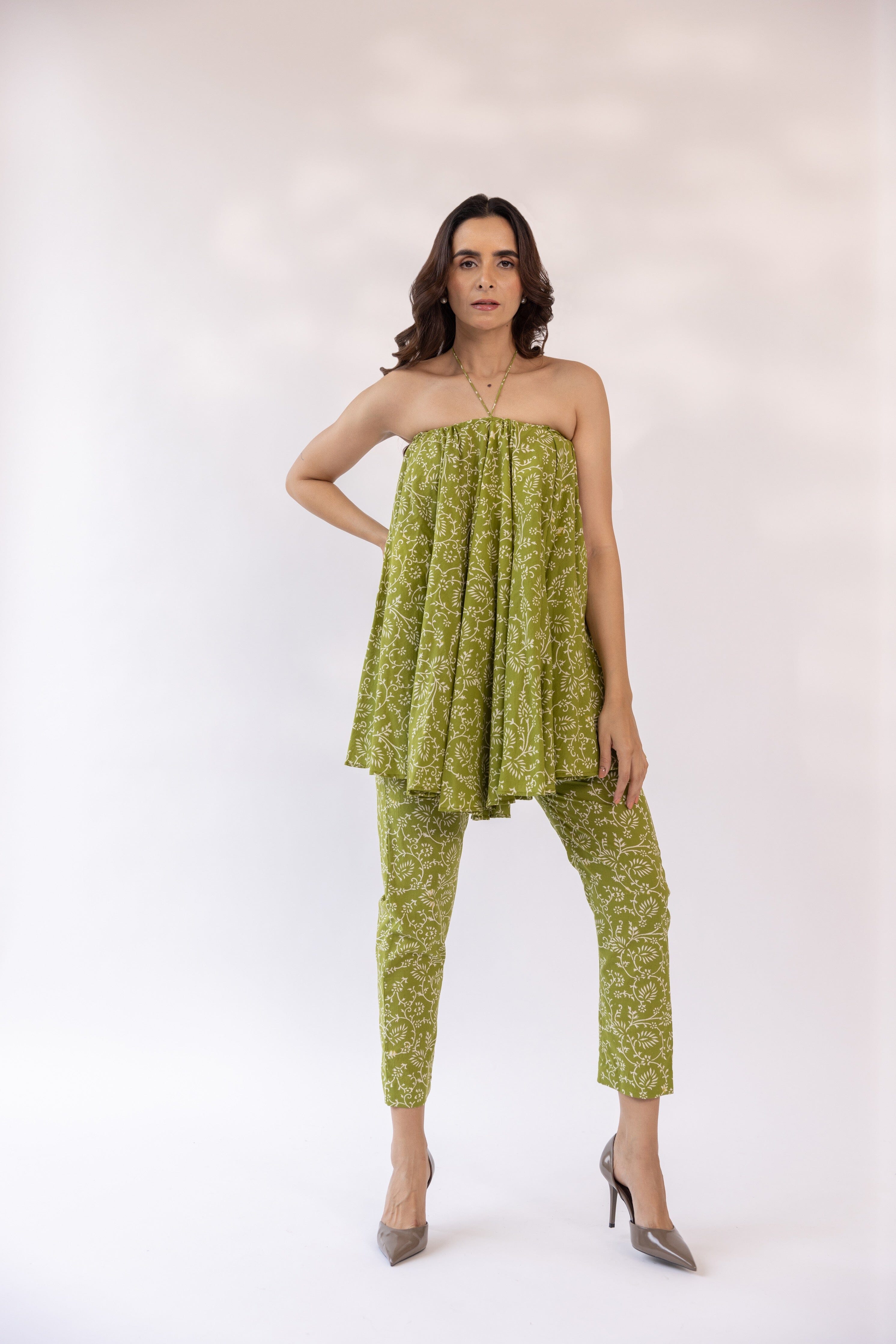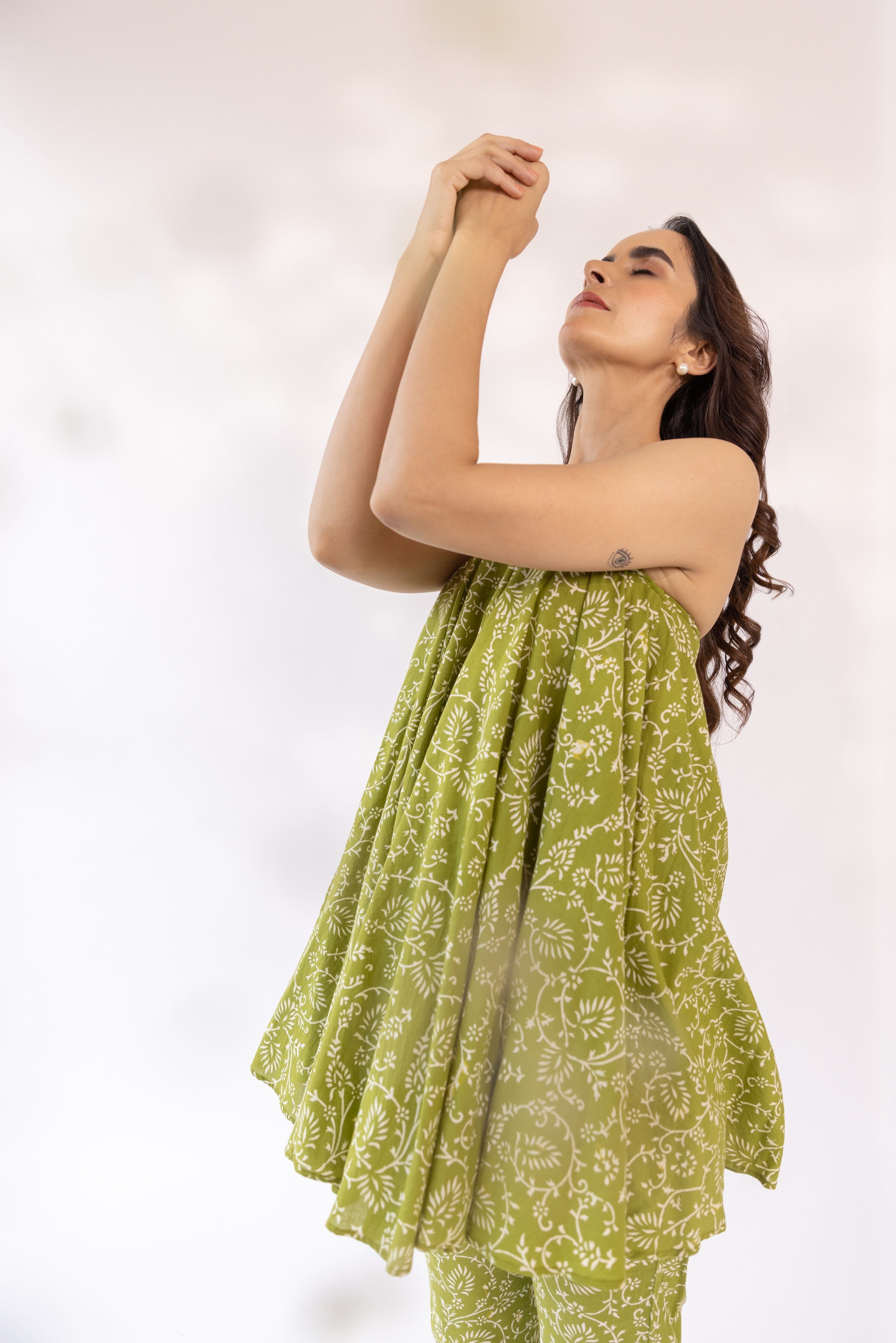 Con un conjunto de kurta halter con estampado de bloques verdes, combinado con pantalones de corte recto.