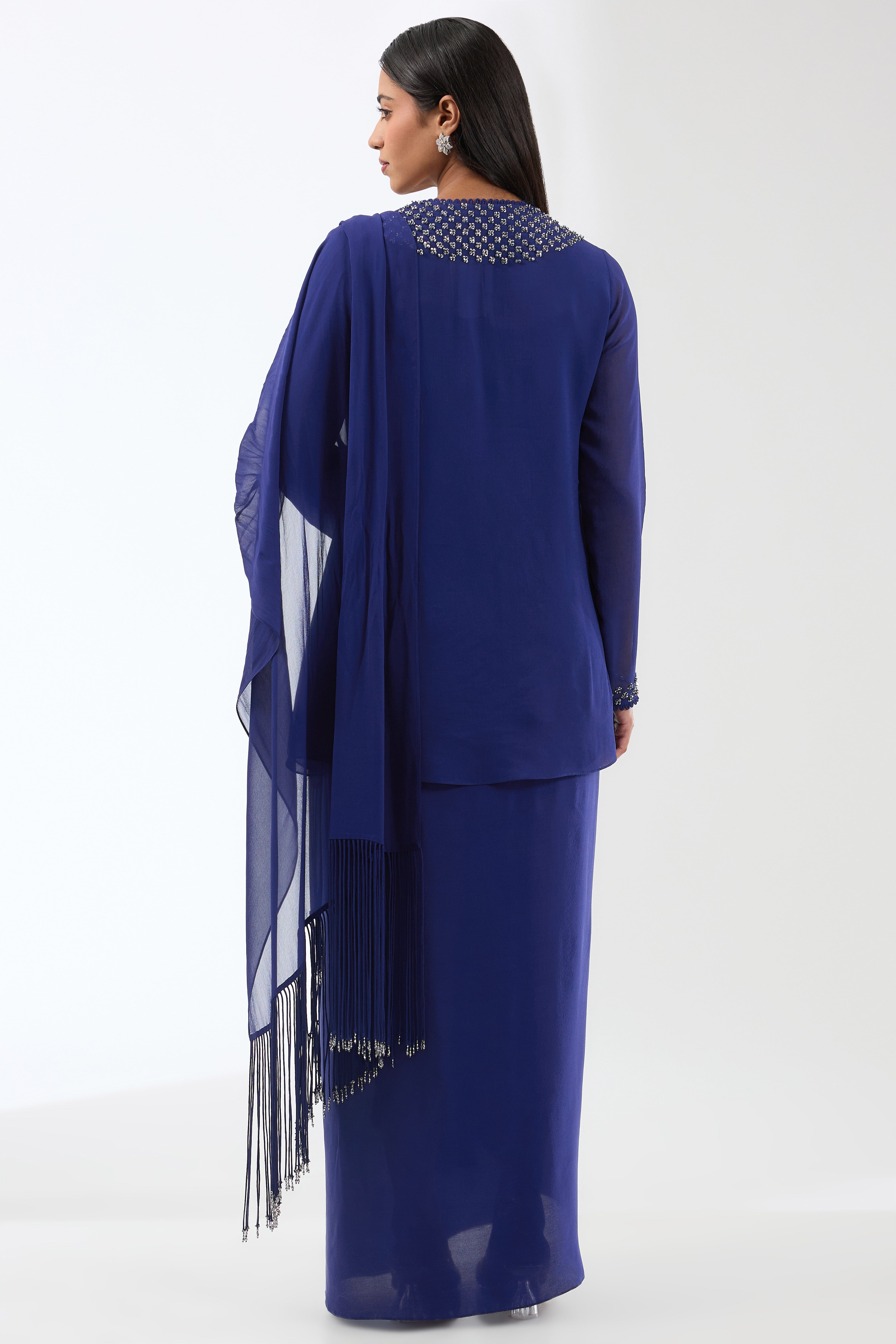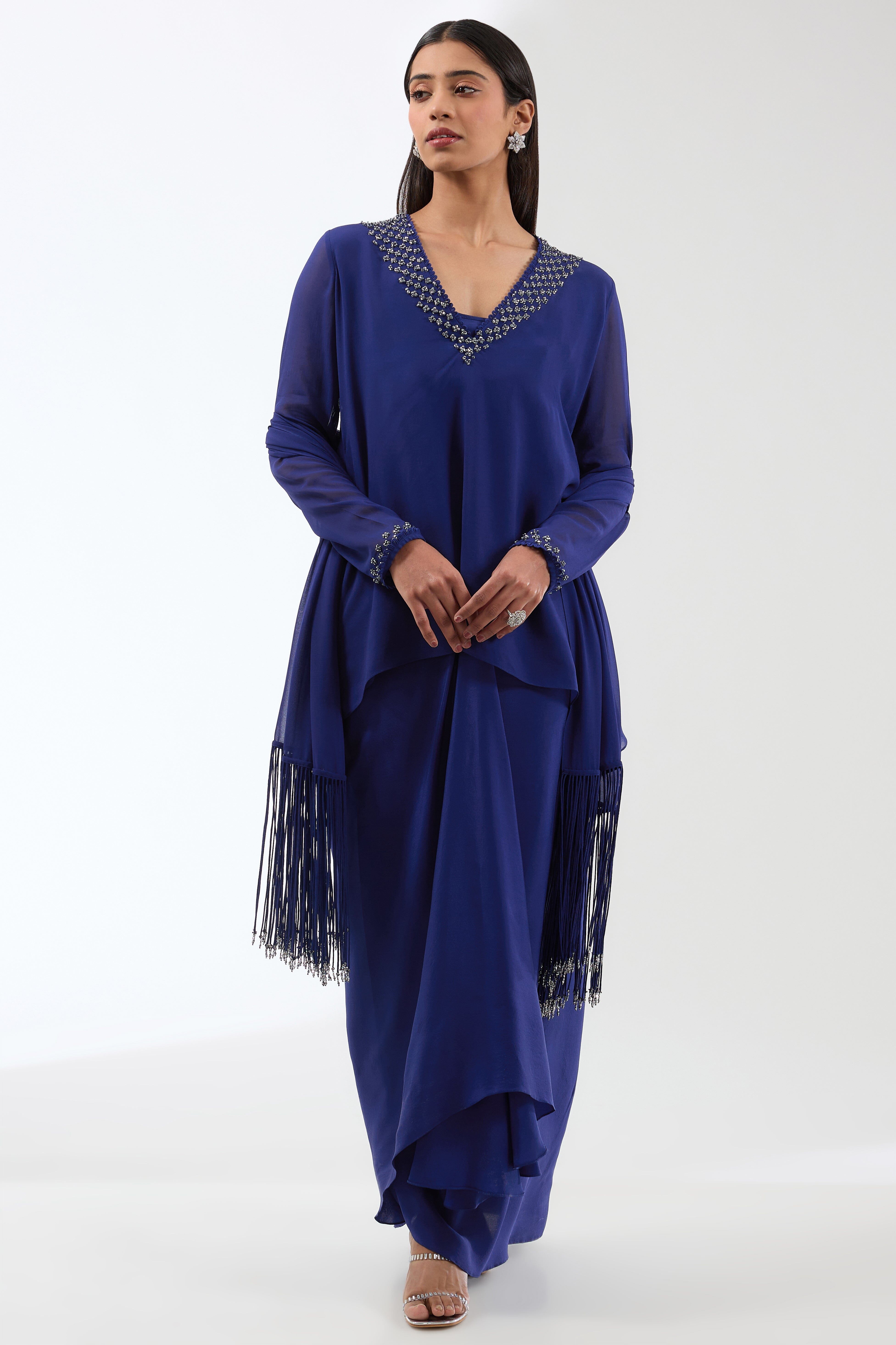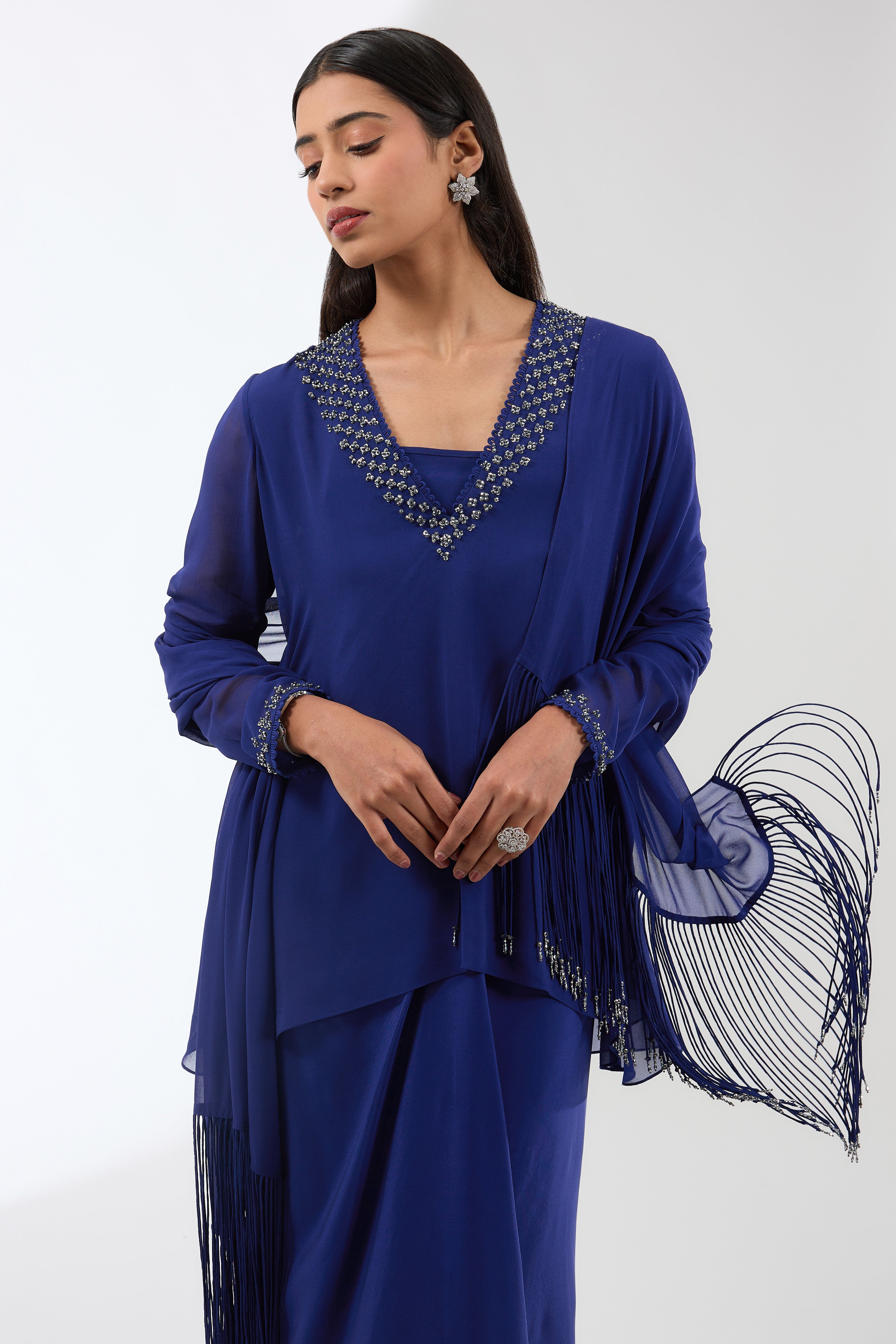 Shimmering sequins and czech beads hand embroidered on this tunic, paired with a draped skirt and tasseled stole.