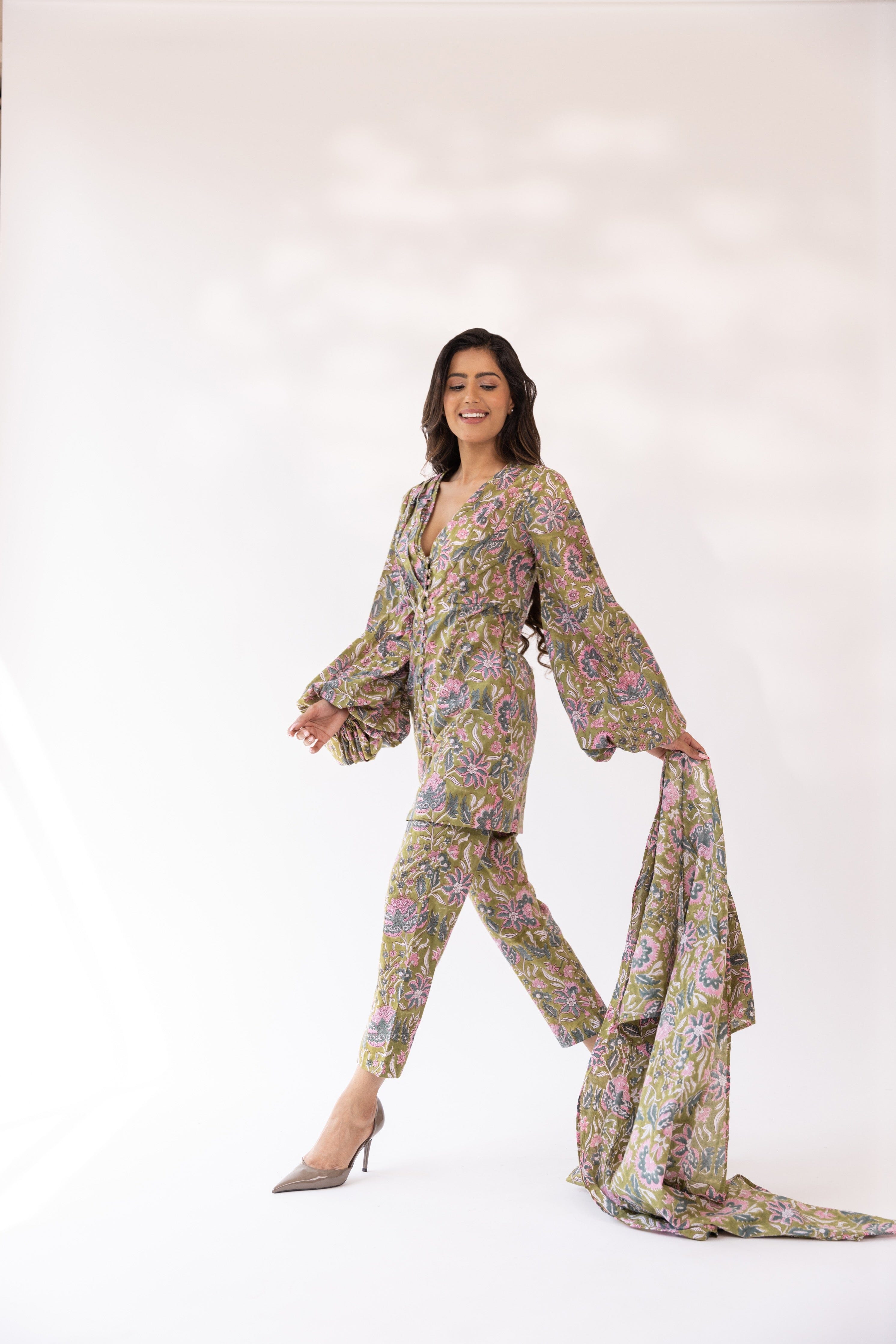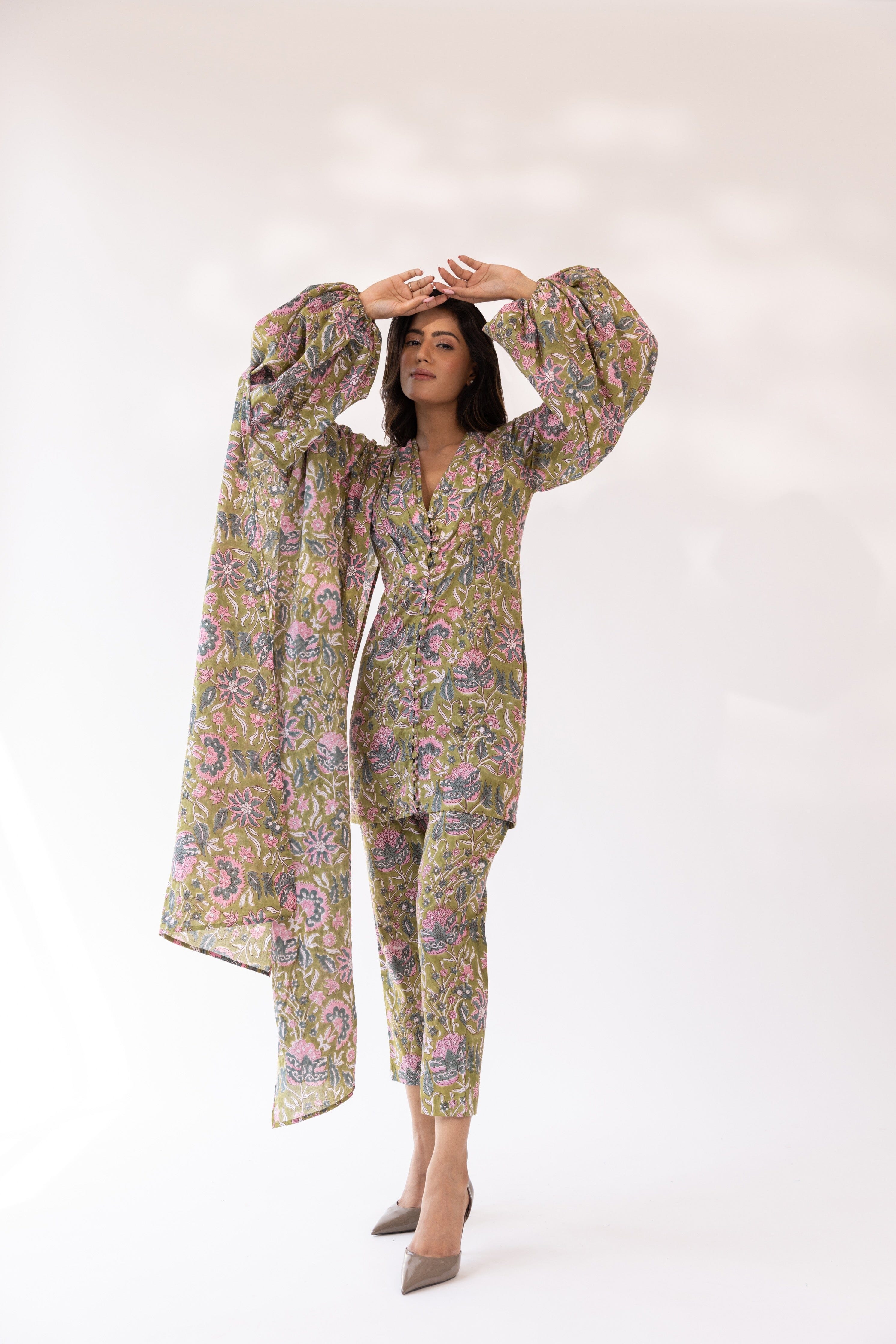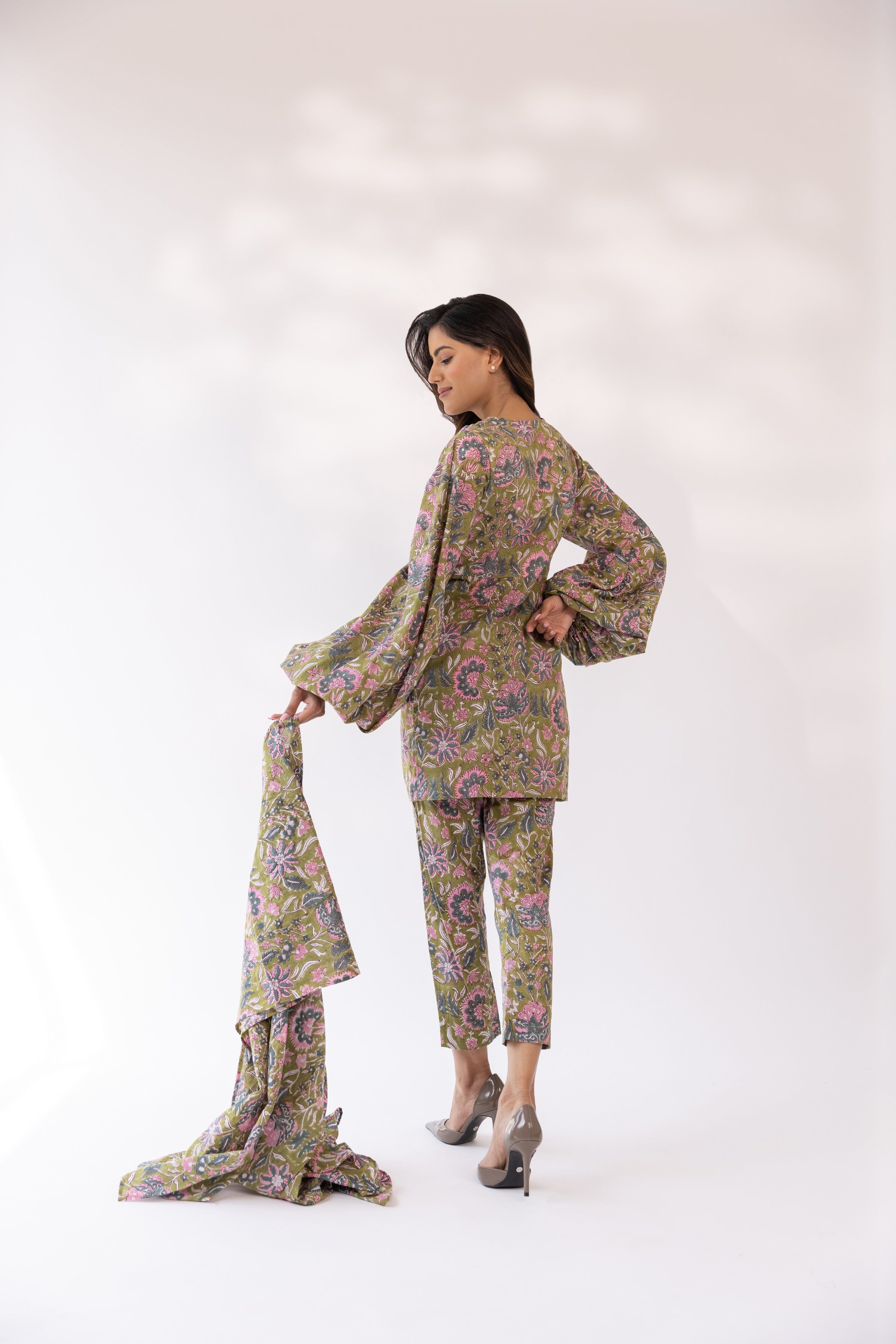 Con kurta con cuello en V y estampado de bloques de color oliva en base de mezcla de algodón, cierre de botón frontal detallado y silueta ajustada. Se combina con pantalones y dupatta a juego.