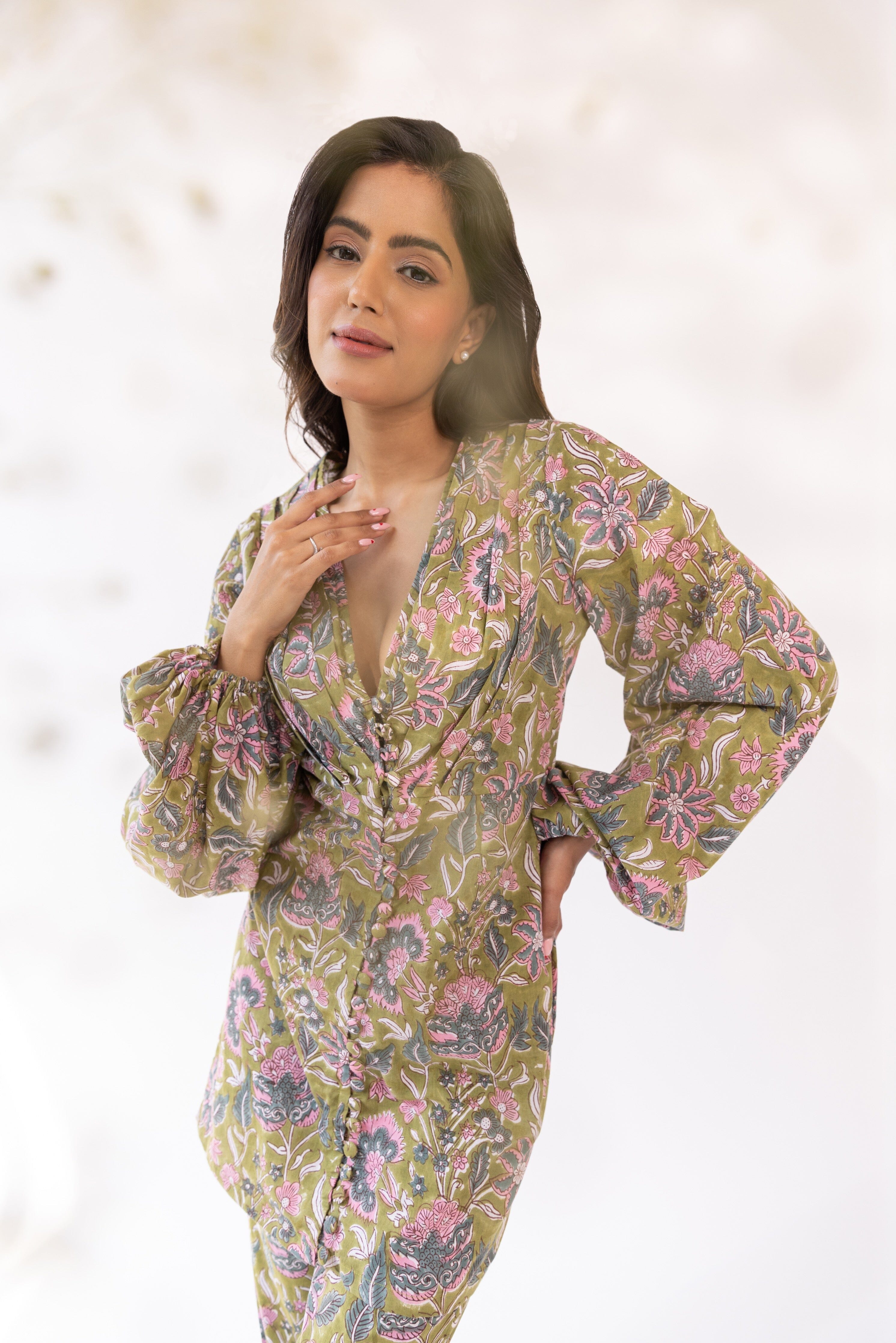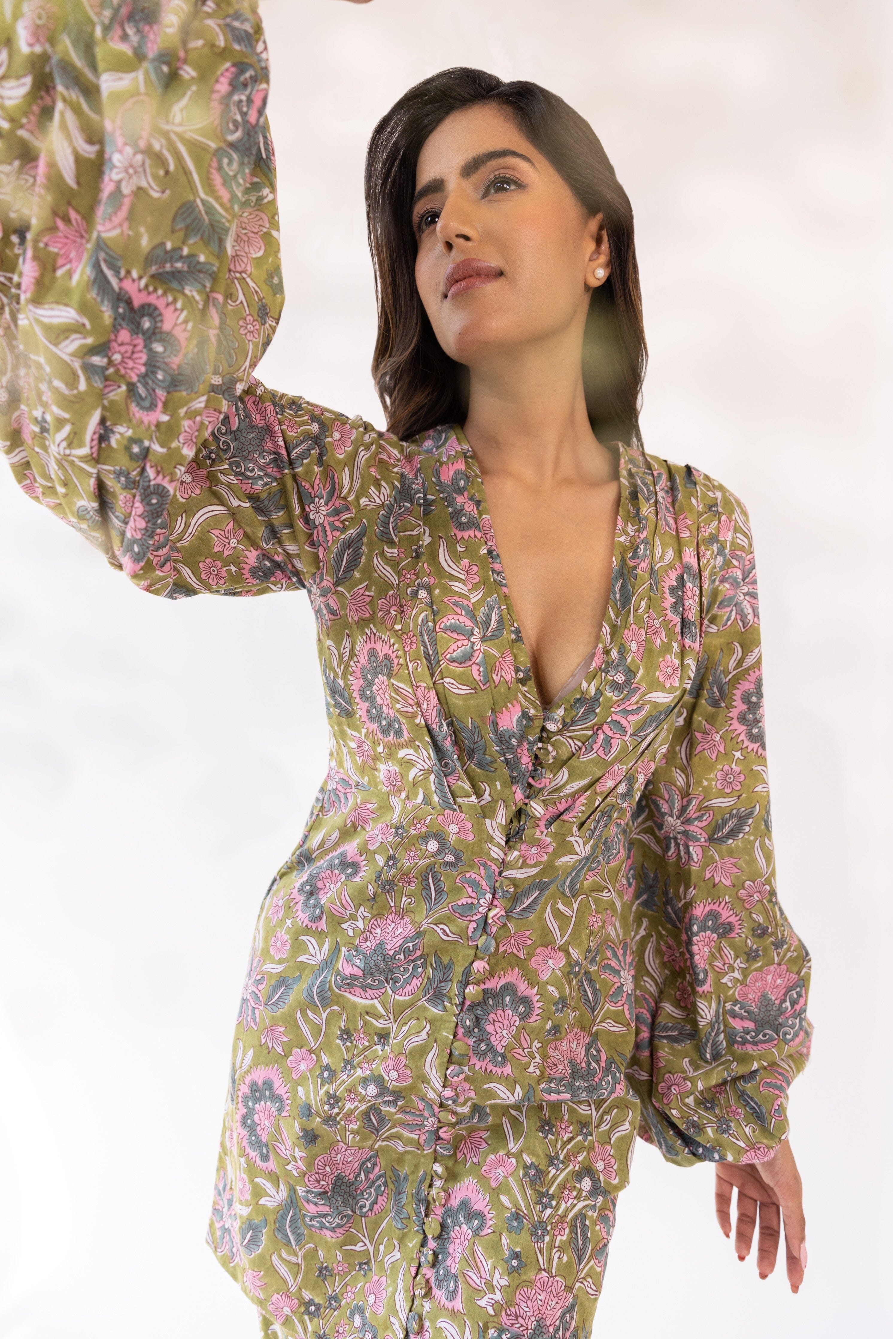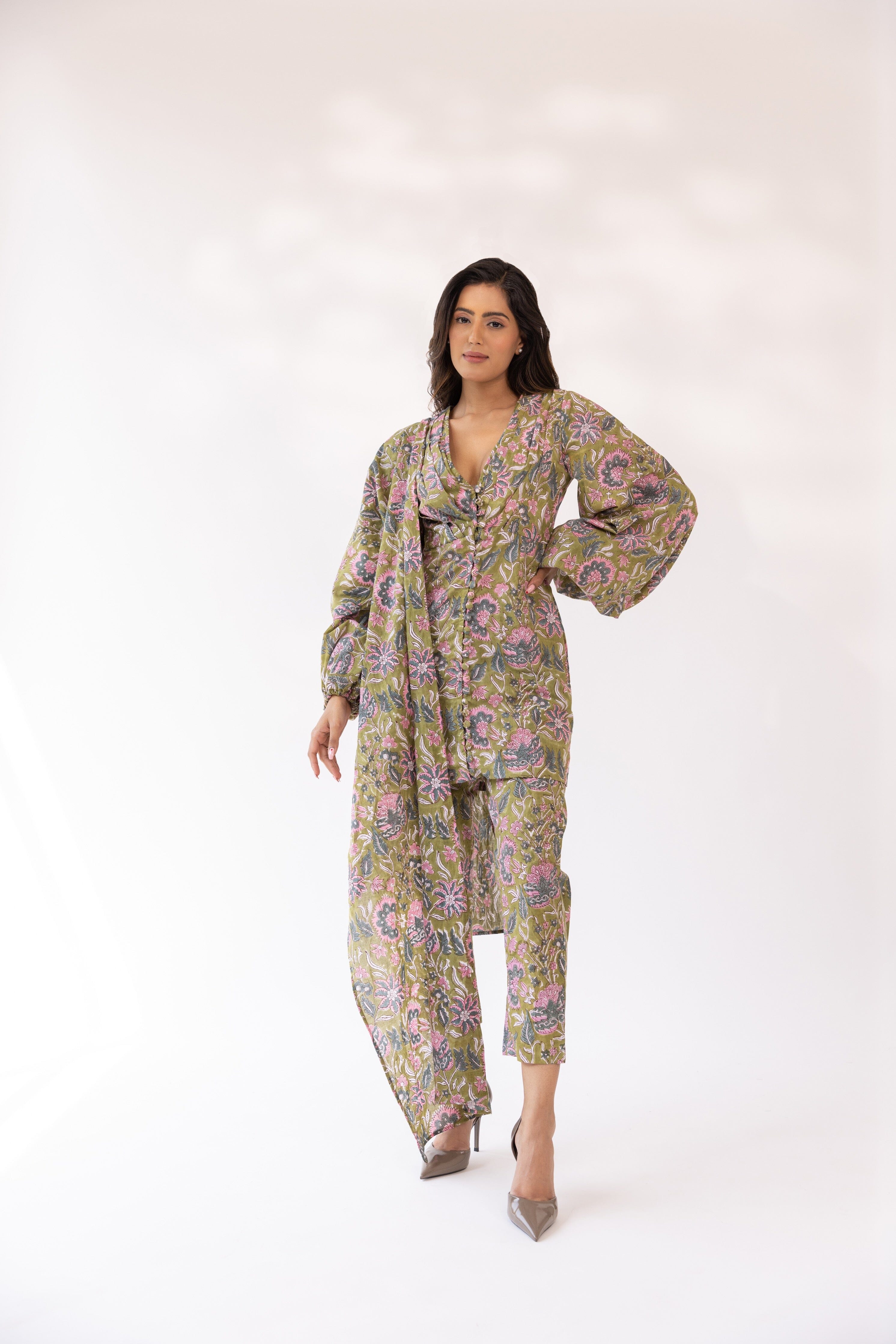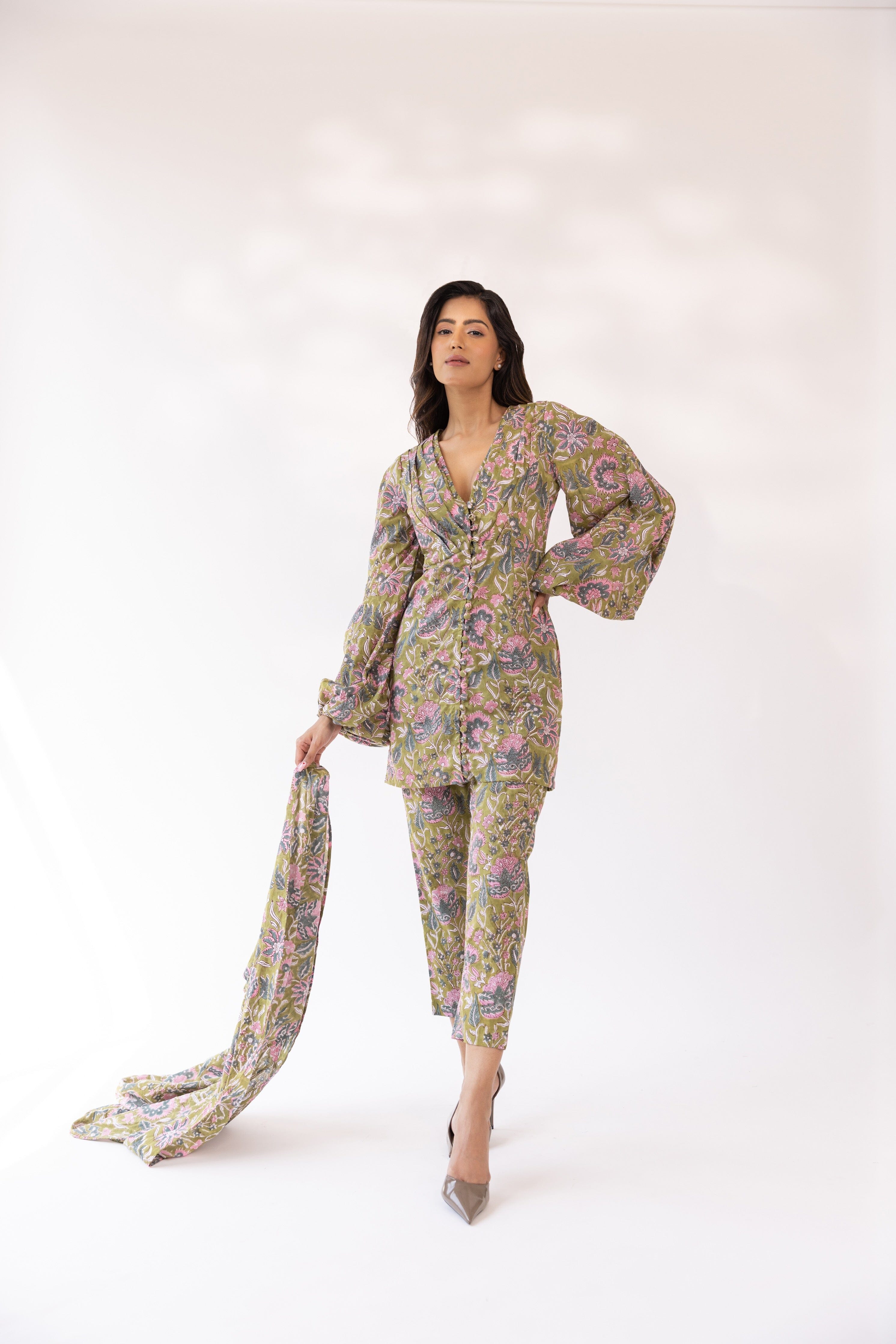 Con kurta con cuello en V y estampado de bloques de color oliva en base de mezcla de algodón, cierre de botón frontal detallado y silueta ajustada. Se combina con pantalones y dupatta a juego.