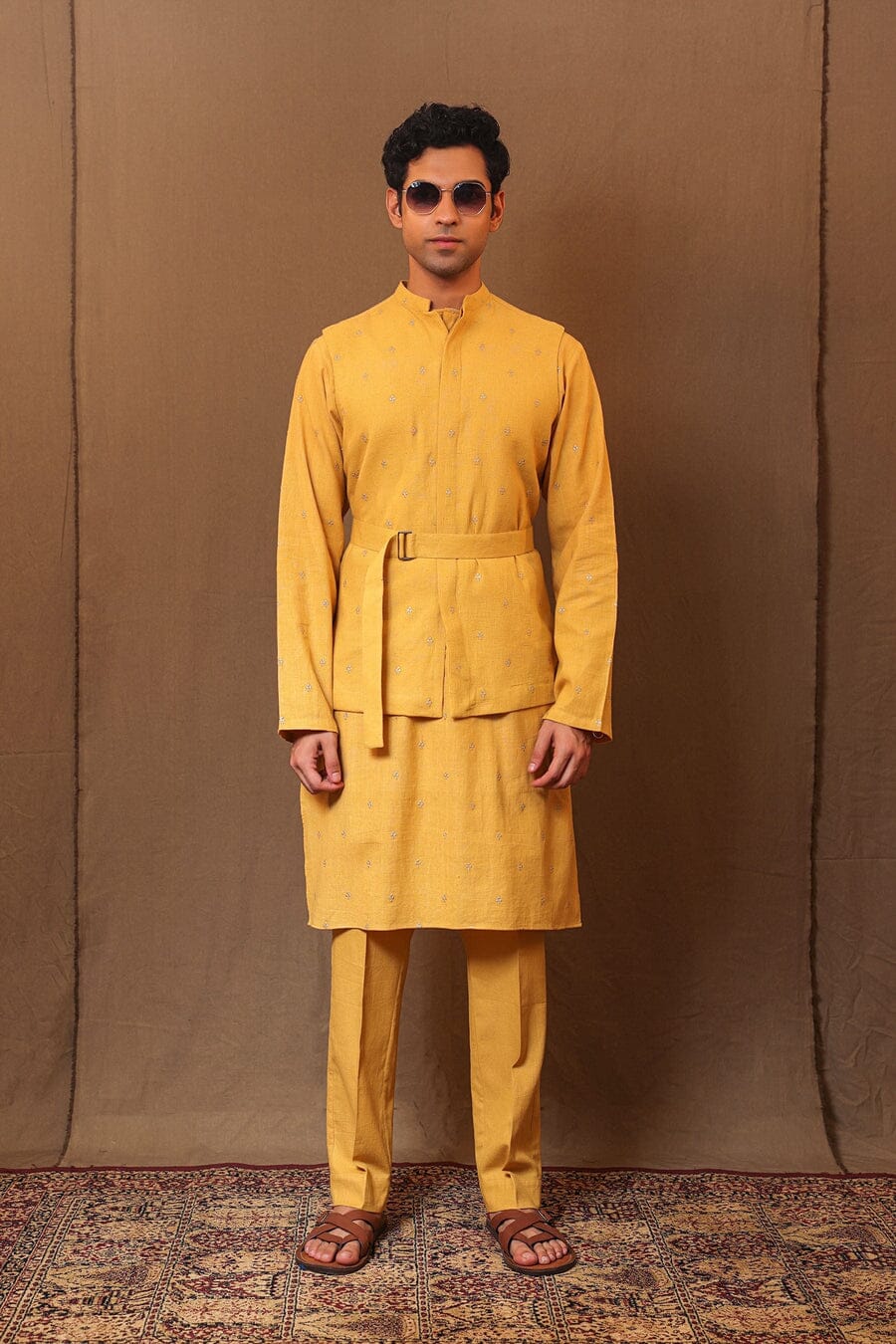 Bandi, kurta and pant set. Embroidered on handspun kala cotton this set comes with a belt. Total 4 pcs with the belt.The fabric we are using is 100% cotton which is soft and will suit any skin type. The fabric gets softer with each wash.