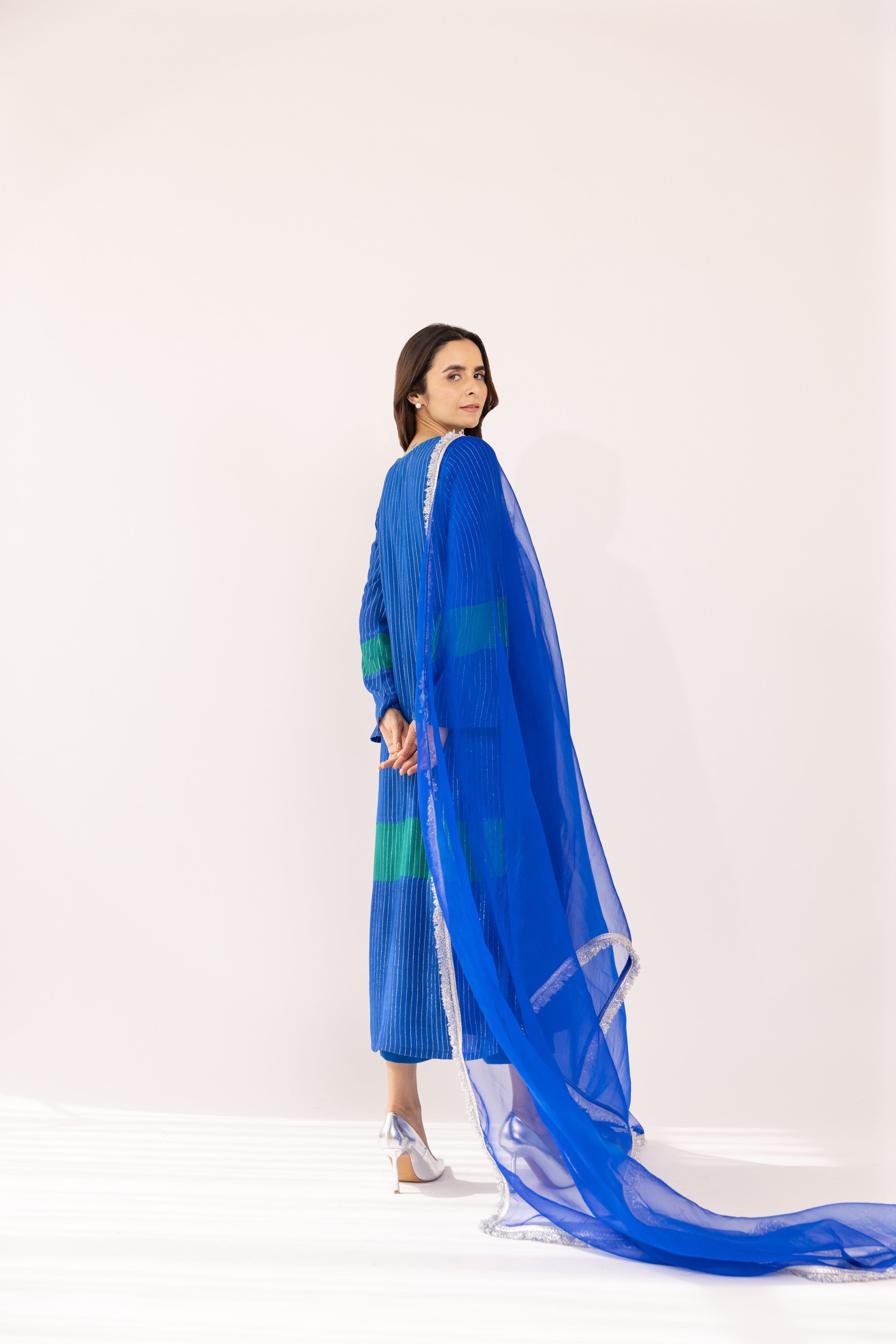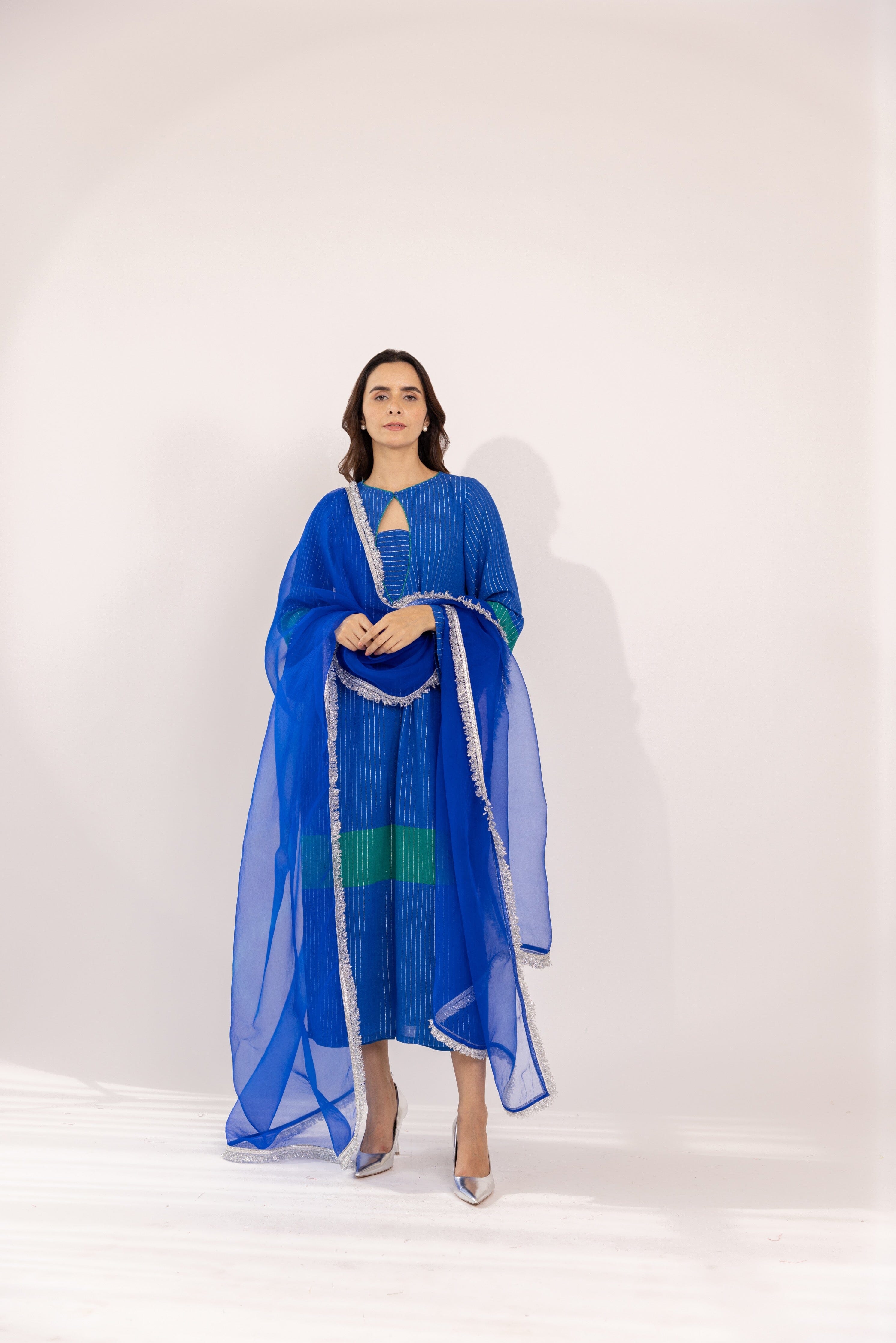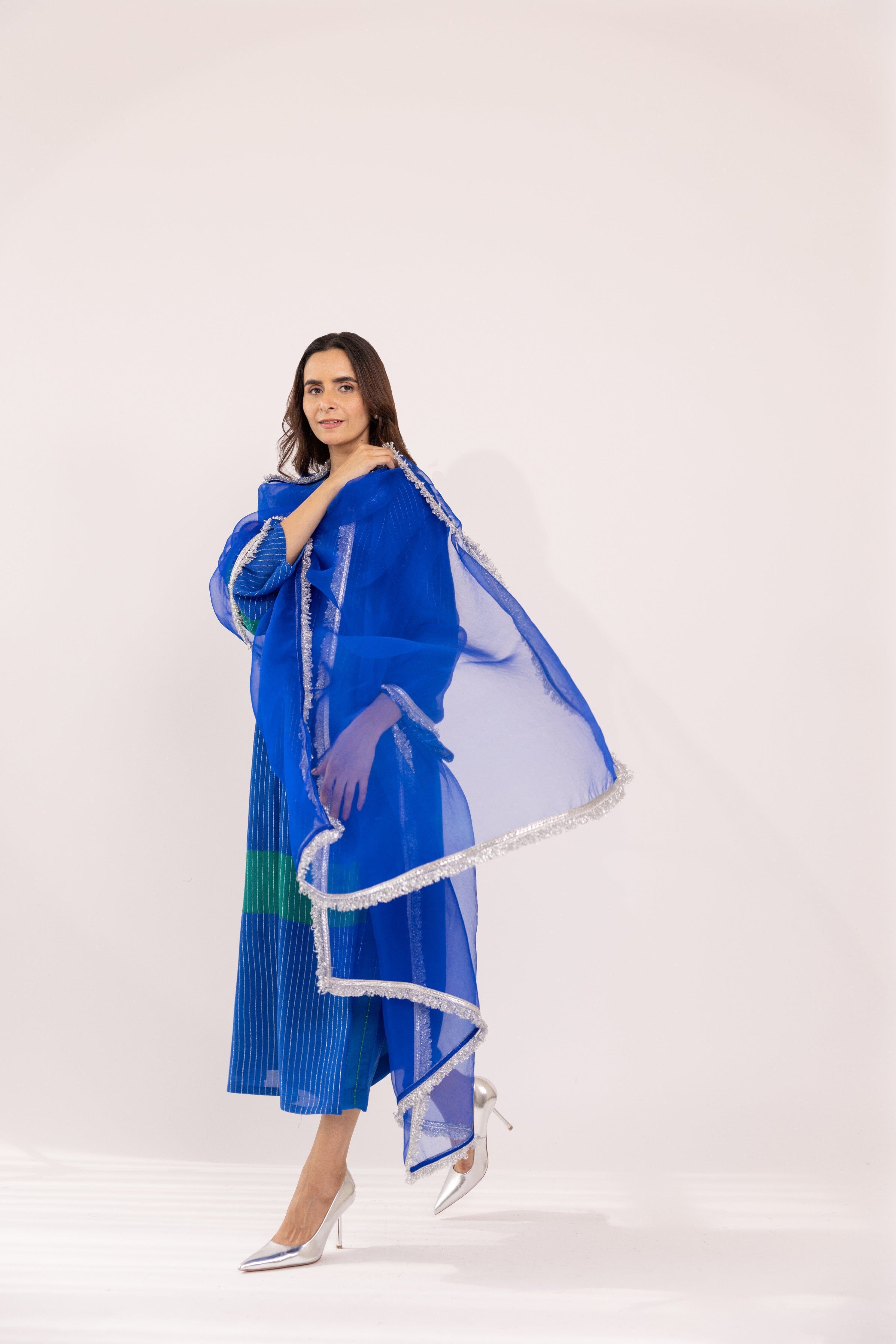 Con kurta de lurex azul real en base de algodón. Se combina con pantalón a juego y dupatta de organza con encaje de flecos de lúrex.