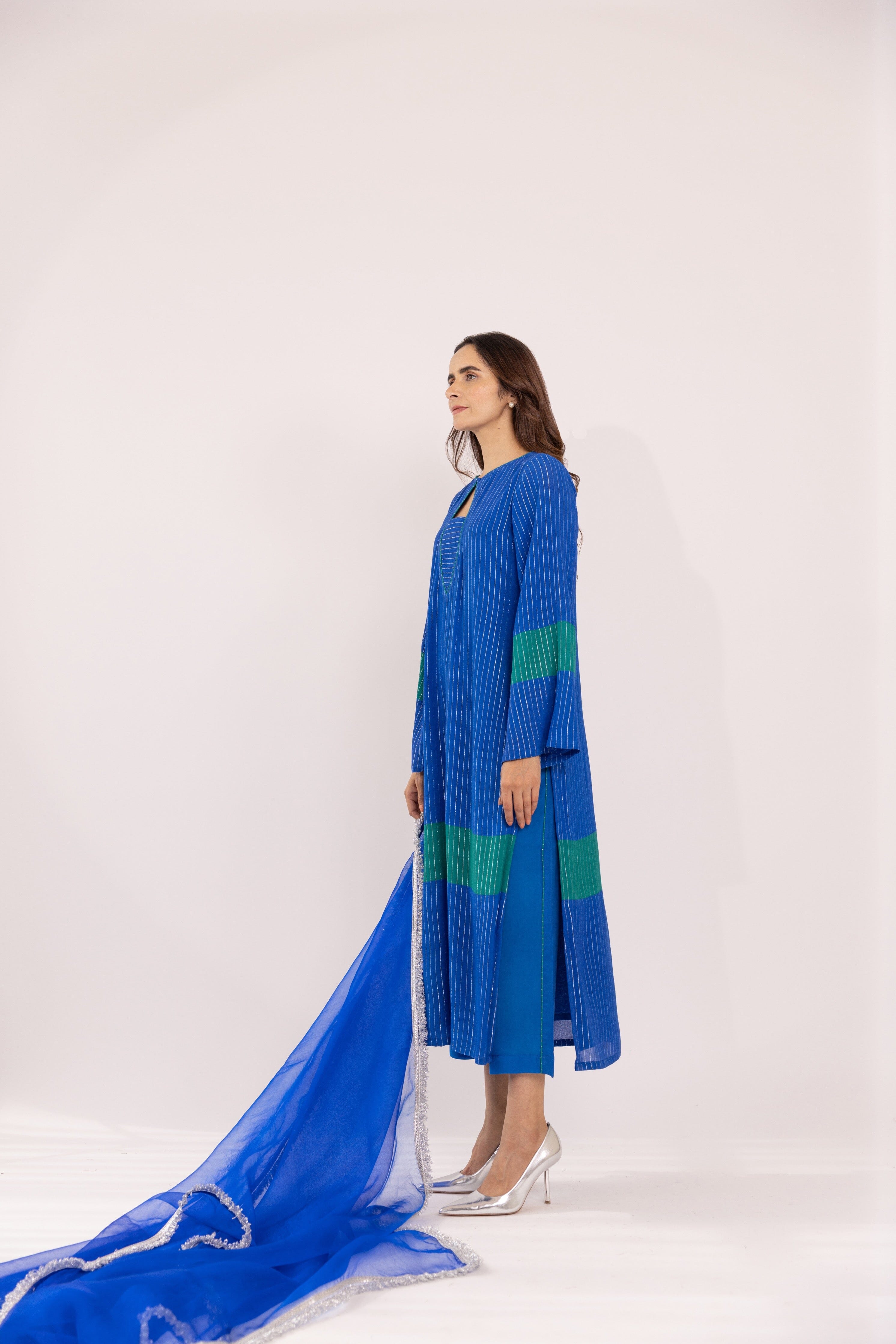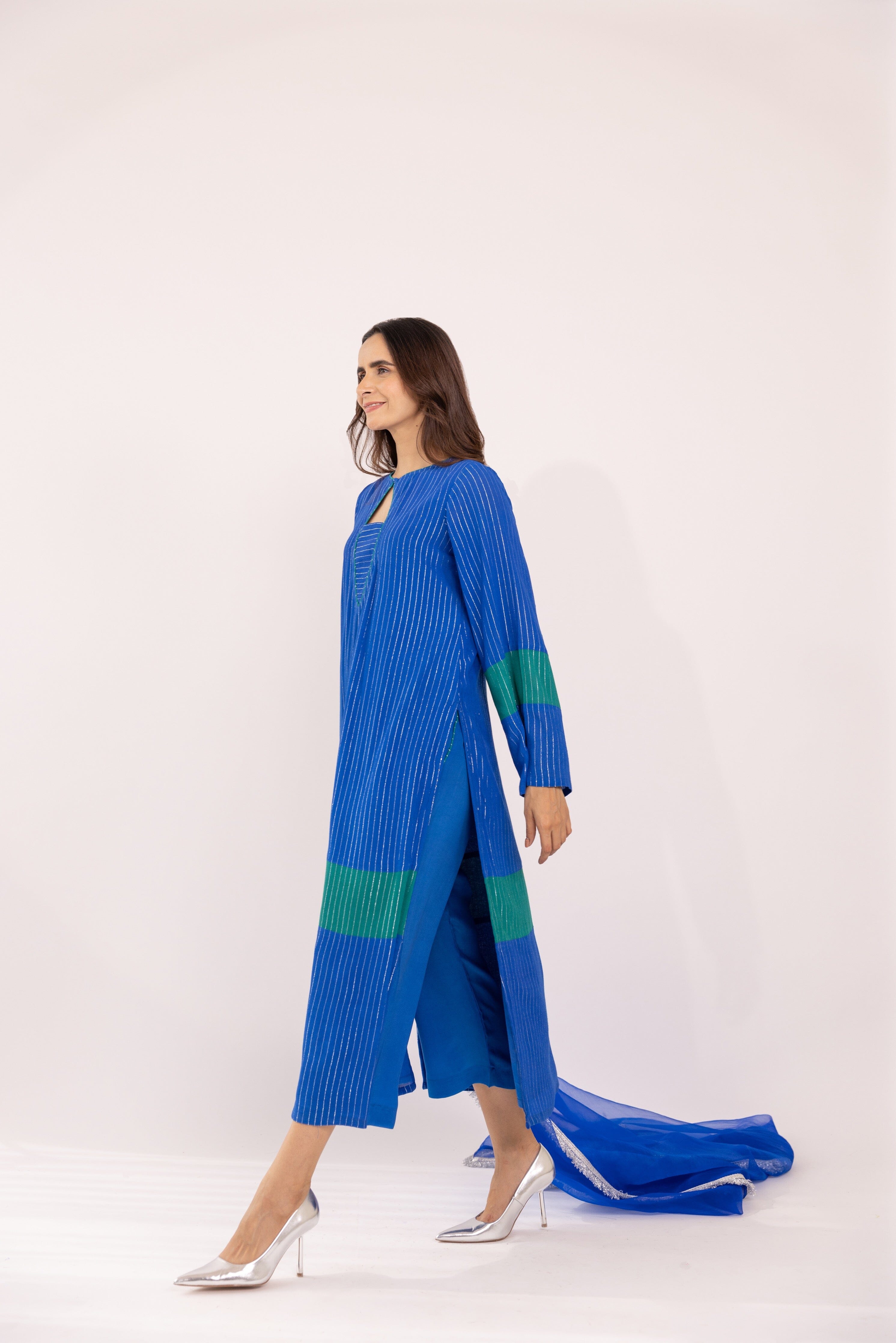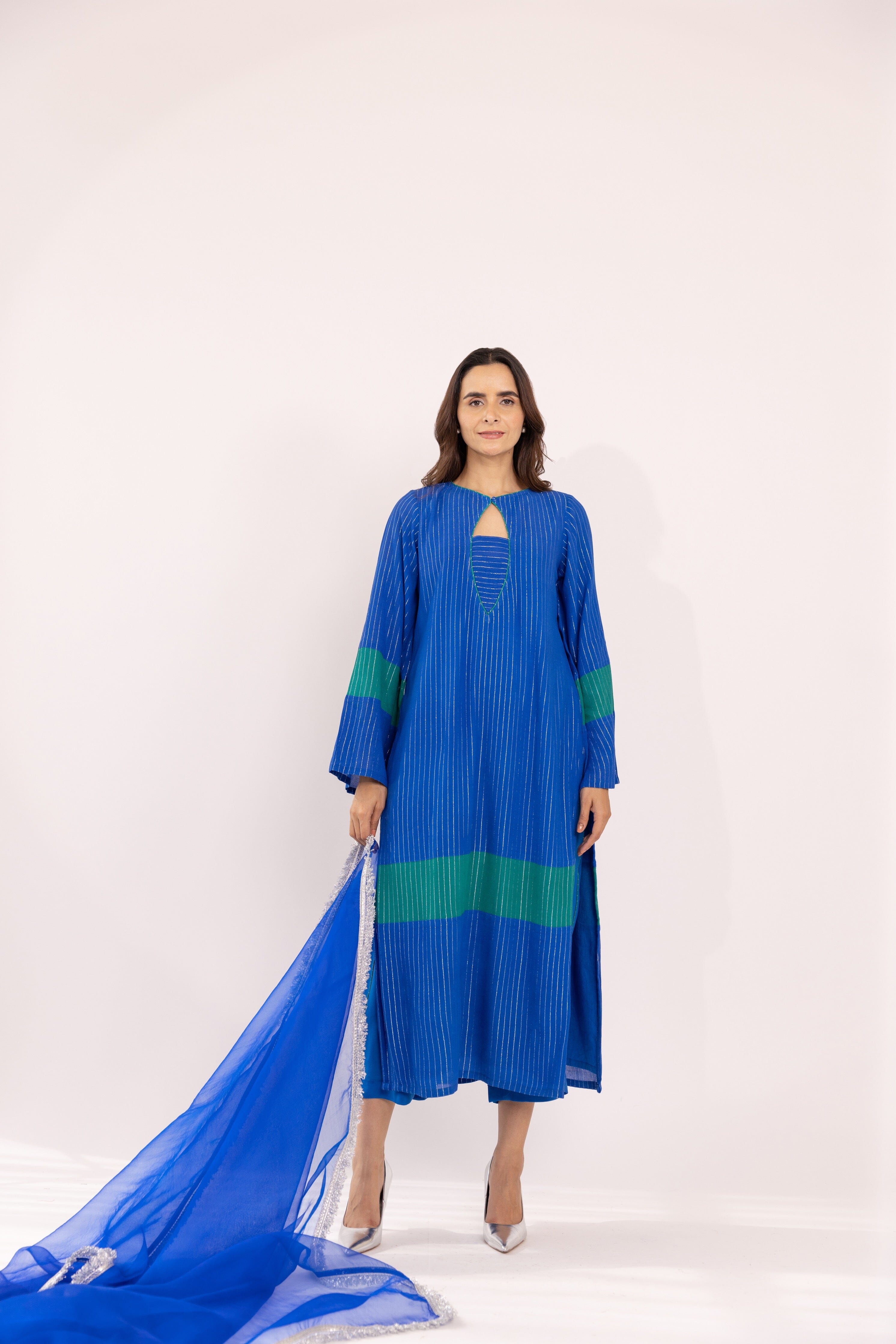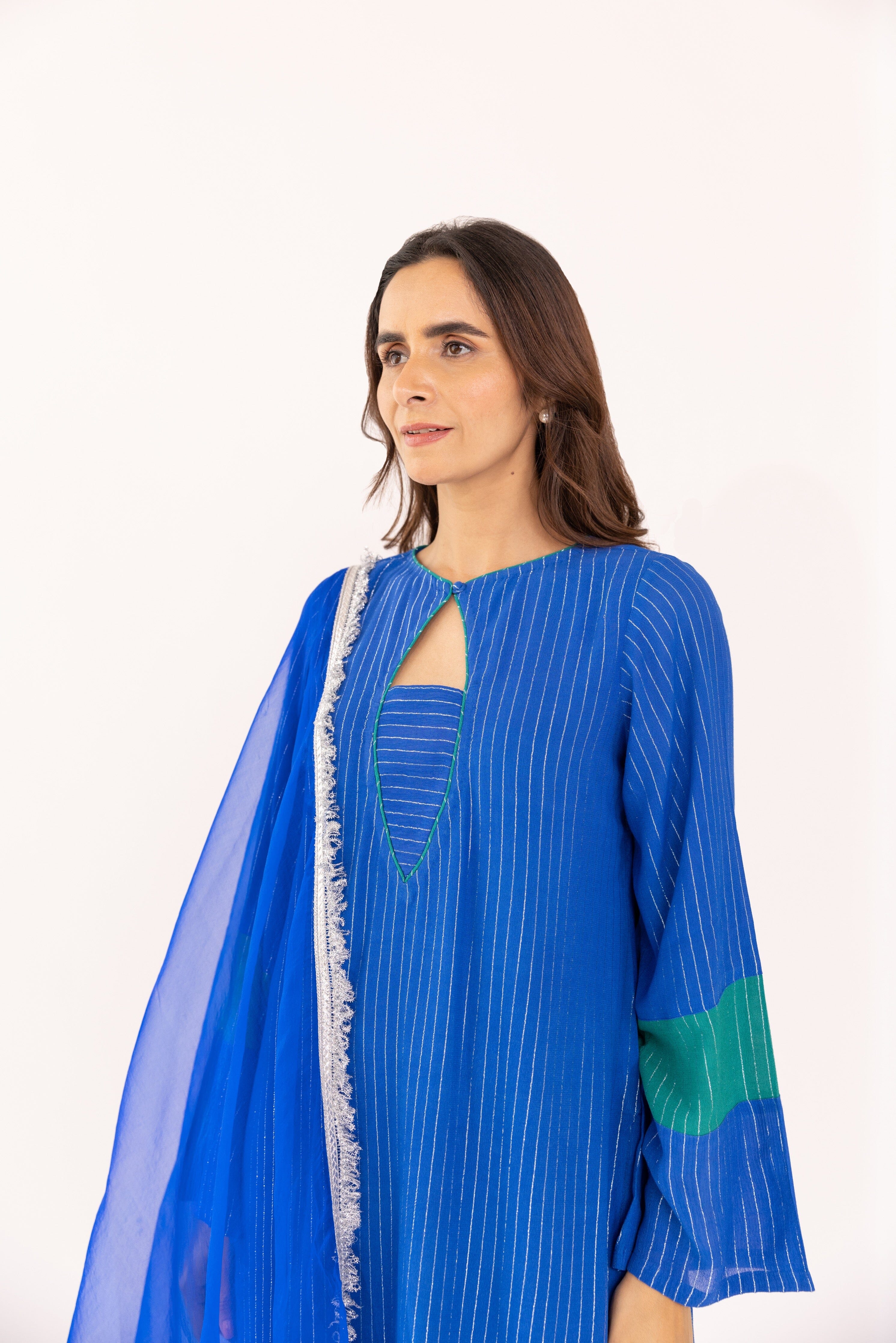 Con kurta de lurex azul real en base de algodón. Se combina con pantalón a juego y dupatta de organza con encaje de flecos de lúrex.