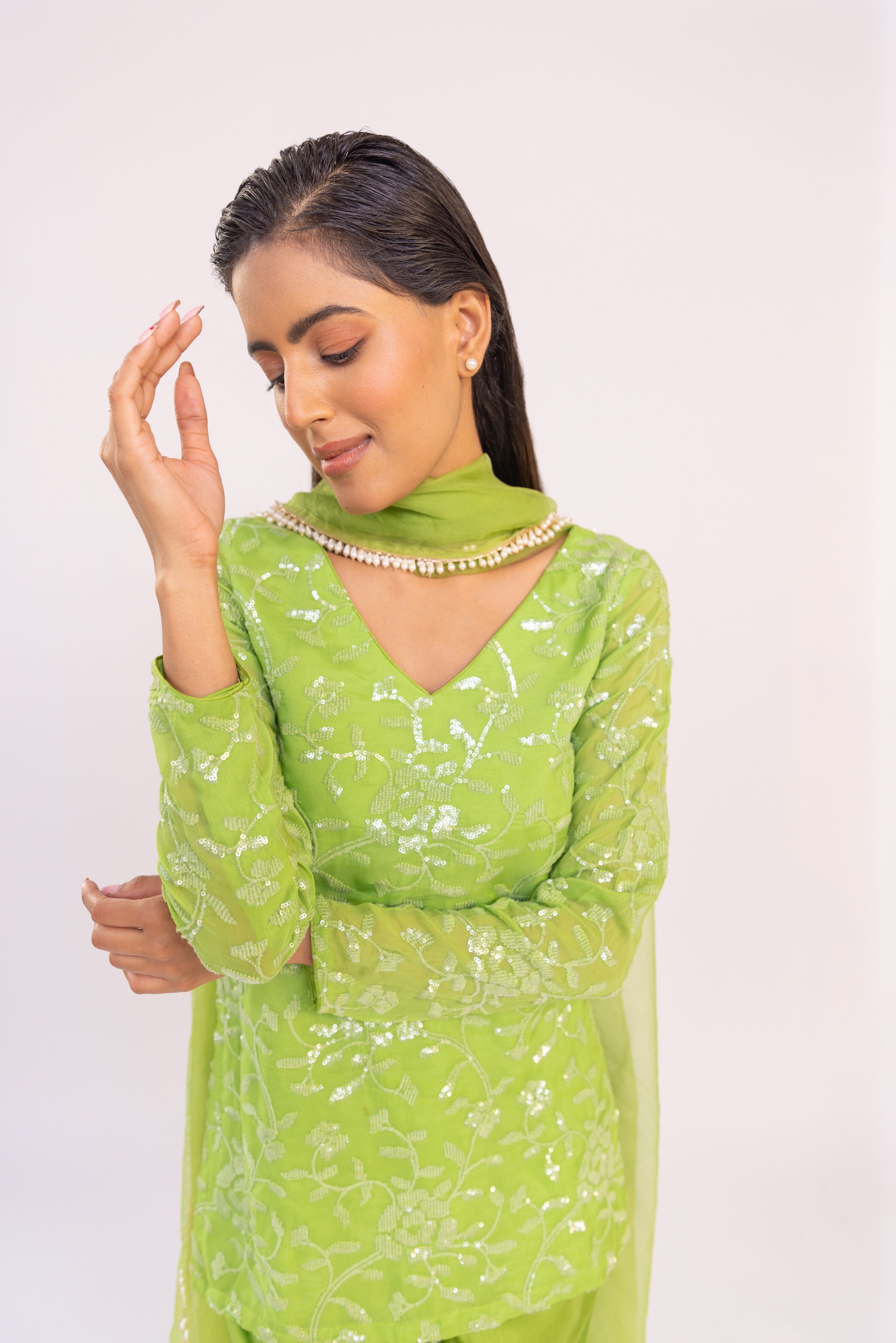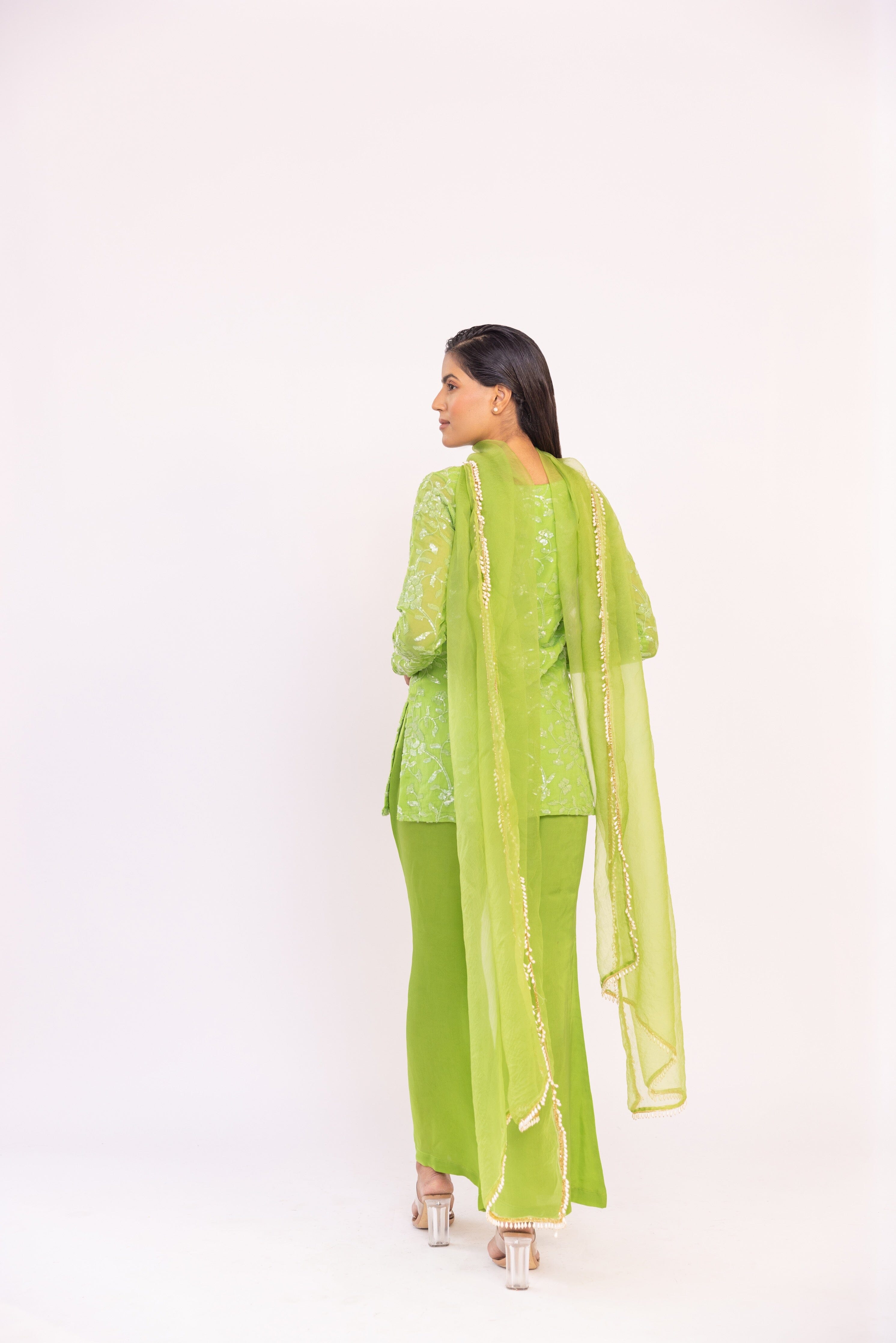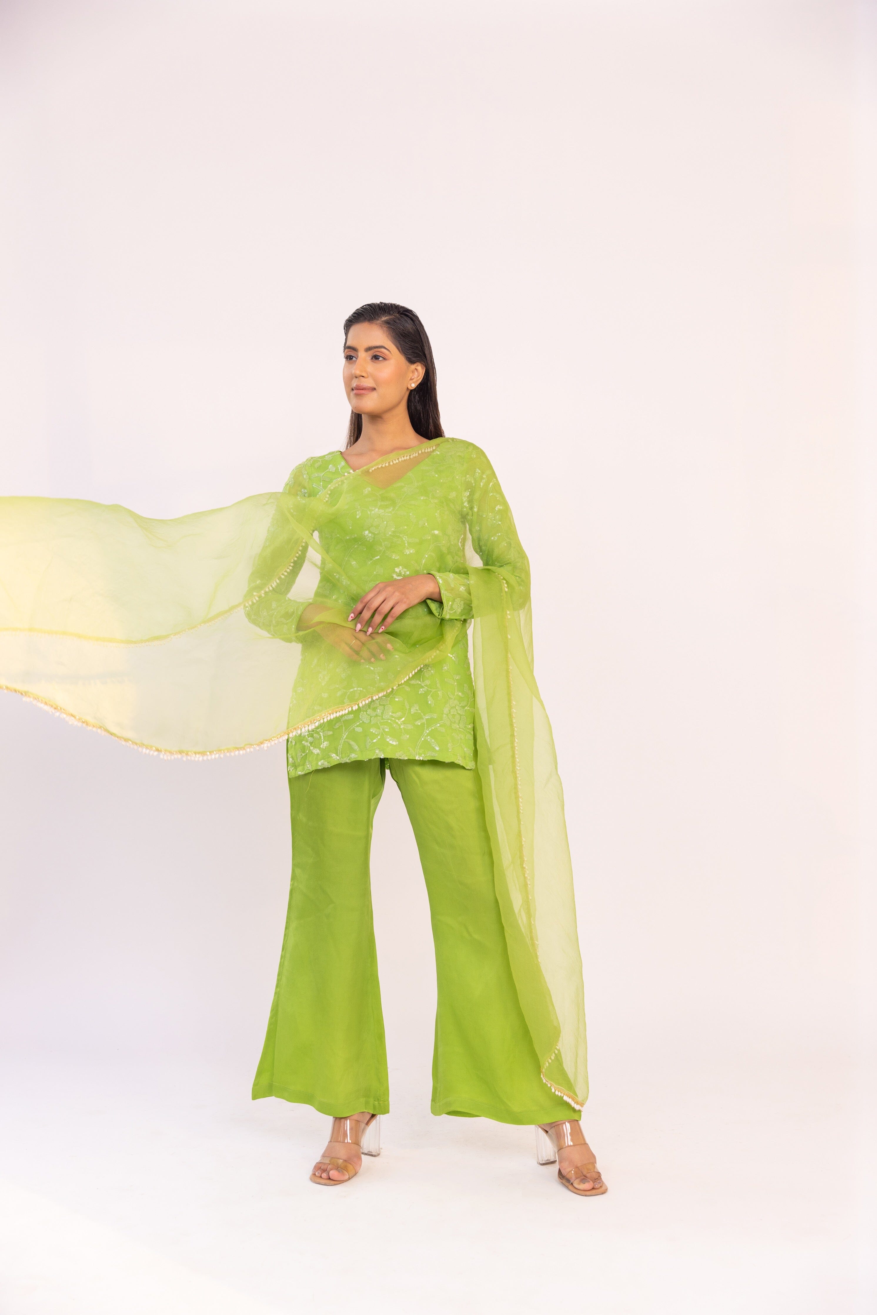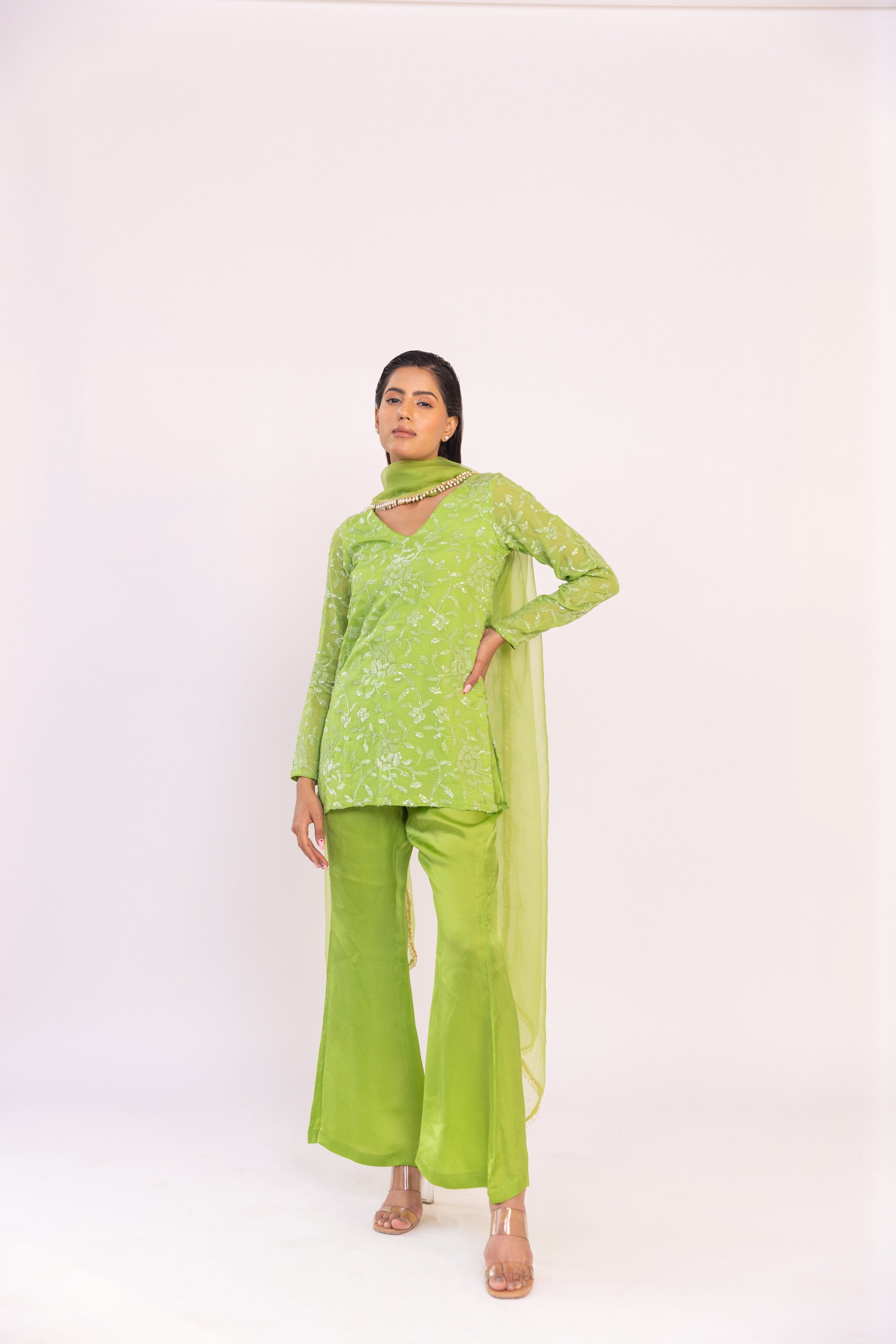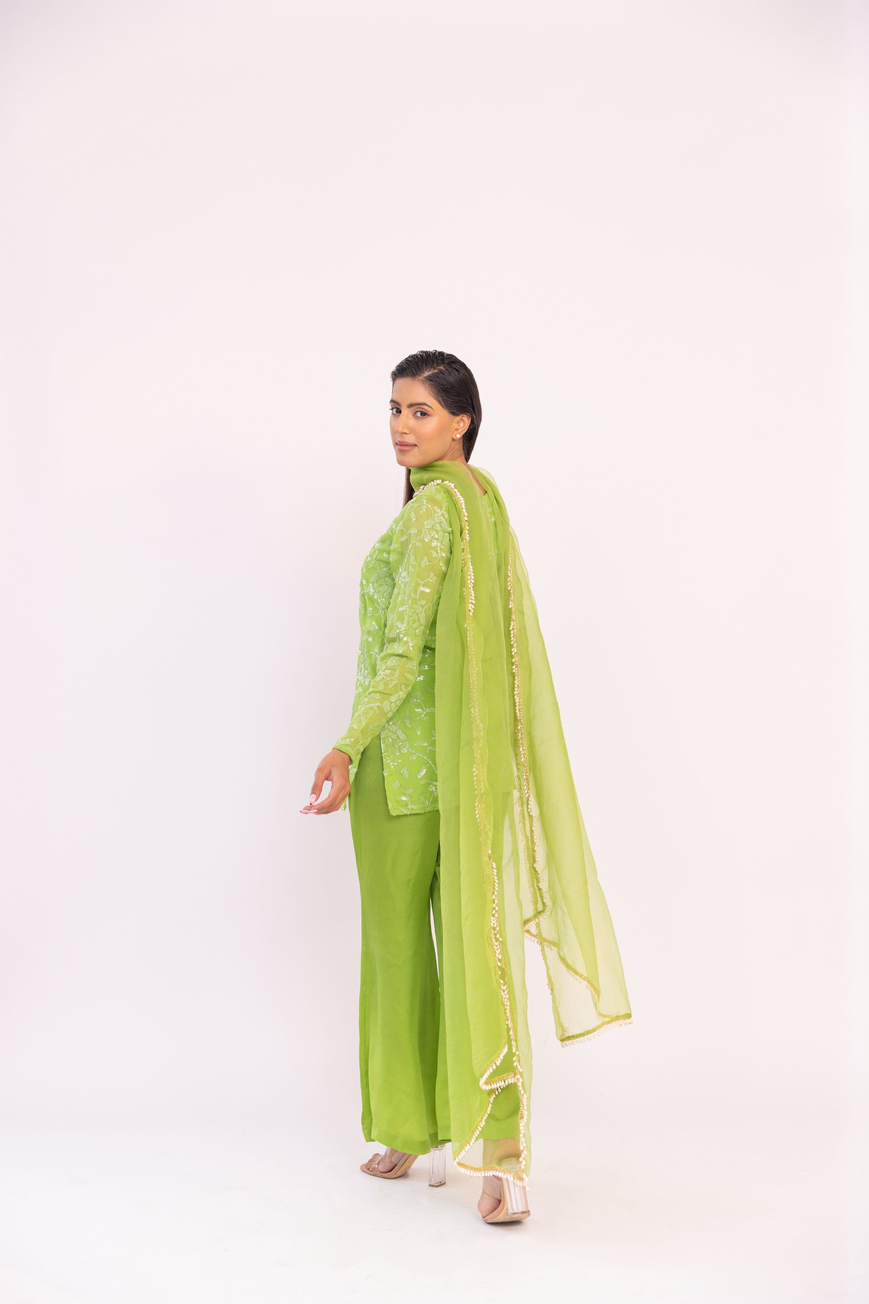 Con una kurta verde bordada con cuello en V y detalle de base de gorgette. Se combina con pantalones acampanados de satén liso y dupatta de red con ribete de encaje.