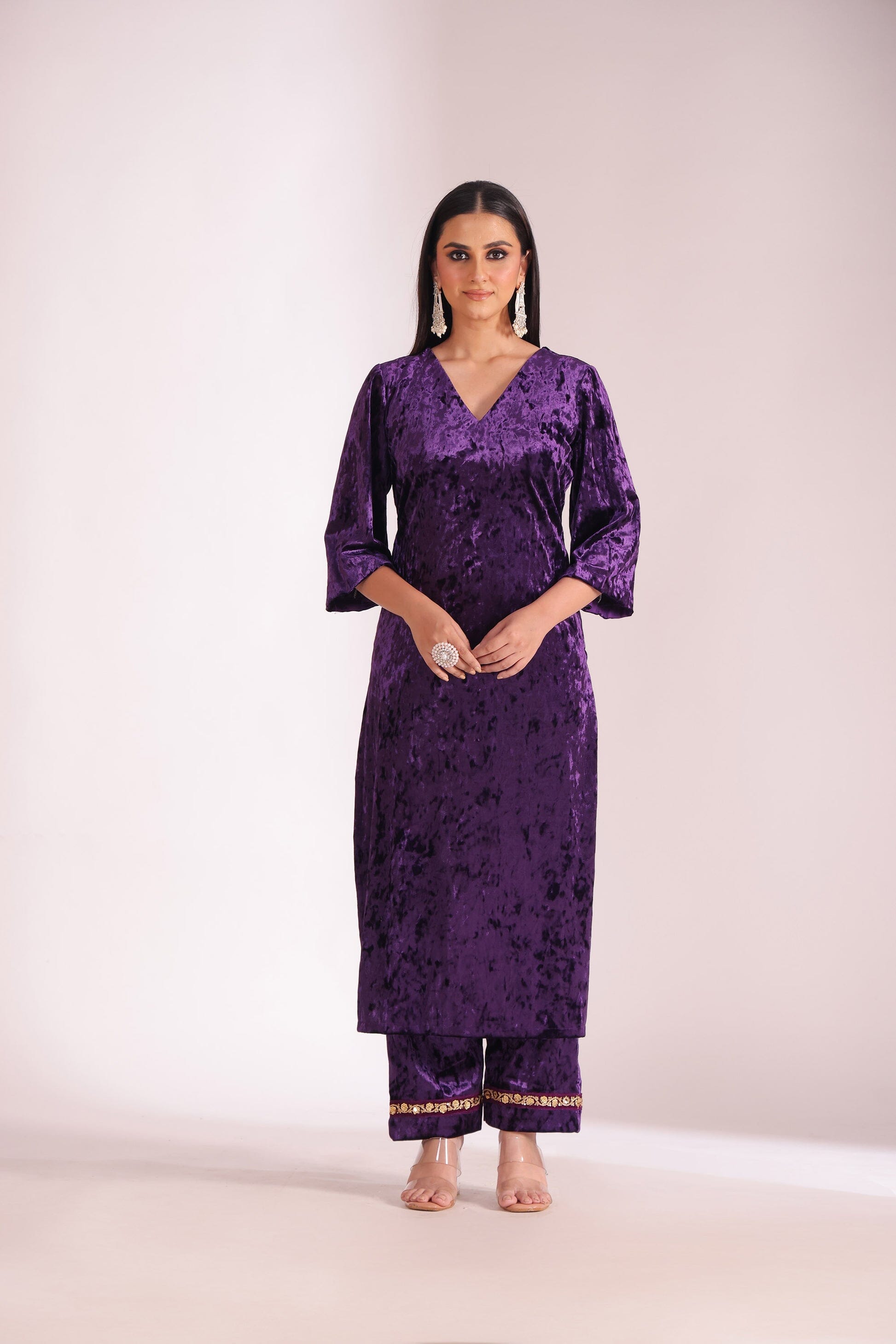 Noor-e-zar Purple Velvet Kurta With Velvet Palazzo And Shawl - Set Of 3