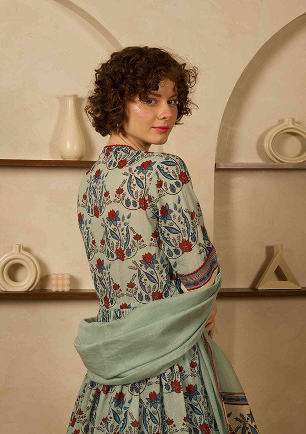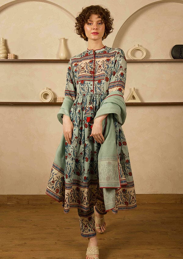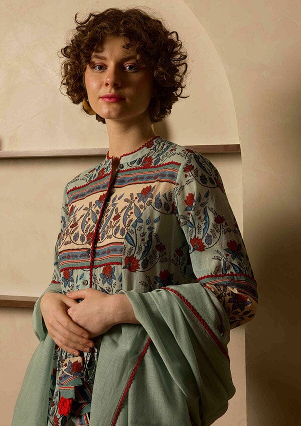 Este conjunto presenta una kurta estampada con lazo y fruncido alrededor de la cintura, pantalones estrechos estampados y una dupatta.