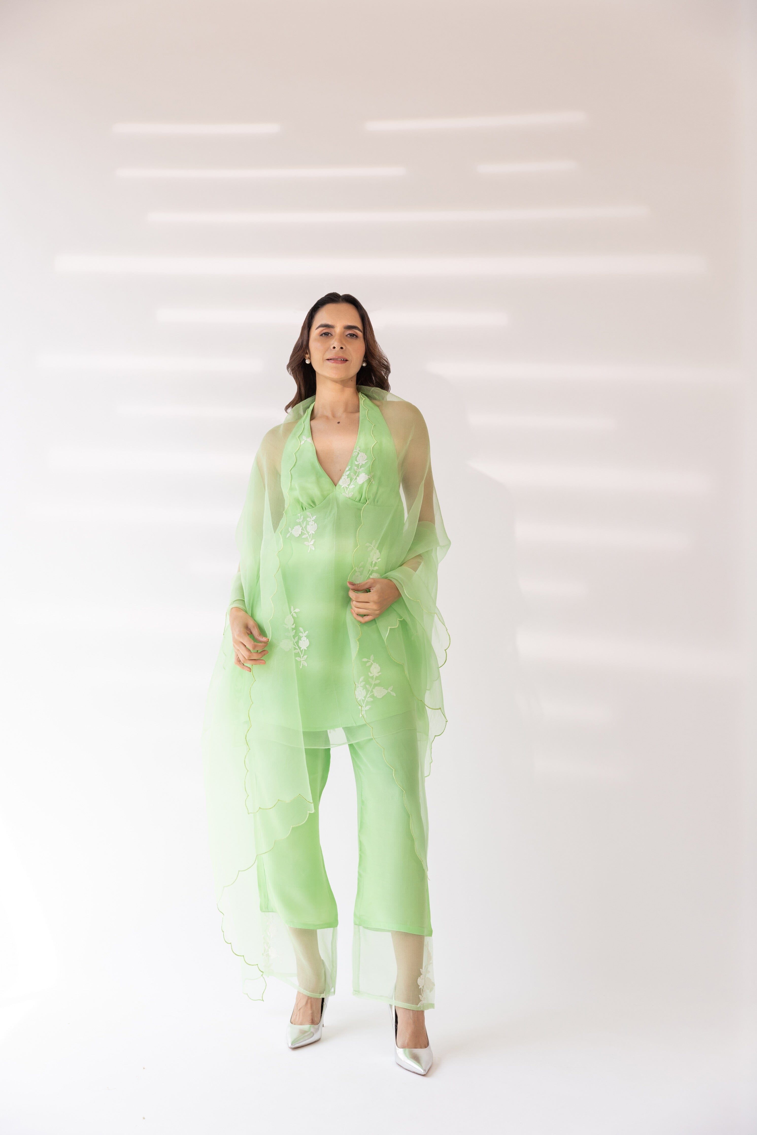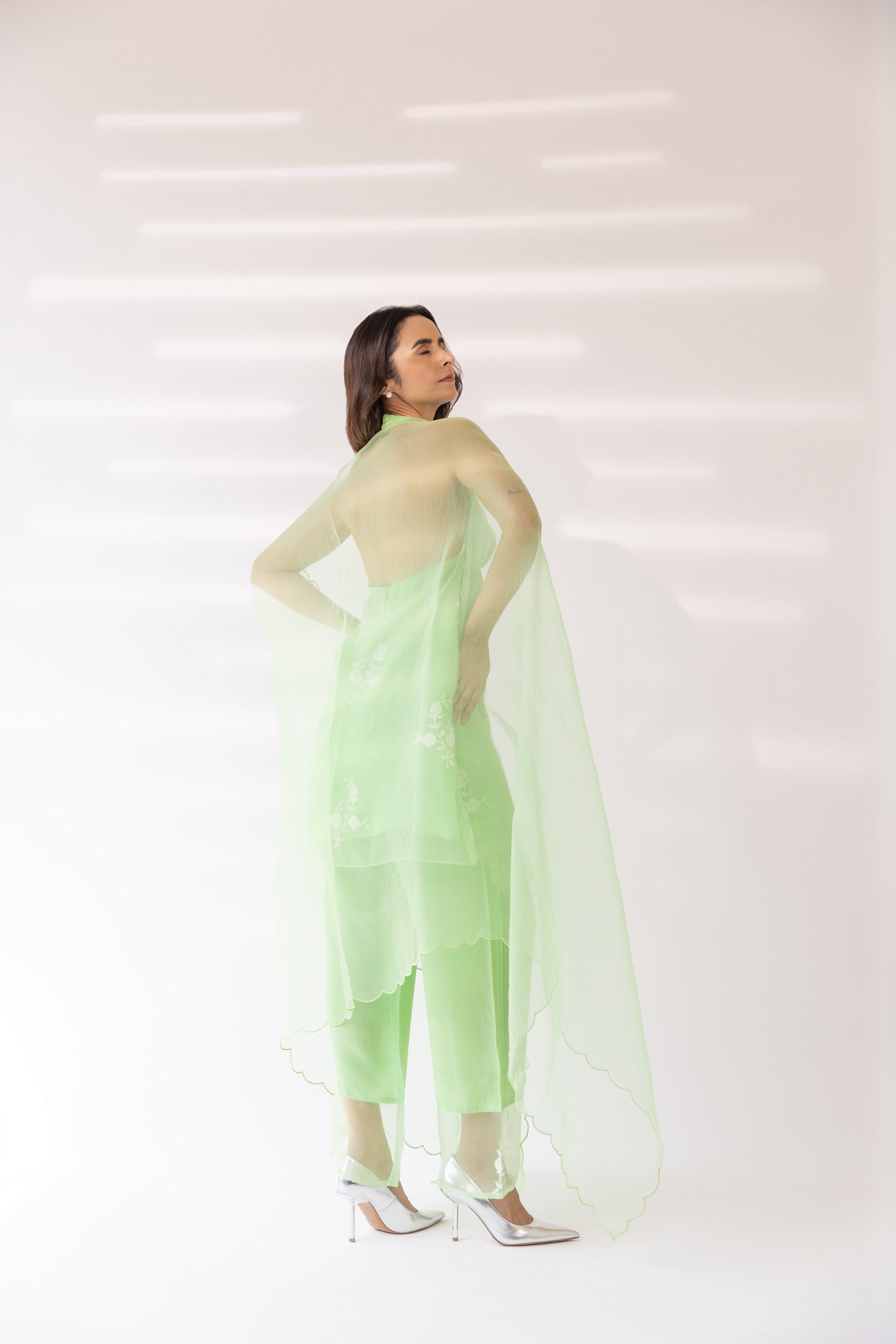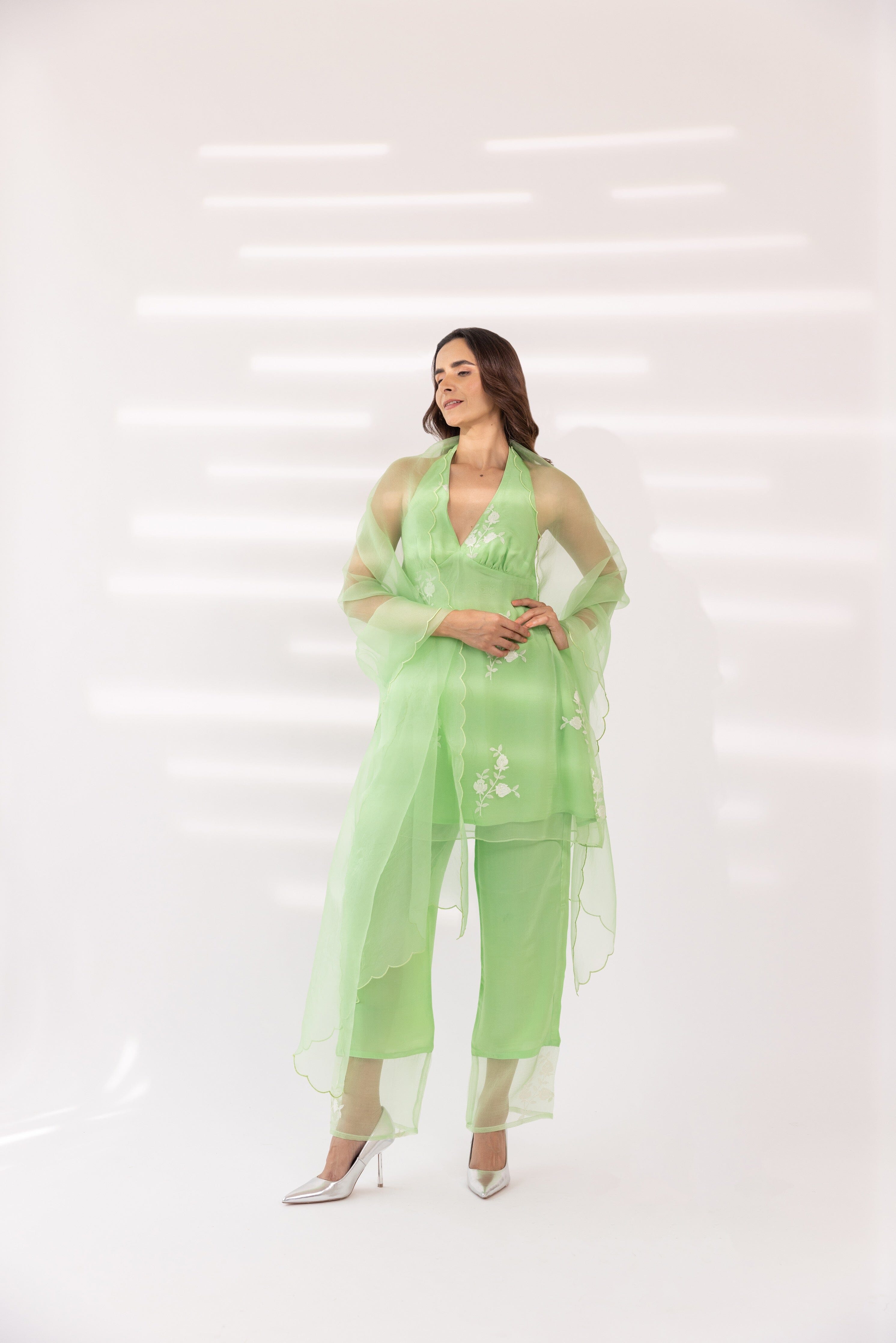 Con una kurta halter bordada en color menta con base de organza. Se combina con pantalones lisos y dupatta de organza festoneada.