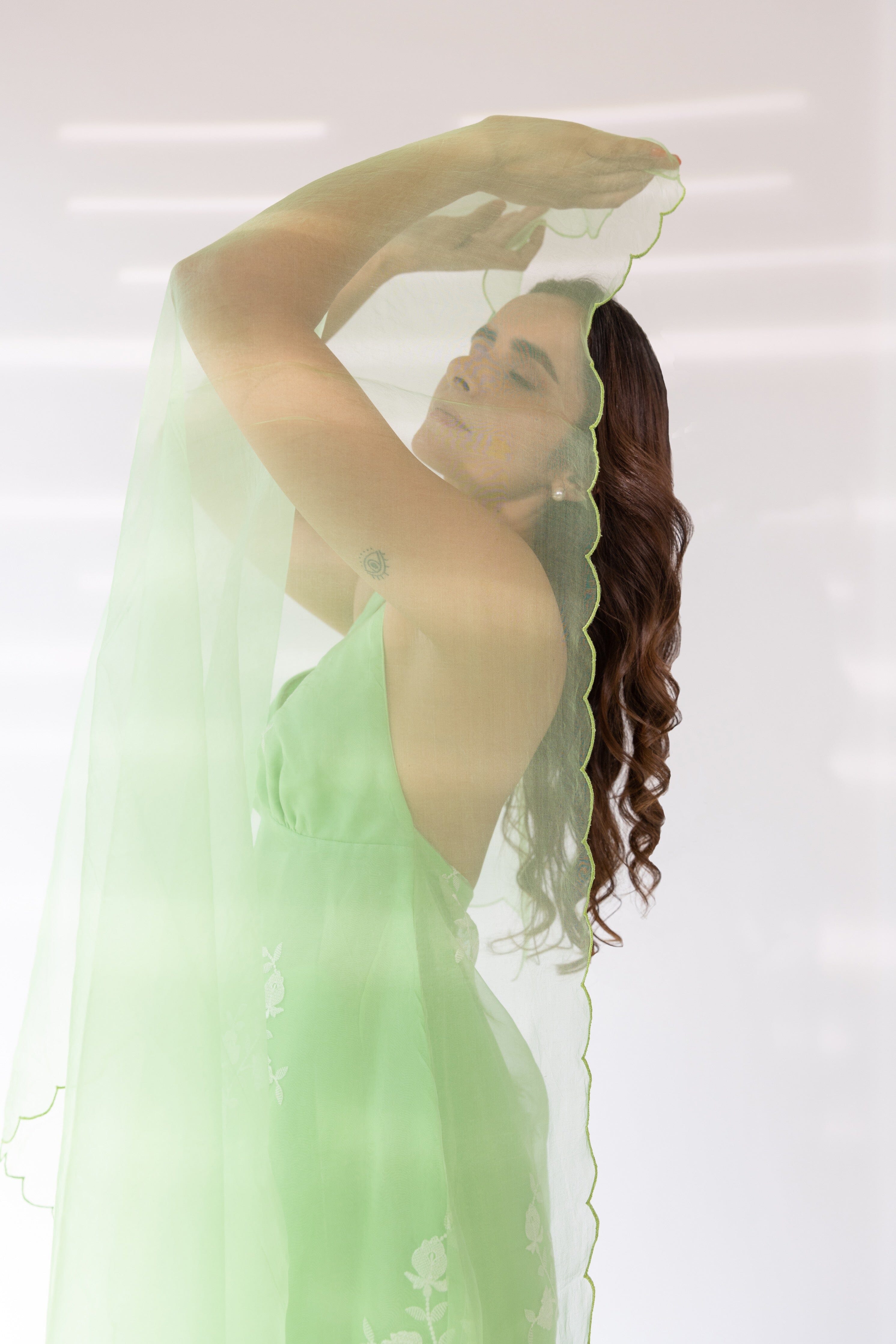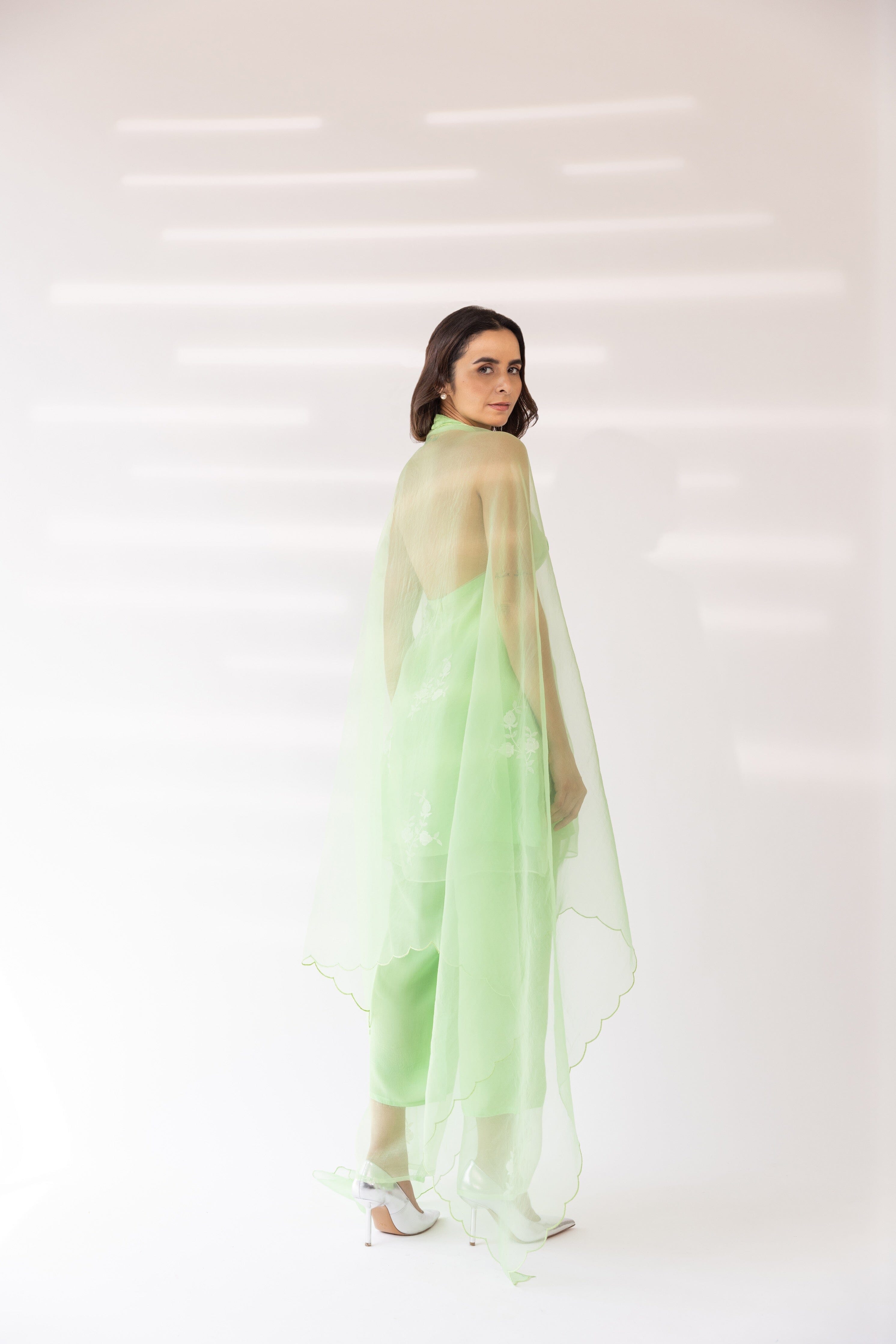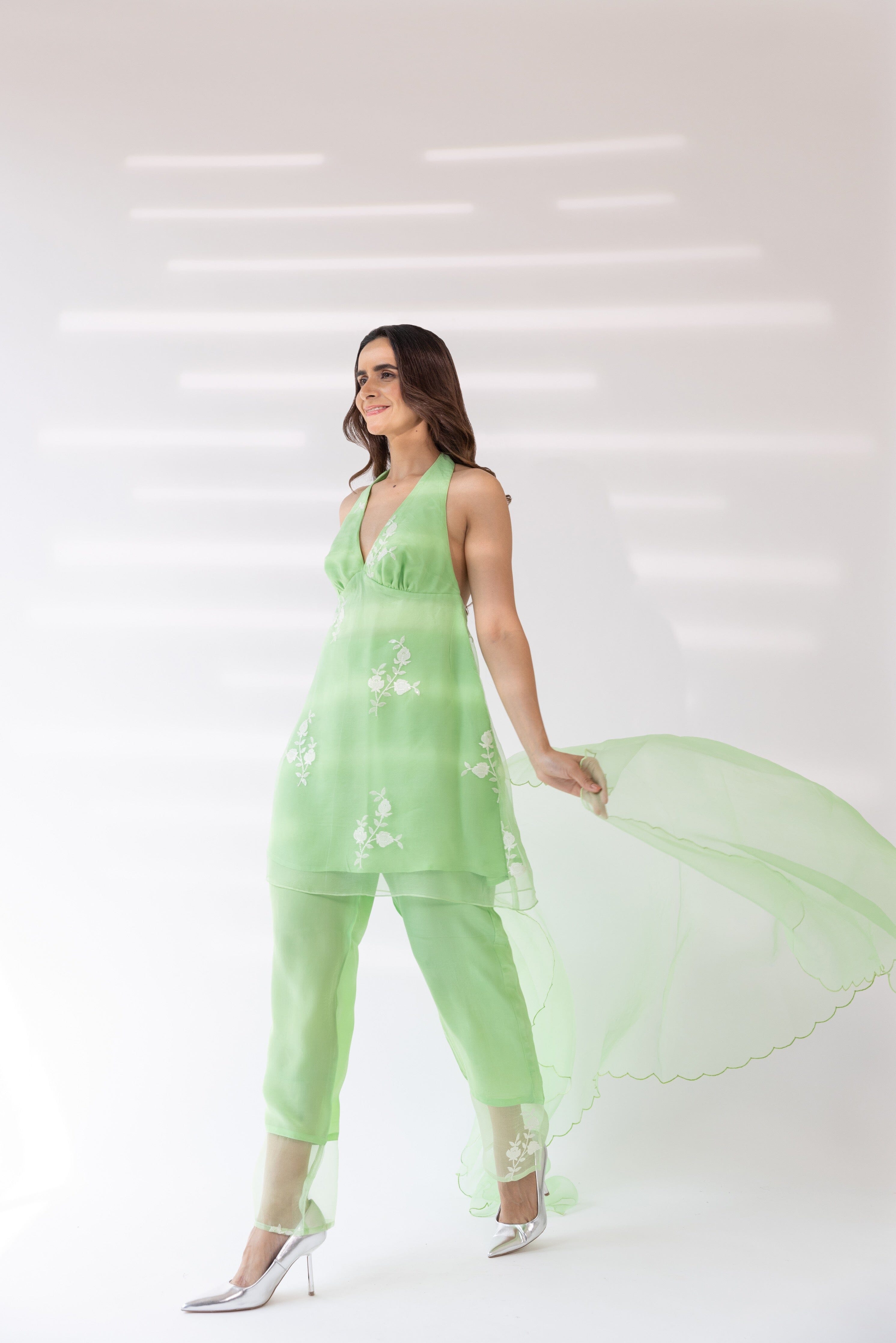 Con una kurta halter bordada en color menta con base de organza. Se combina con pantalones lisos y dupatta de organza festoneada.