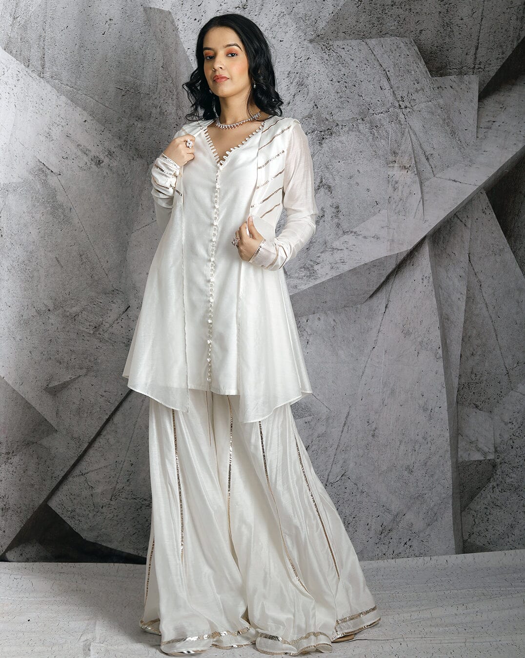 Envuelto entre la gracia eterna del marfil y el brillo sutil de la gota se encuentra este conjunto. La rica tela de chanderi lleva adornos de gota para crear una apariencia vanguardista. El chanderi de la kurta, la chaqueta y los pantalones está tejido a mano con amor por tejedoras de los interiores de Madhya Pradesh.