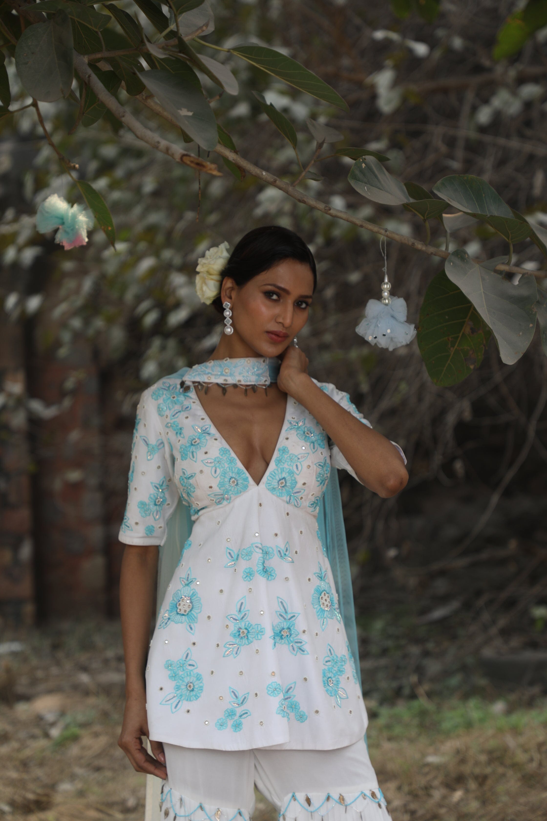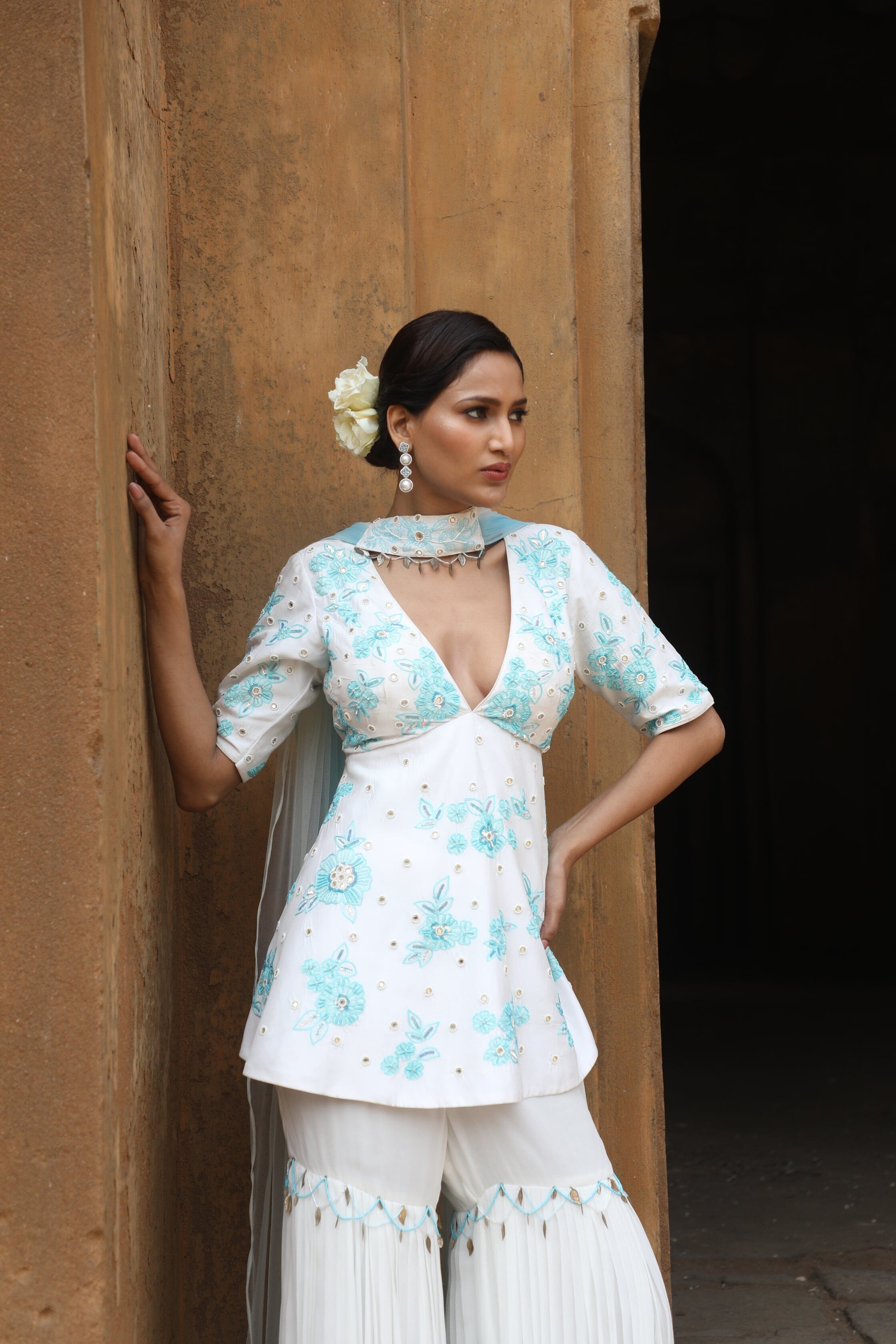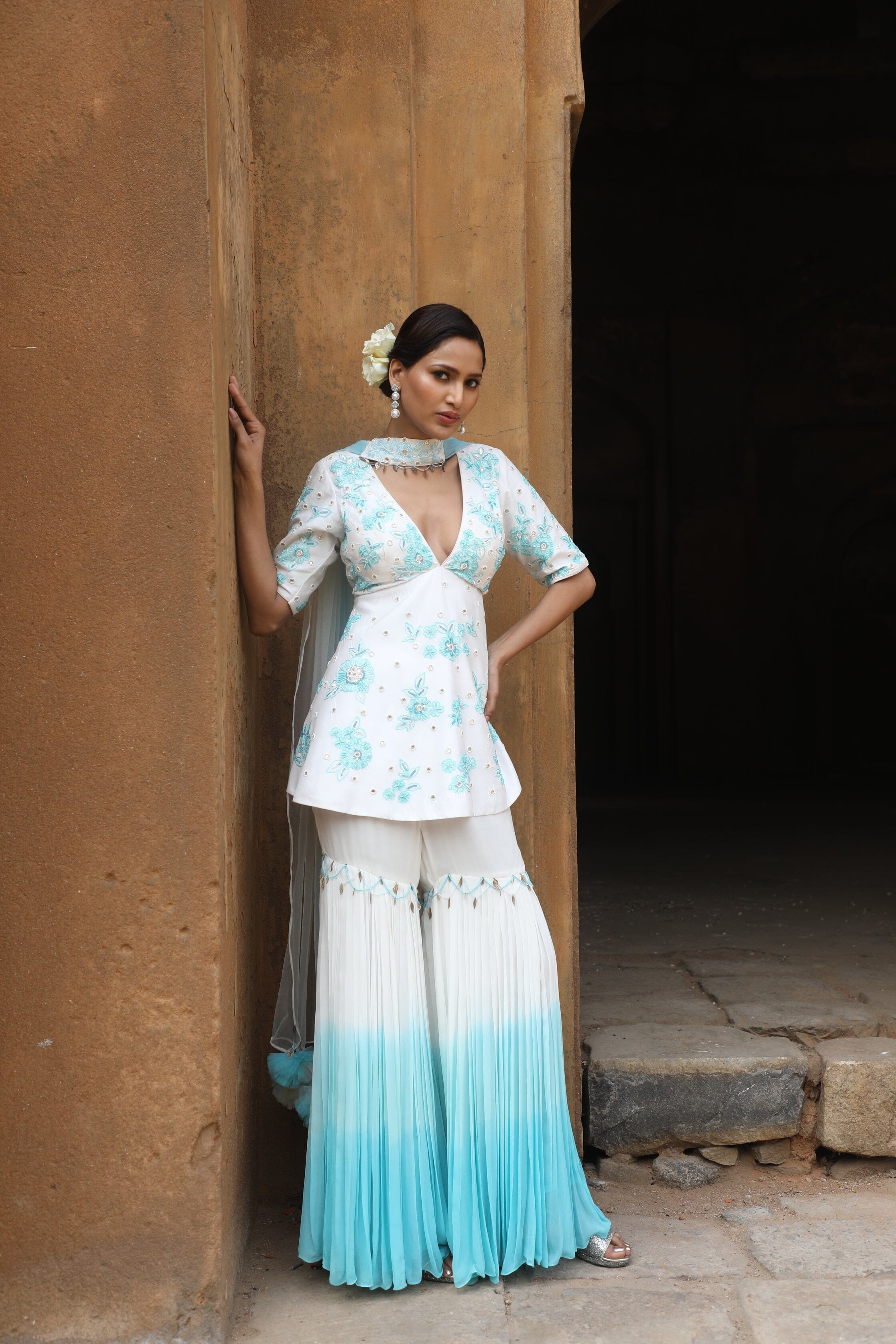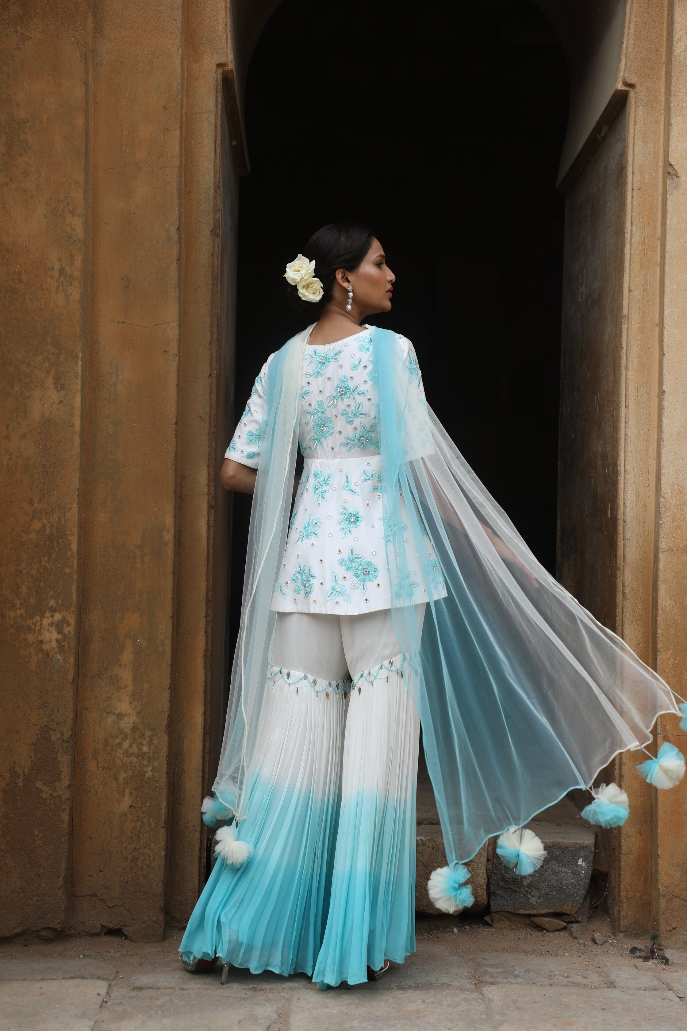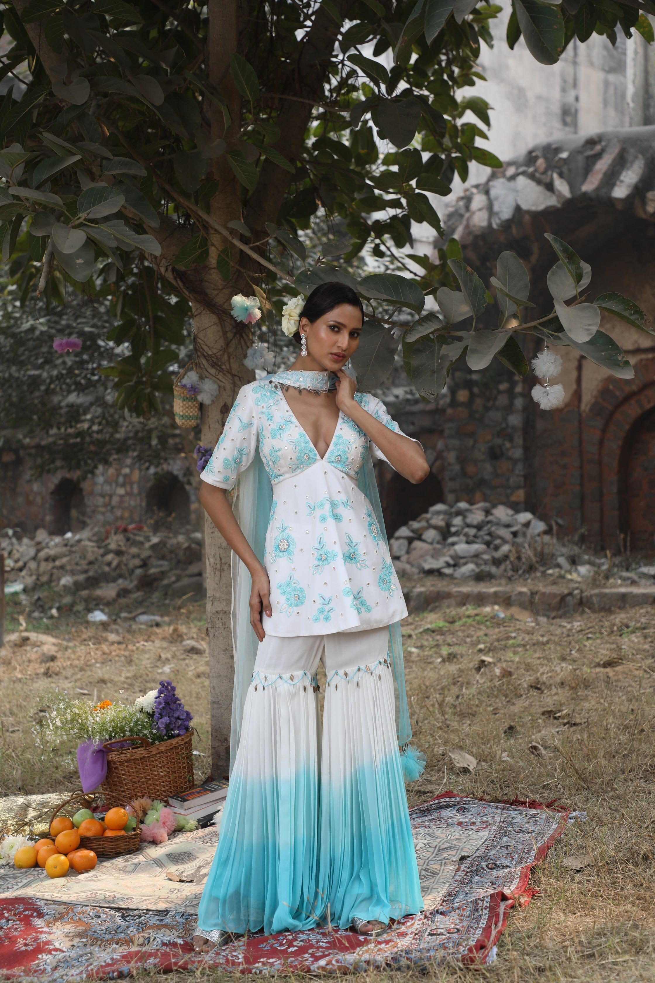 Con peplum de seda color marfil con secuencia, bordado con motivos florales de cuentas en el corpiño, combinado con gharara georgette sombreada en blanco y azul con detalles y dupatta de gargantilla de red con nuestros colgantes característicos.