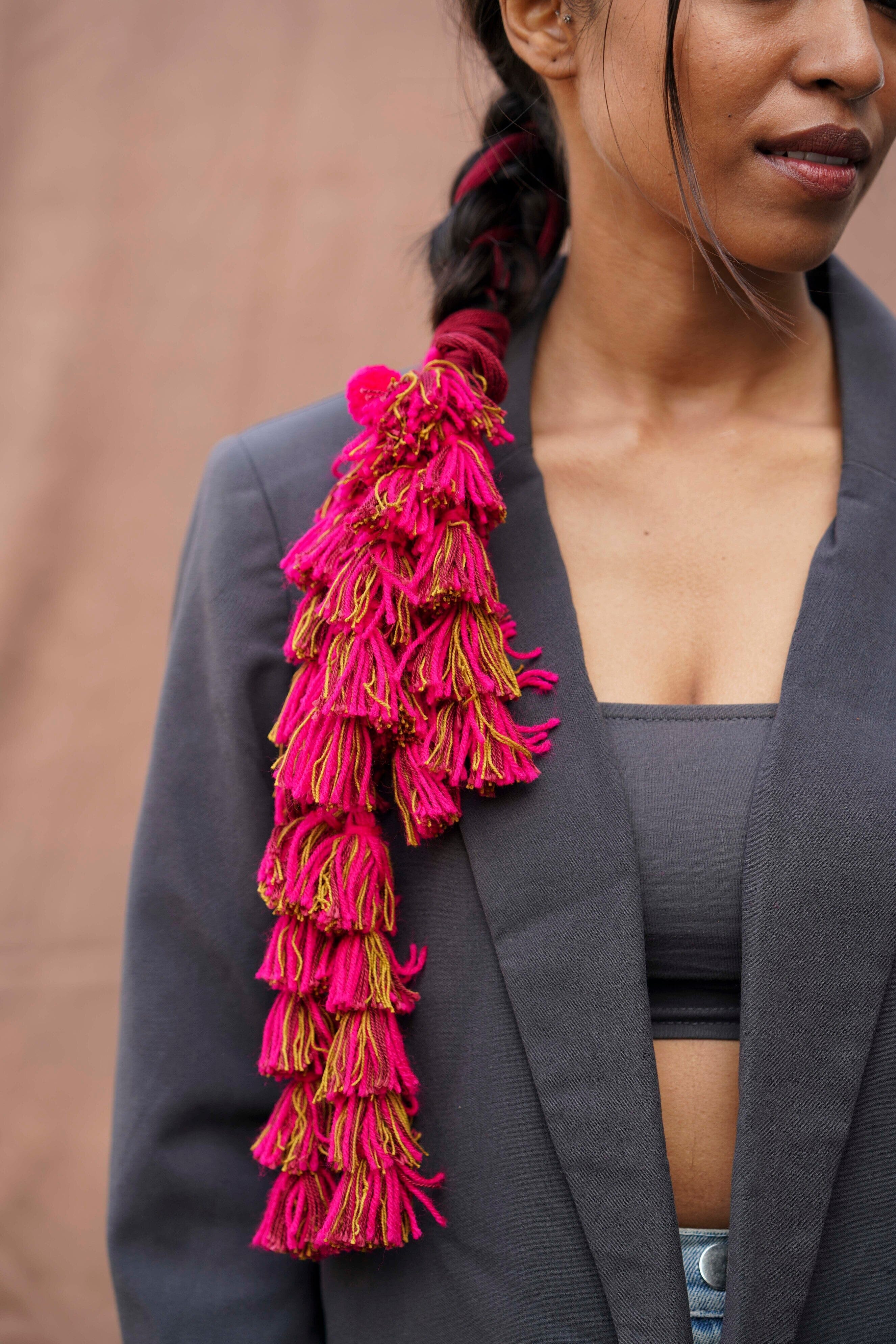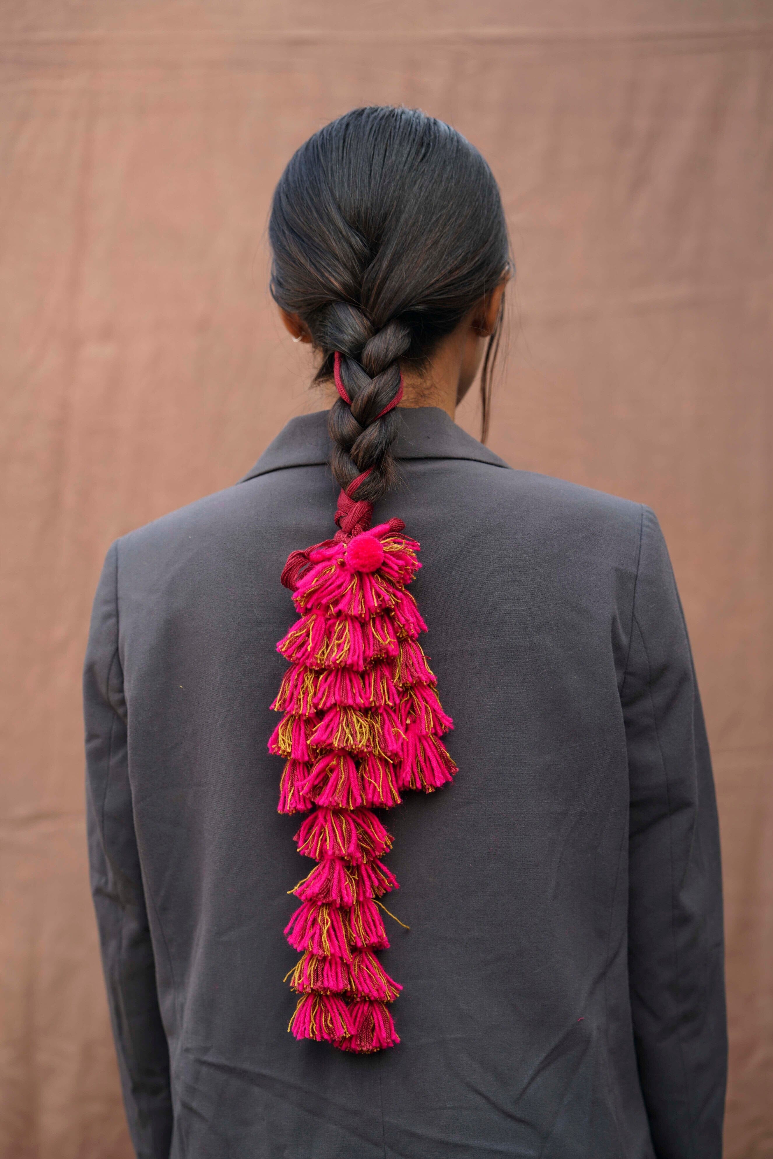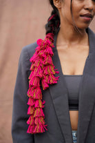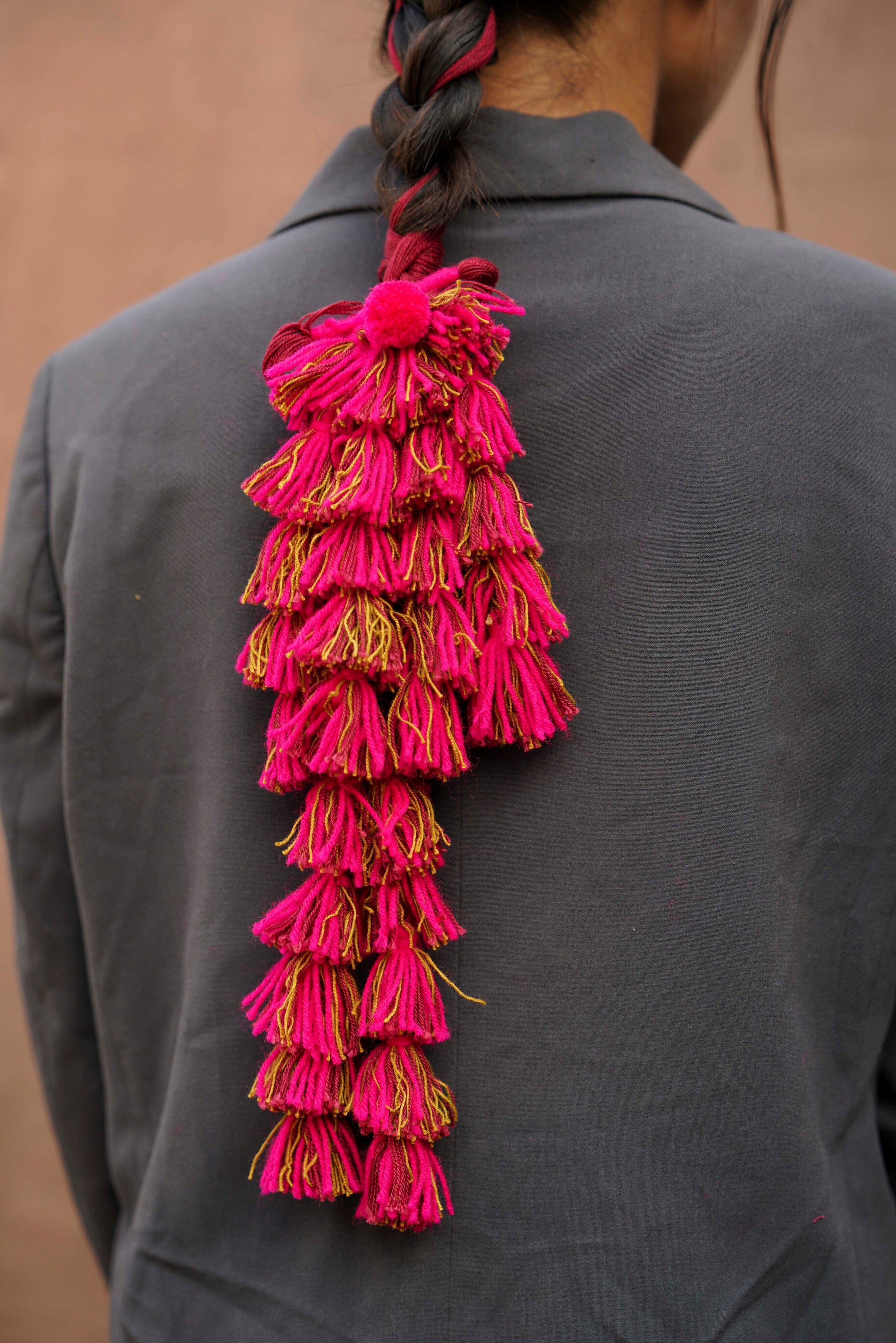 Manojos de borlas hábilmente hechas a mano en tonos rojos, rosas y dorados.
