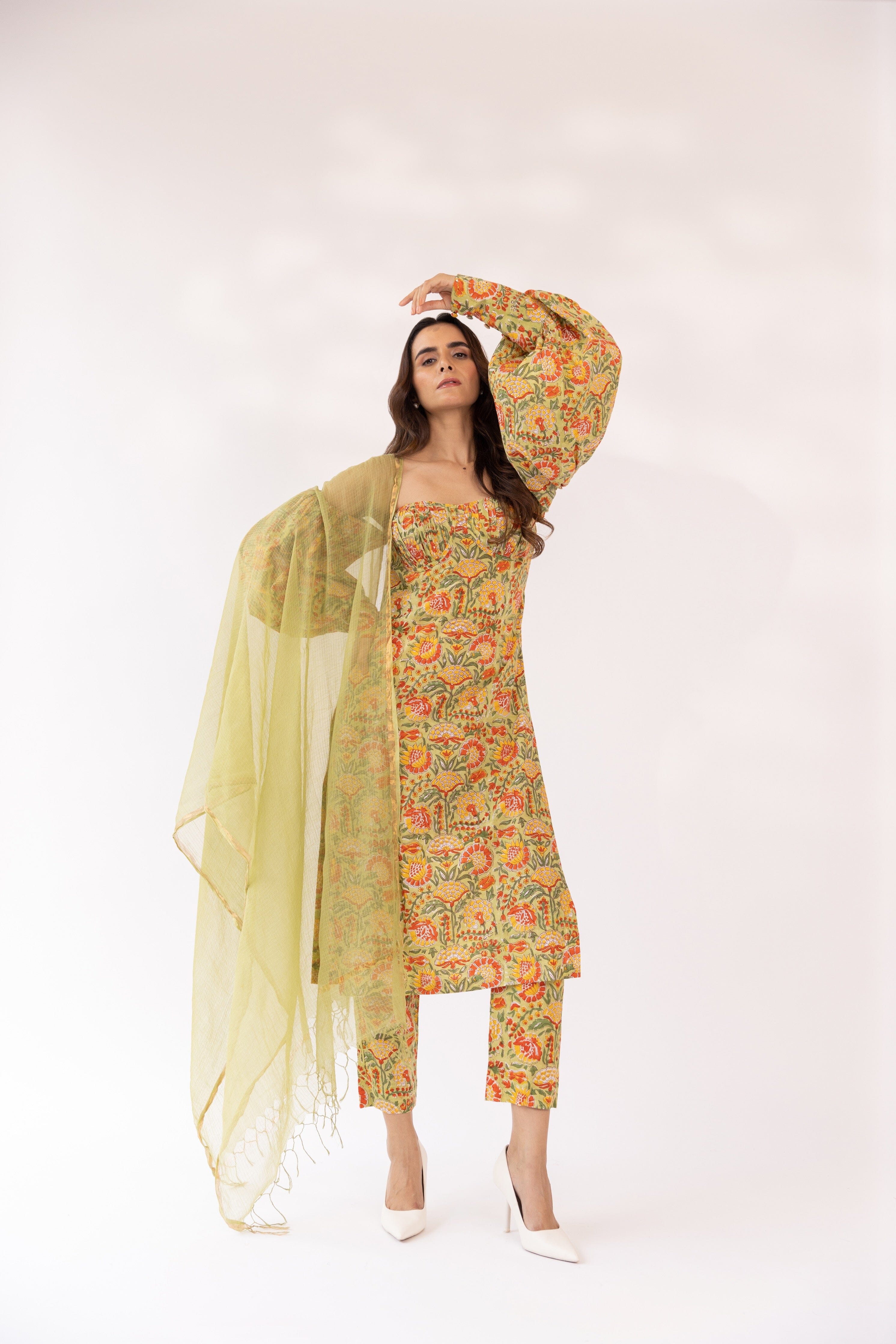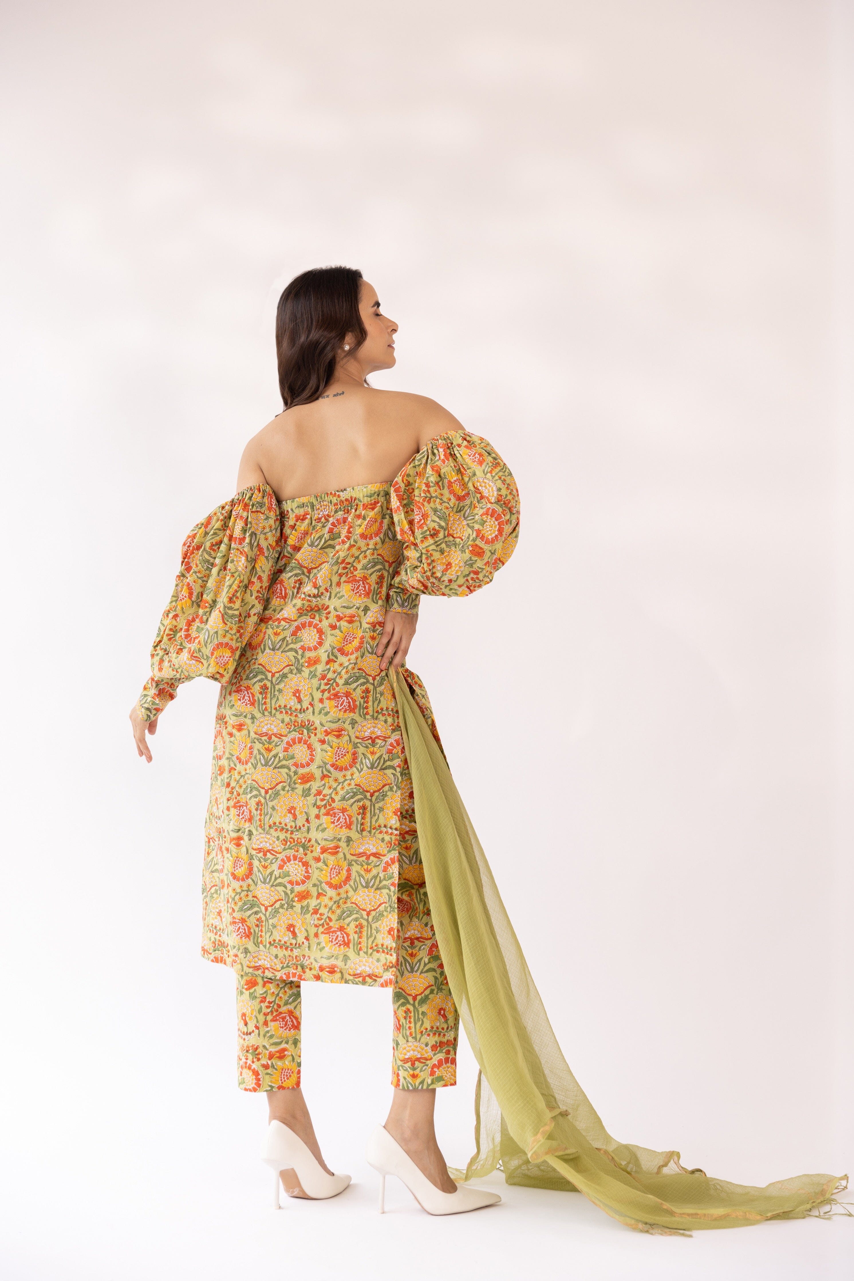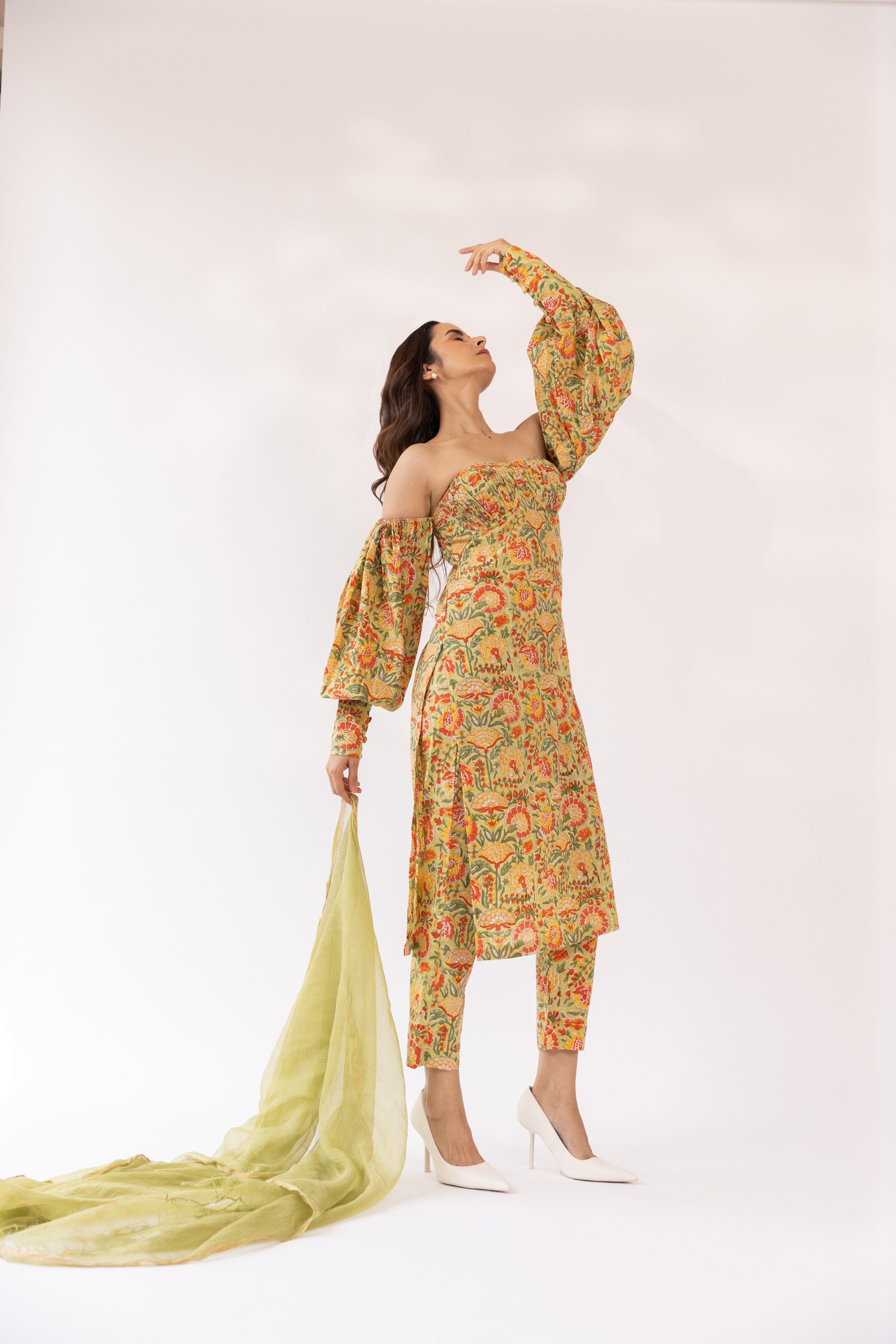Con conjunto de kurta corsé con hombros descubiertos y estampado de bloques mostaza en una base de mezcla de algodón detallada con mangas voluminosas. Se combina con pantalones a juego y cottadoria dupatta sólida.