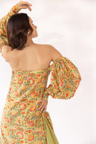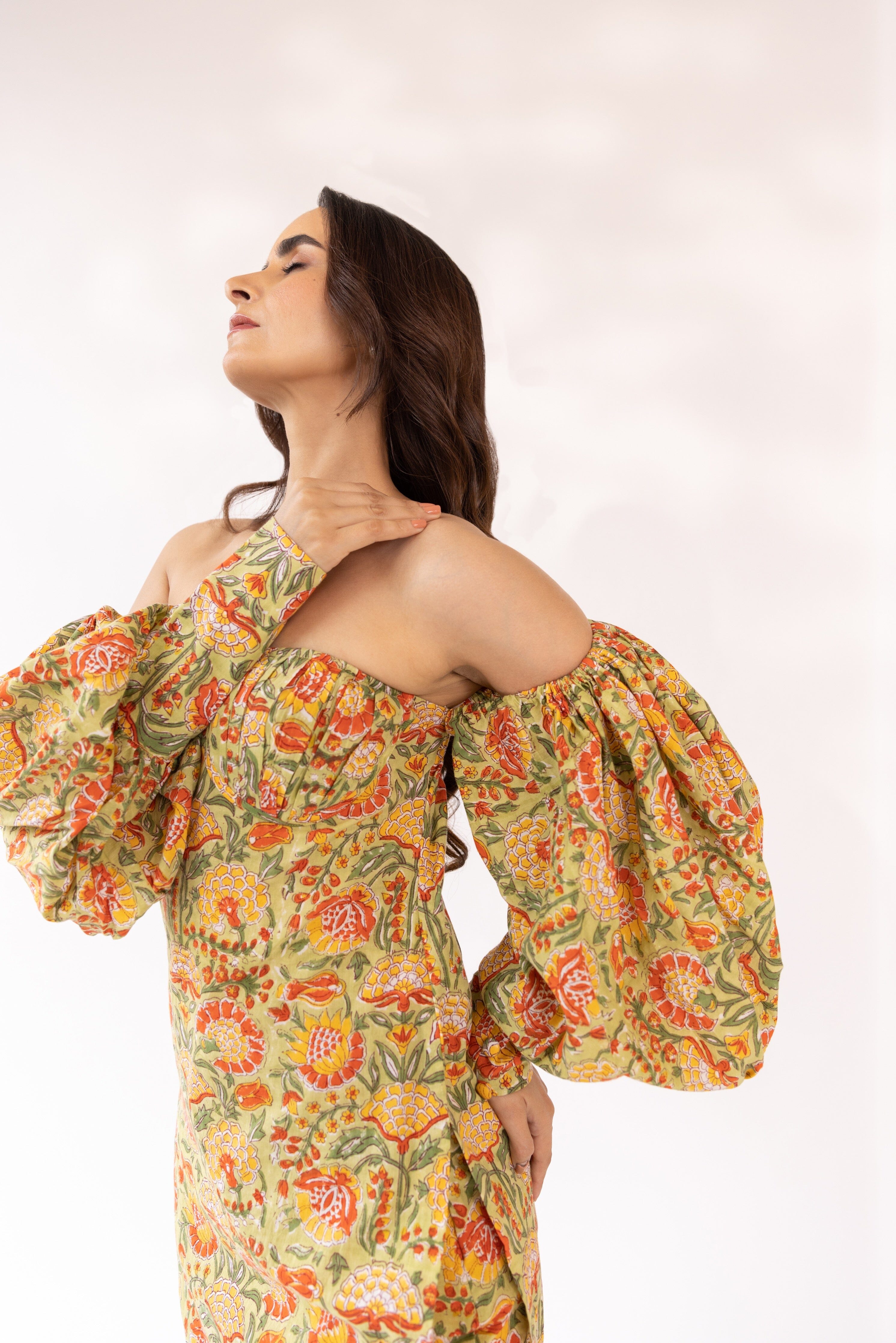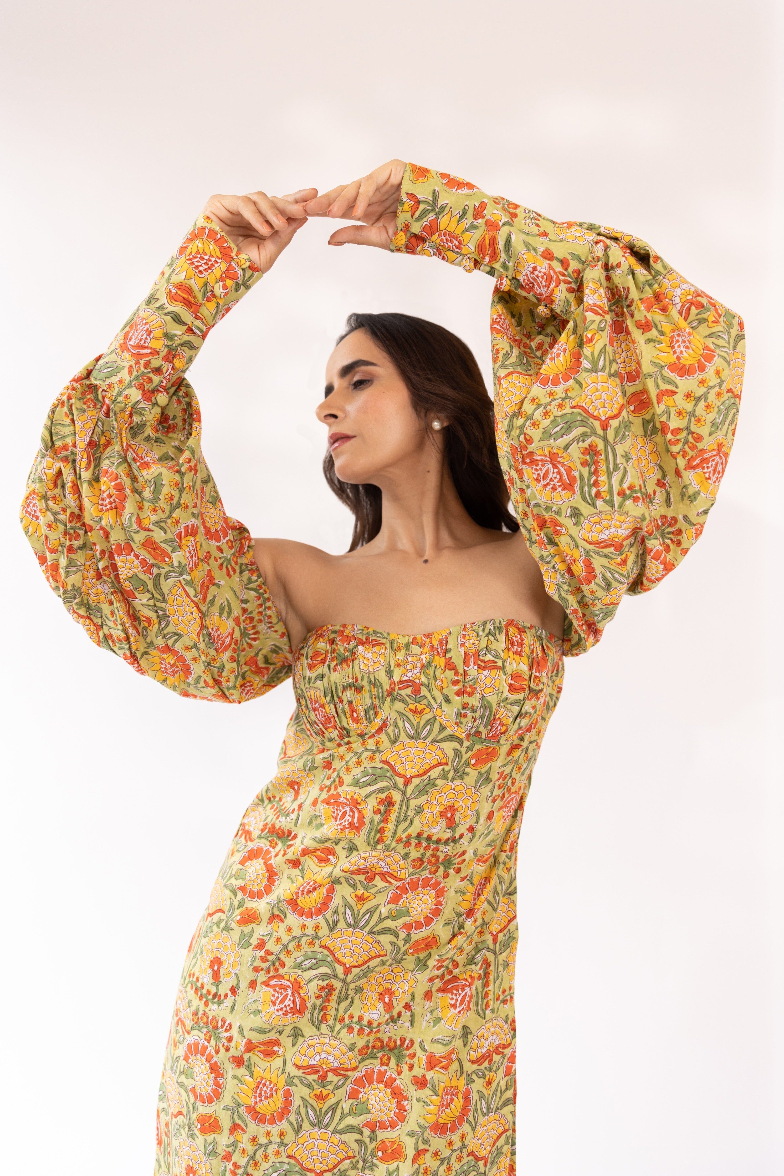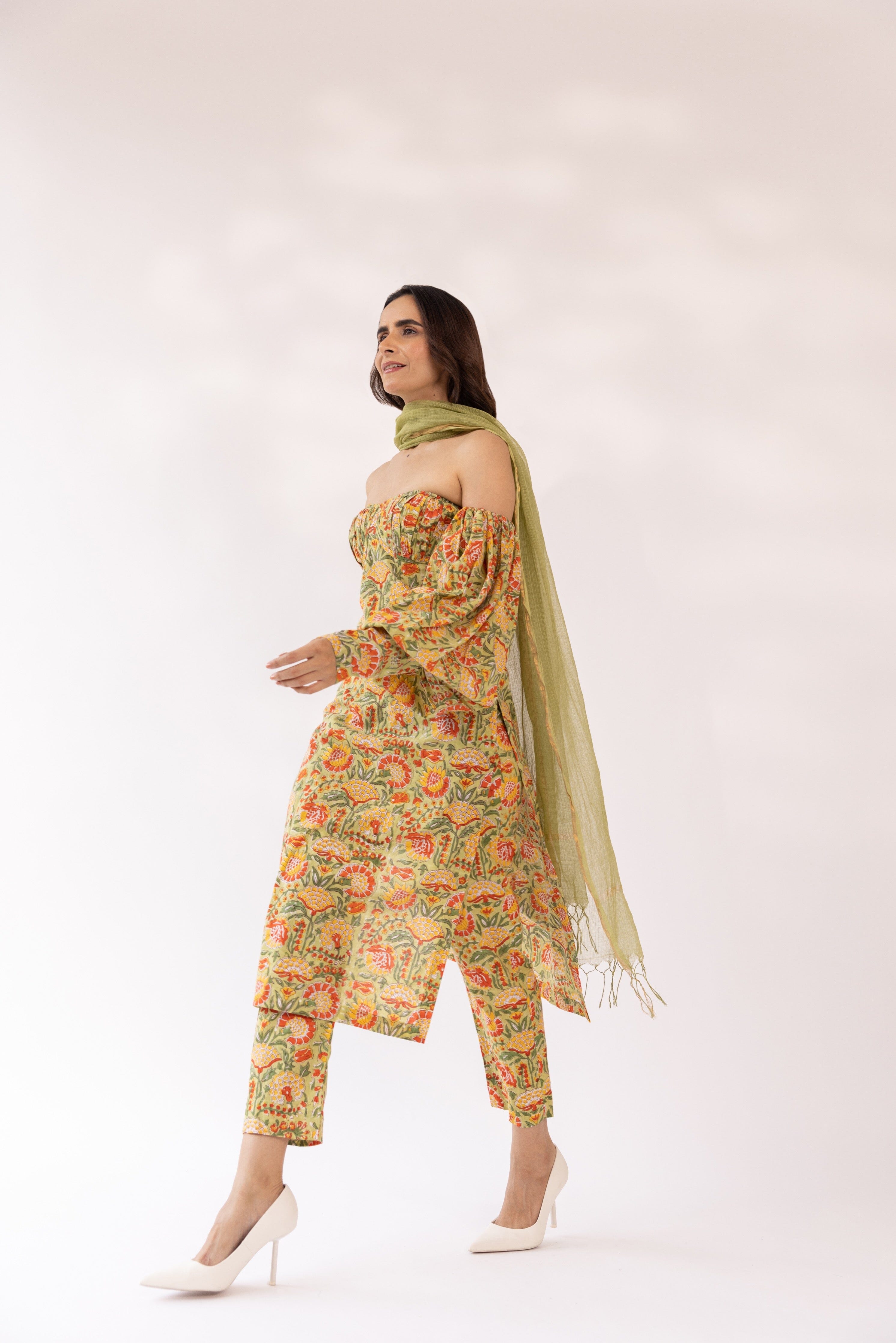 Con conjunto de kurta corsé con hombros descubiertos y estampado de bloques mostaza en una base de mezcla de algodón detallada con mangas voluminosas. Se combina con pantalones a juego y cottadoria dupatta sólida.