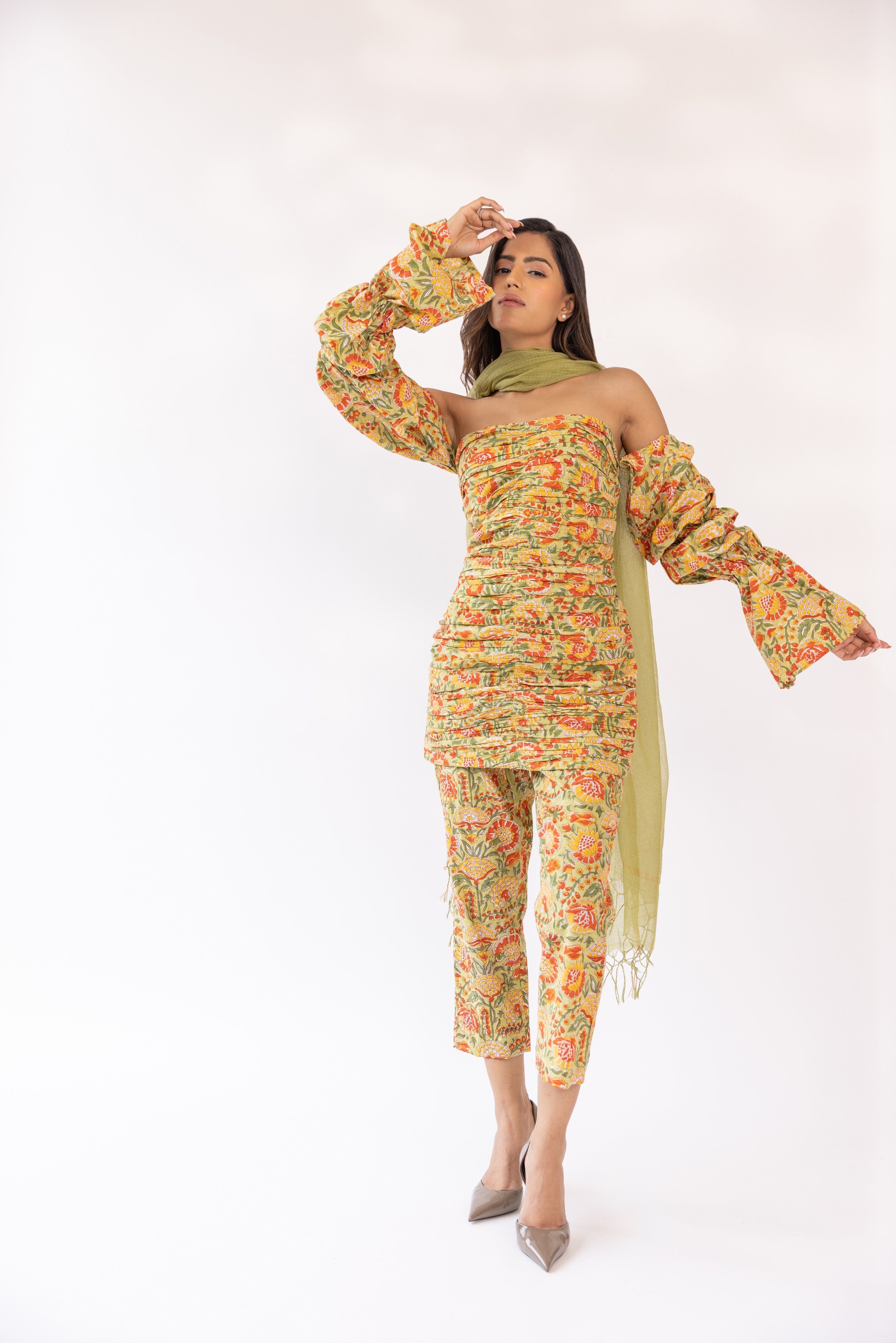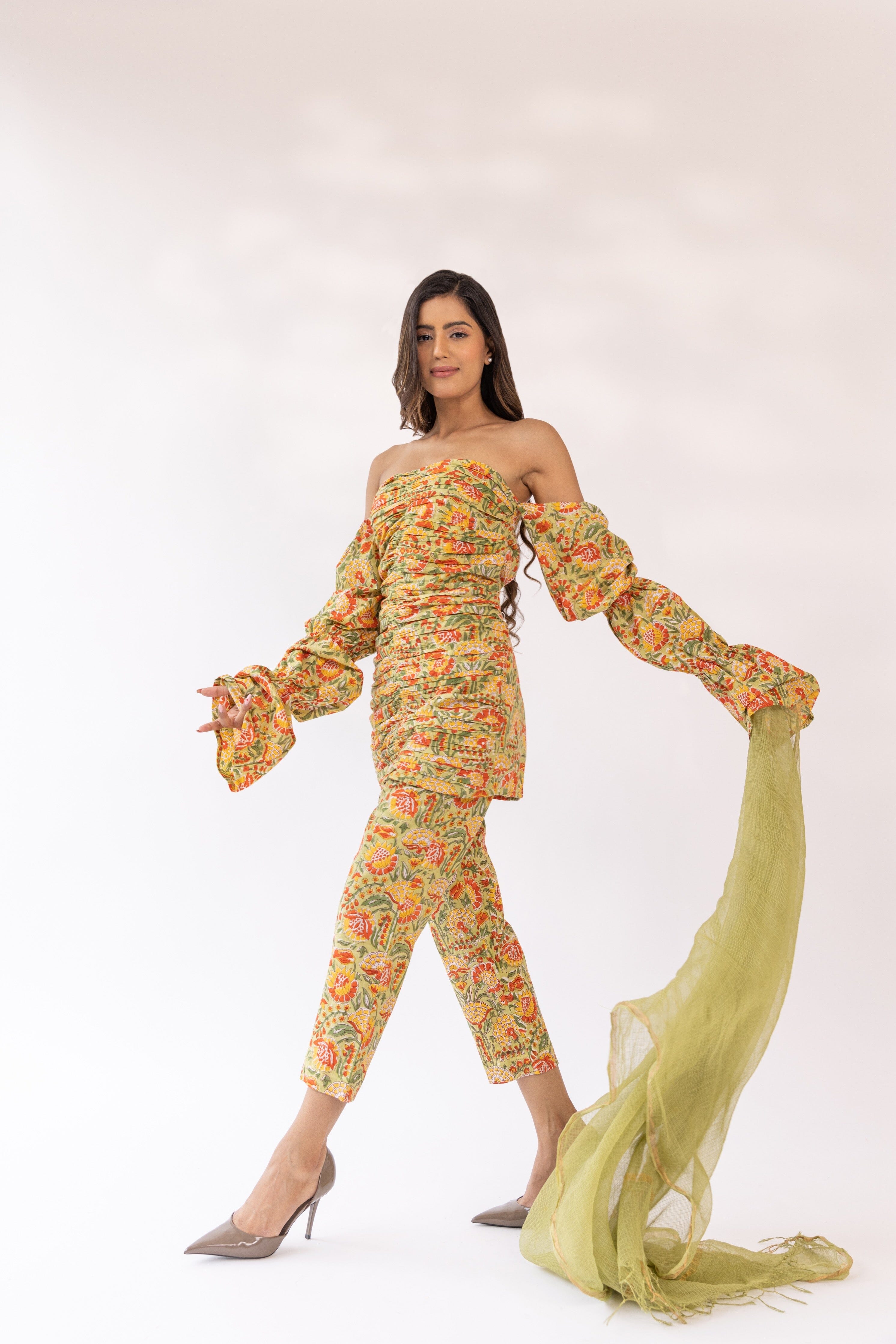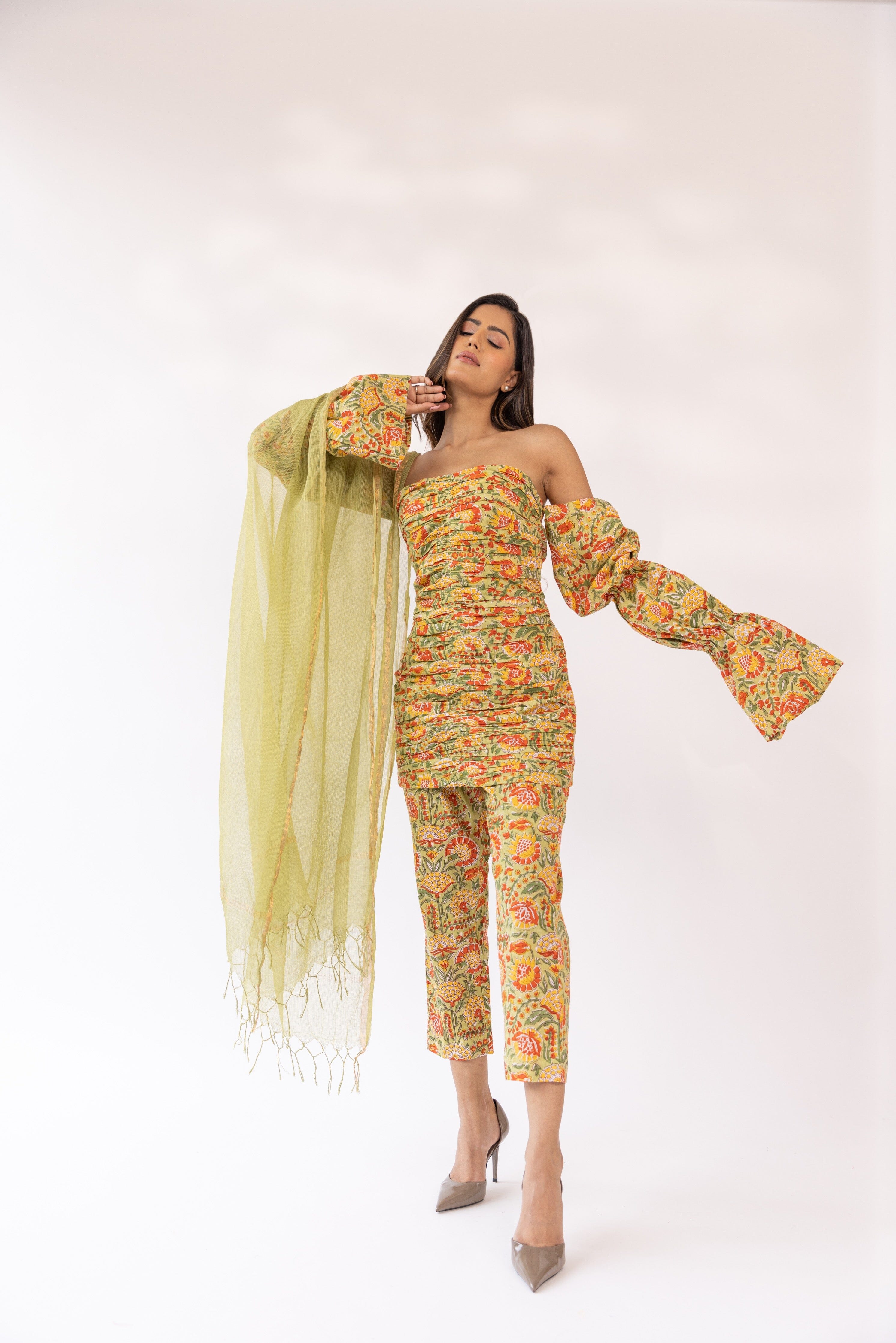 Con estampado de bloques mostaza y hombros descubiertos, conjunto de kurta fruncido en base de mezcla de algodón detallada con mangas voluminosas. Se combina con pantalones a juego y cottadoria dupatta sólida.