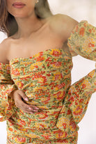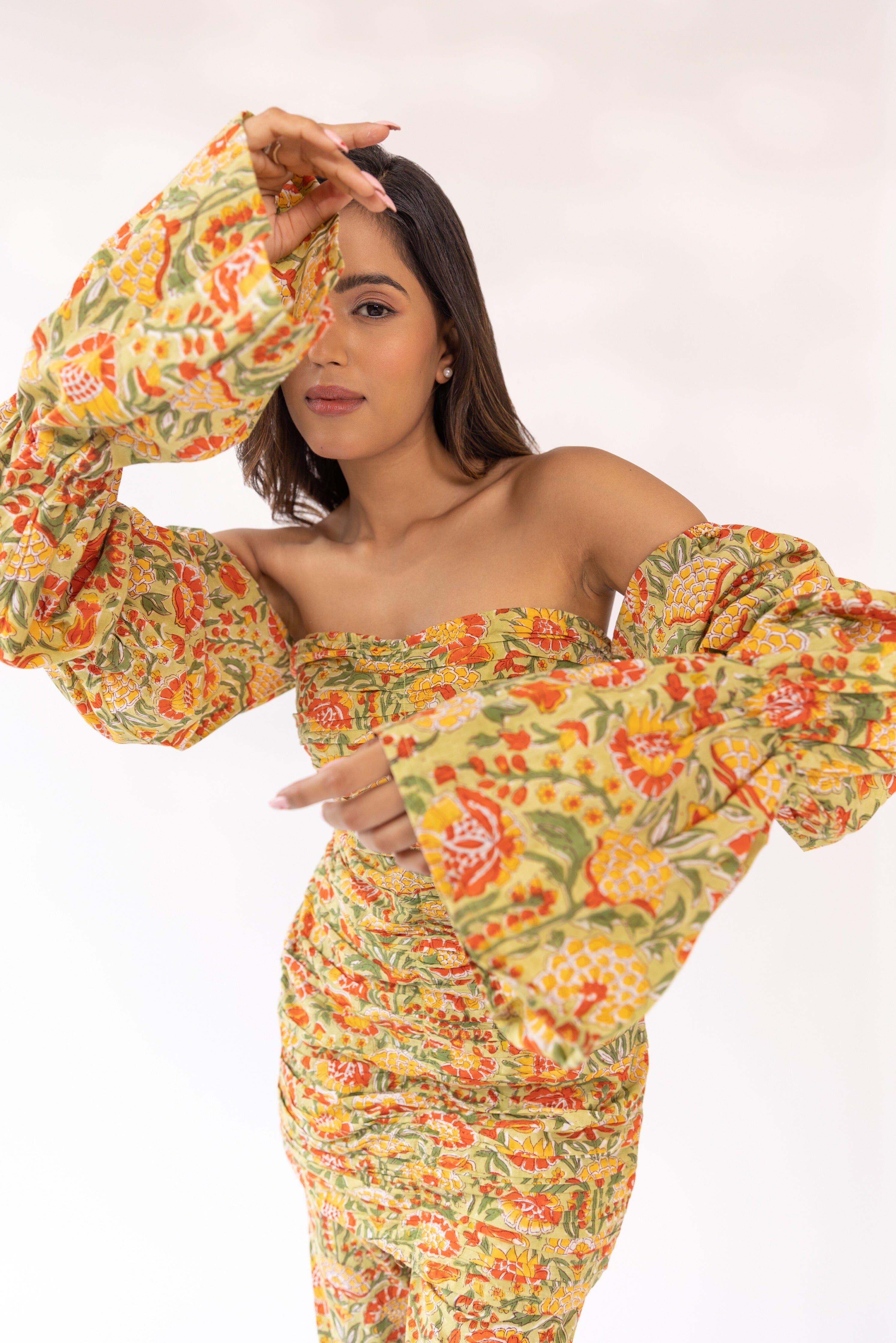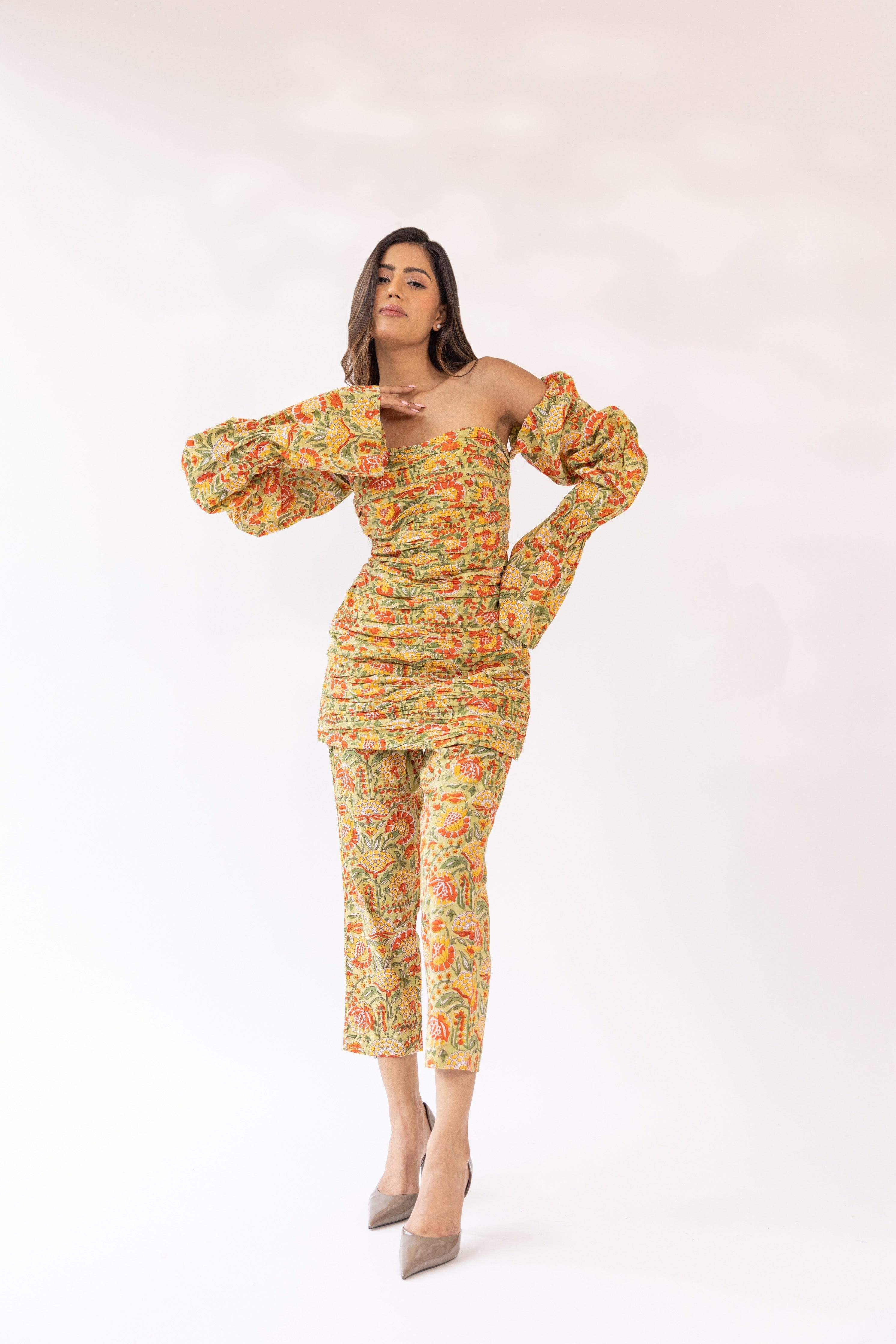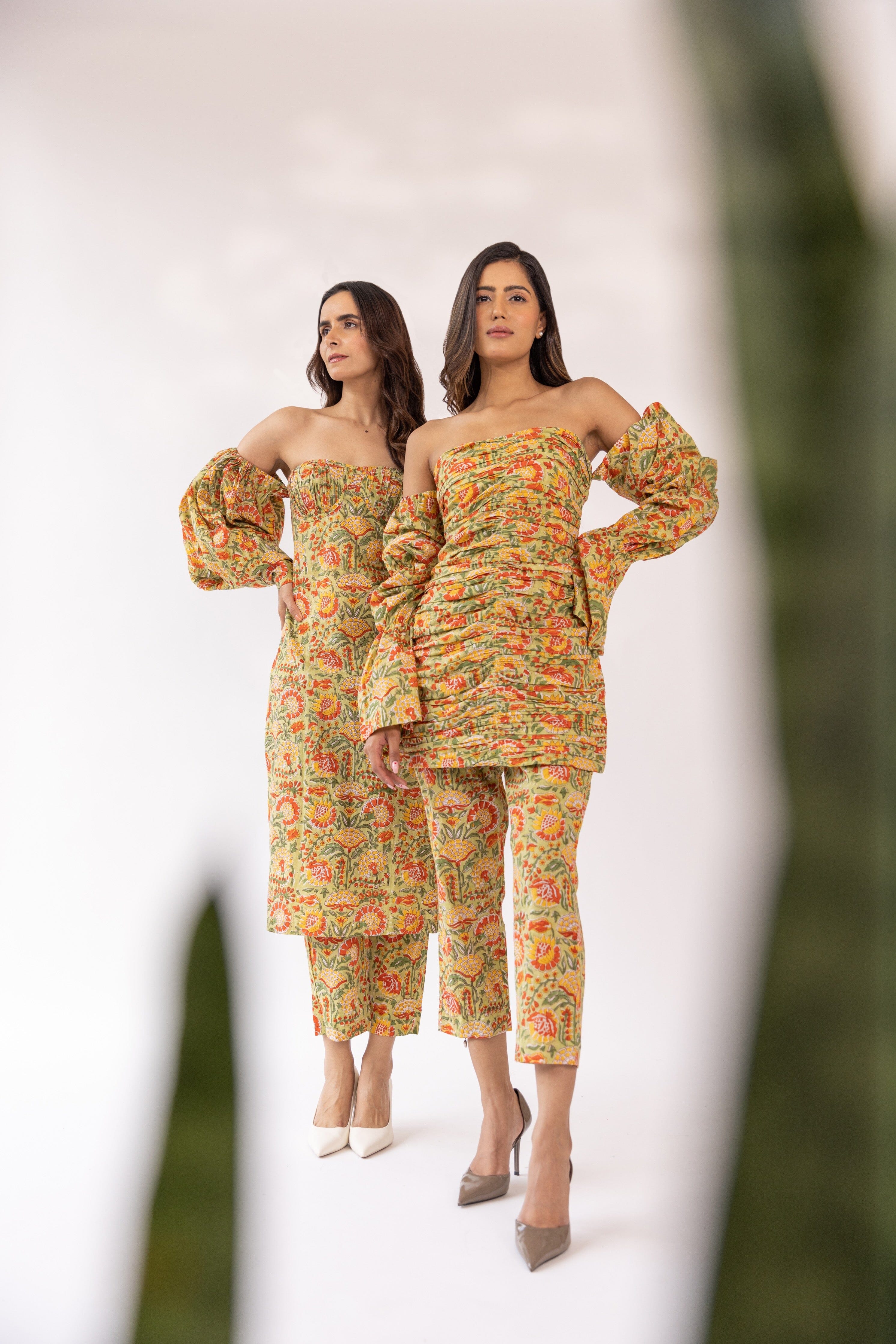 Con estampado de bloques mostaza y hombros descubiertos, conjunto de kurta fruncido en base de mezcla de algodón detallada con mangas voluminosas. Se combina con pantalones a juego y cottadoria dupatta sólida.