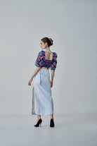 BLOUSE : IKAT INSPIRED PRINT, HAND MICRO PLEAT CROSS OVER STYLE BLOUSE WITH TIE UP BALLOON SLEEVES