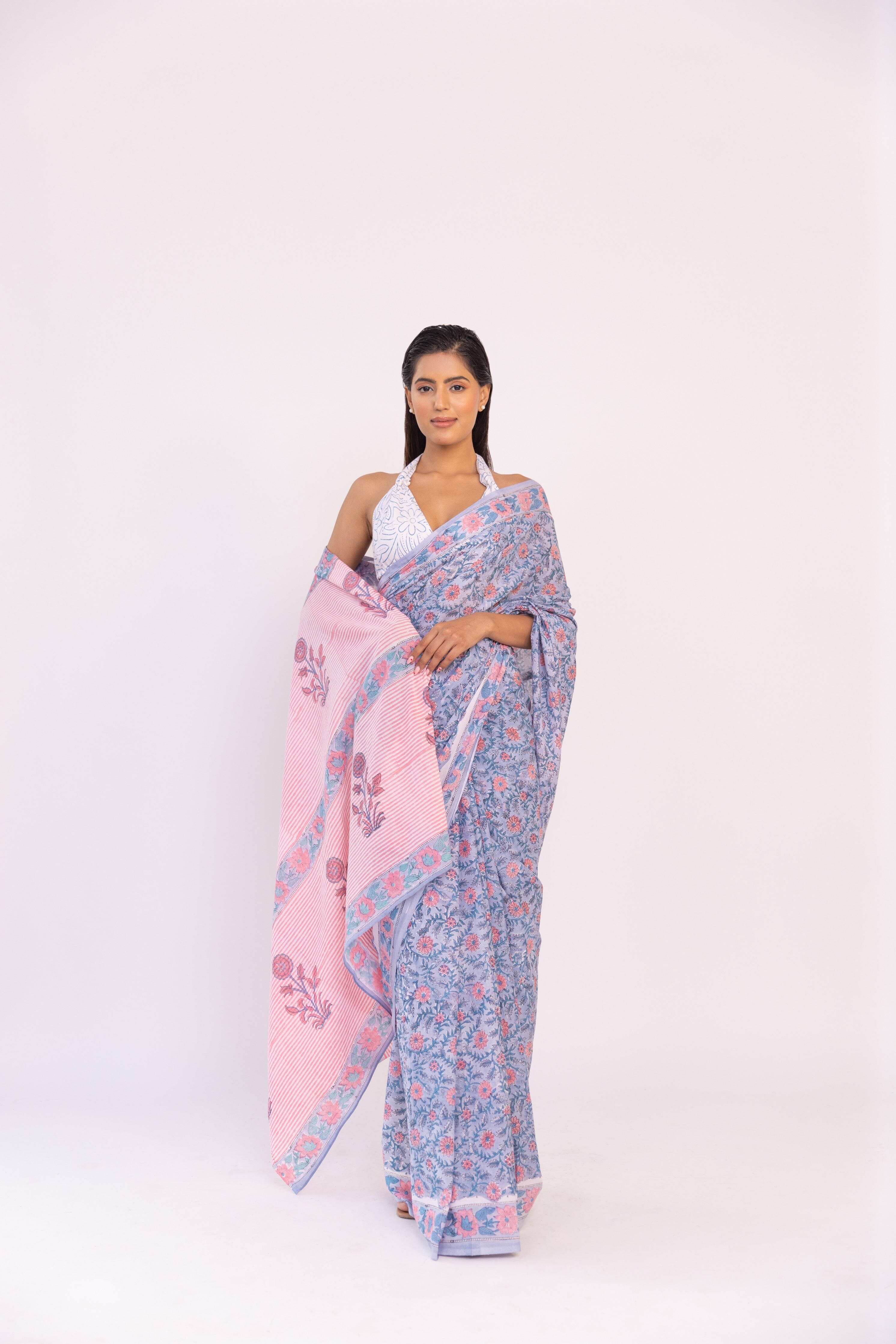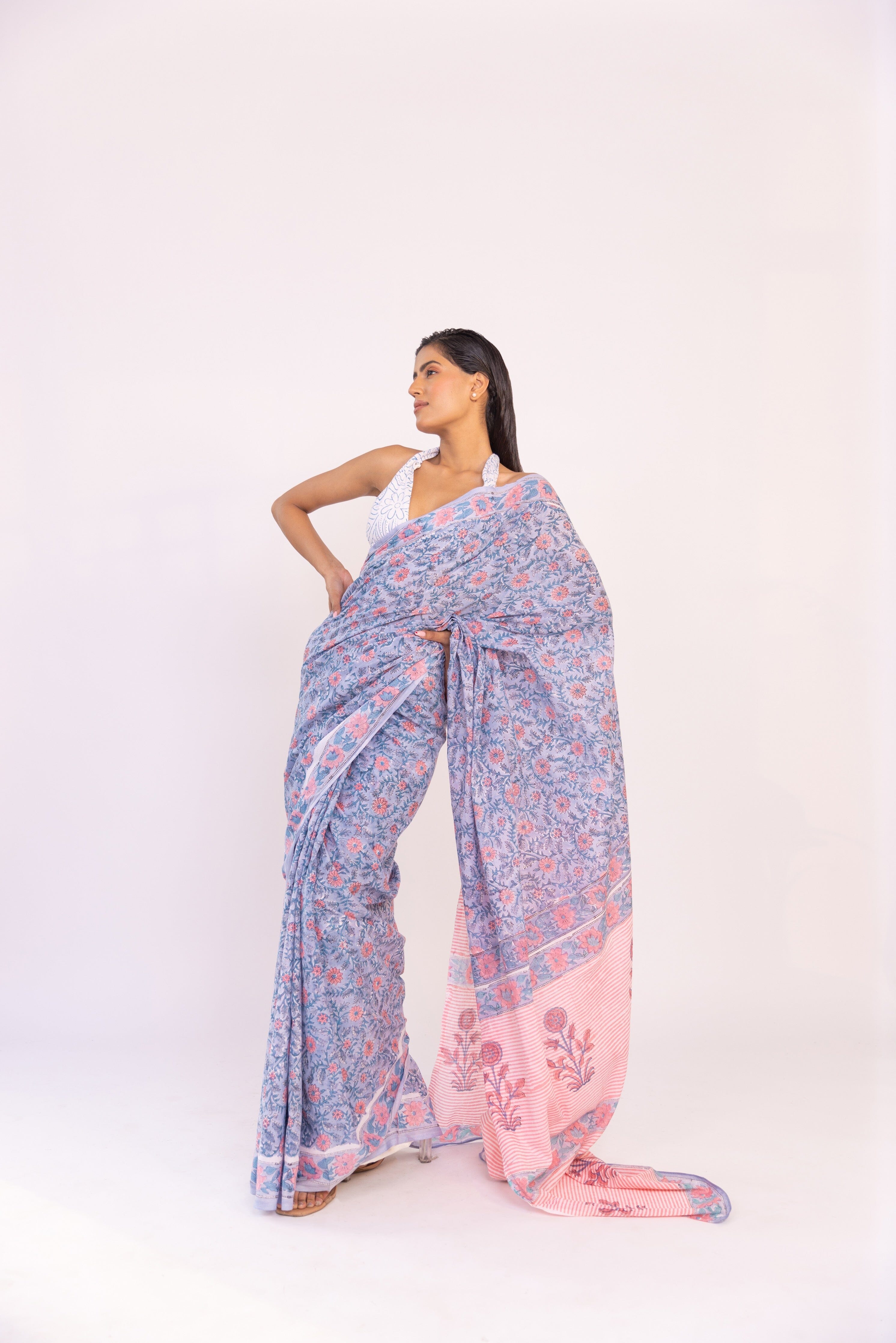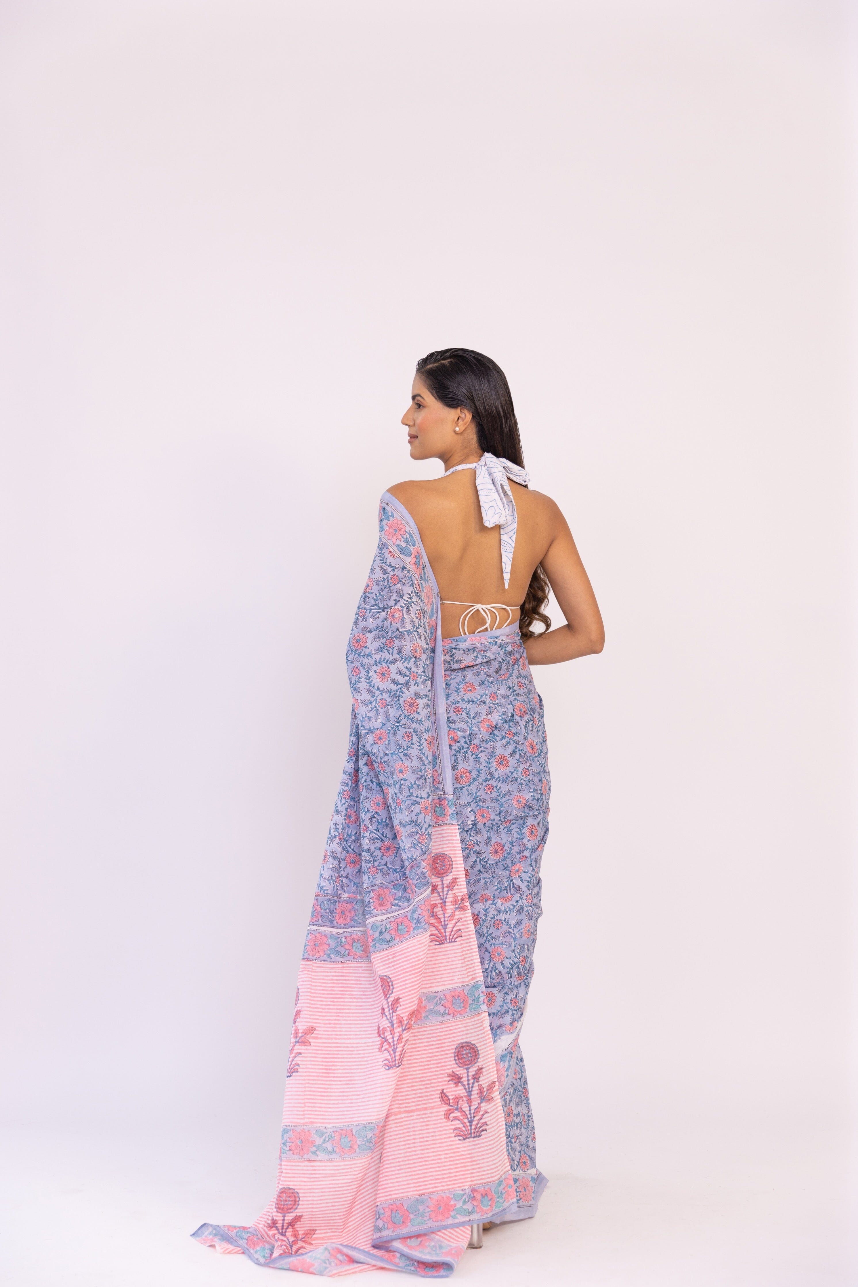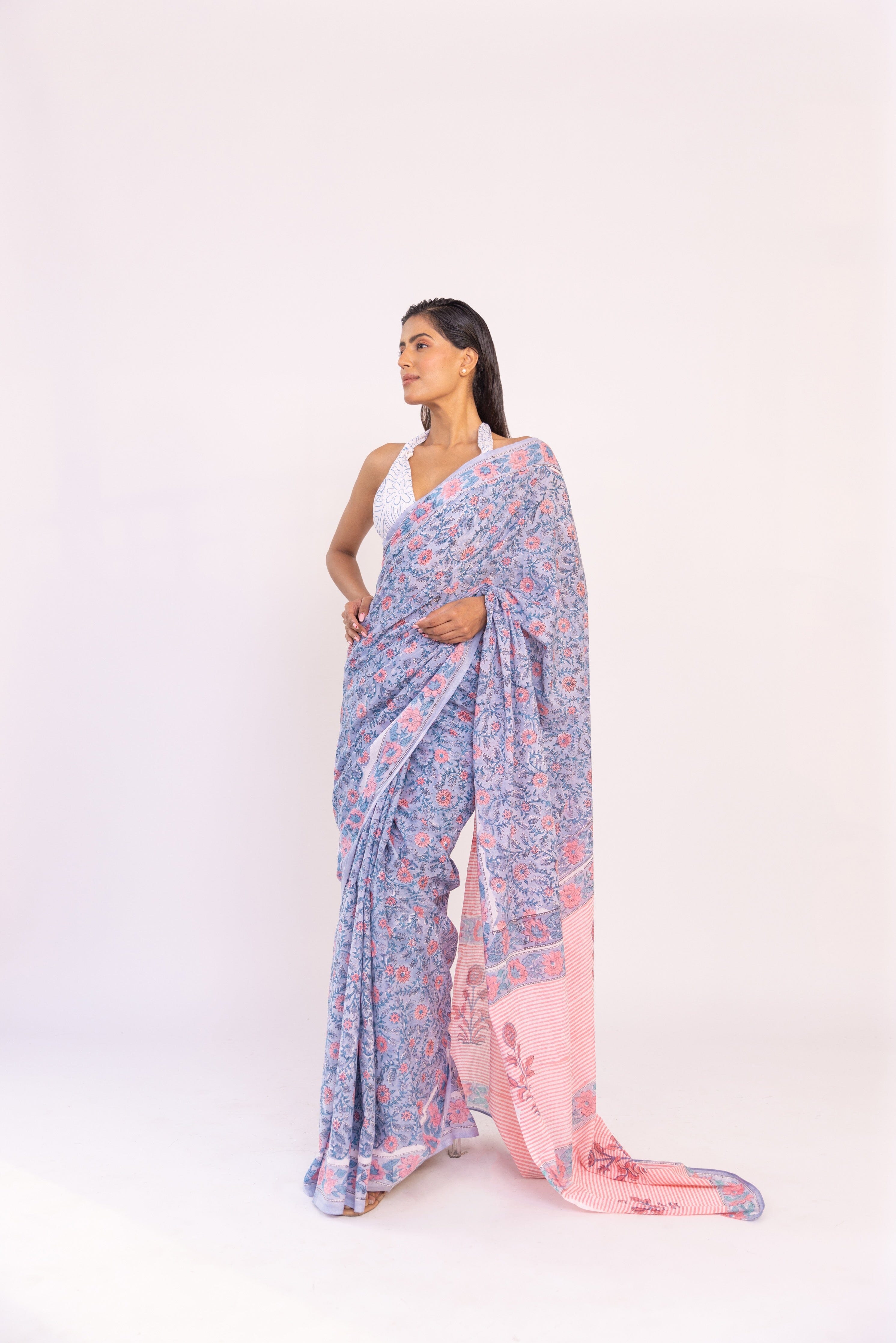 Con un sari morado precosido en base de puro algodón. Se combina con una blusa sin mangas.
