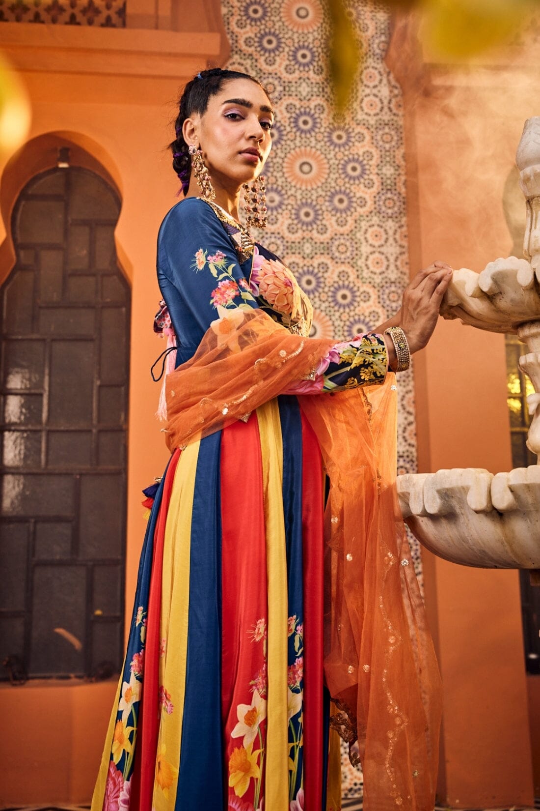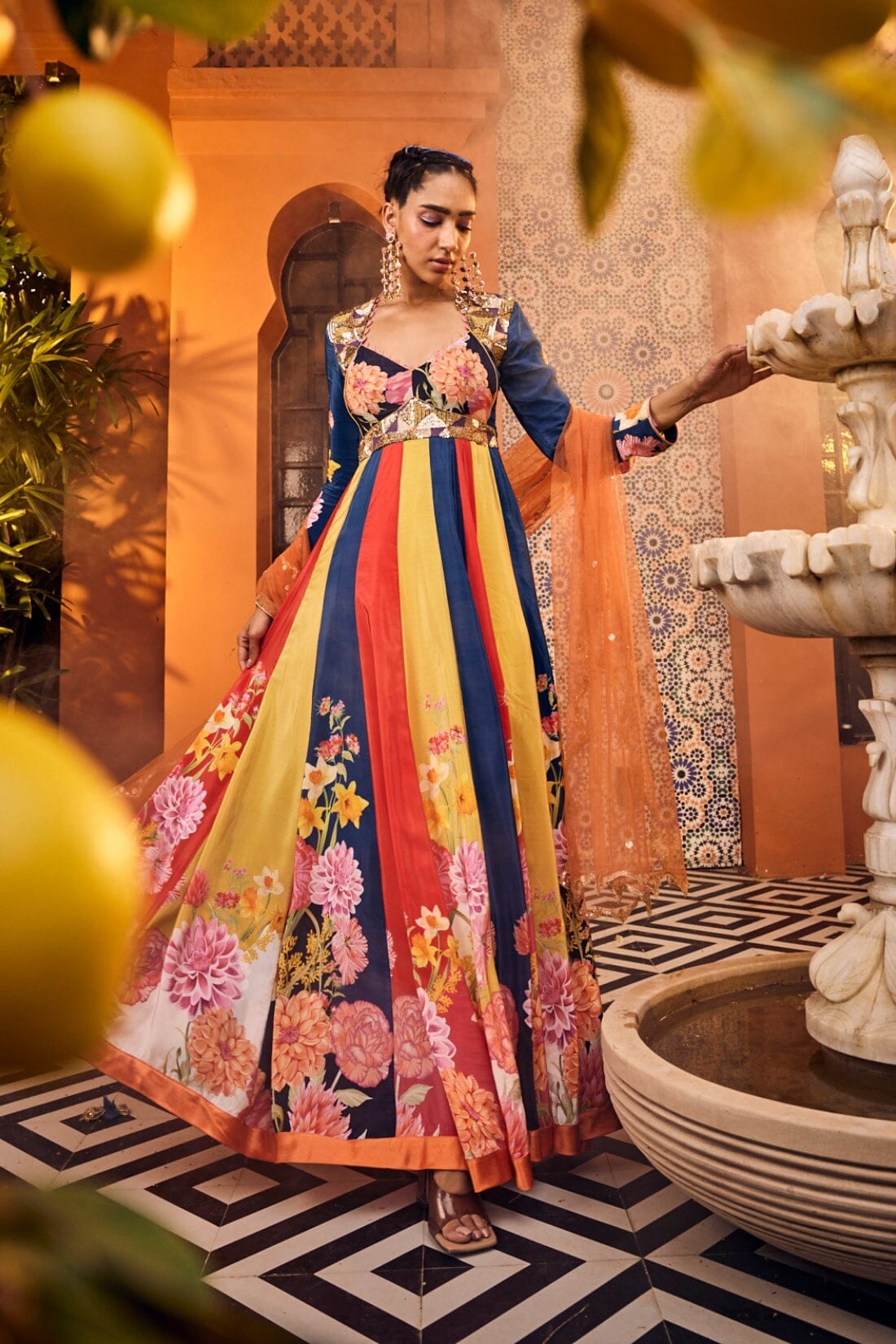 Multi-colored printed sweetheart neck embroidered Anarkali set, perfectly paired with an orange net embroidered dupatta.