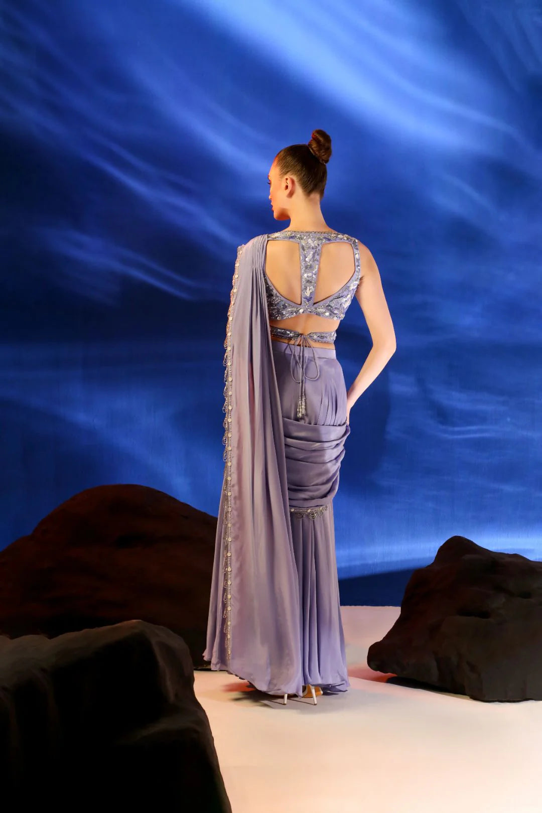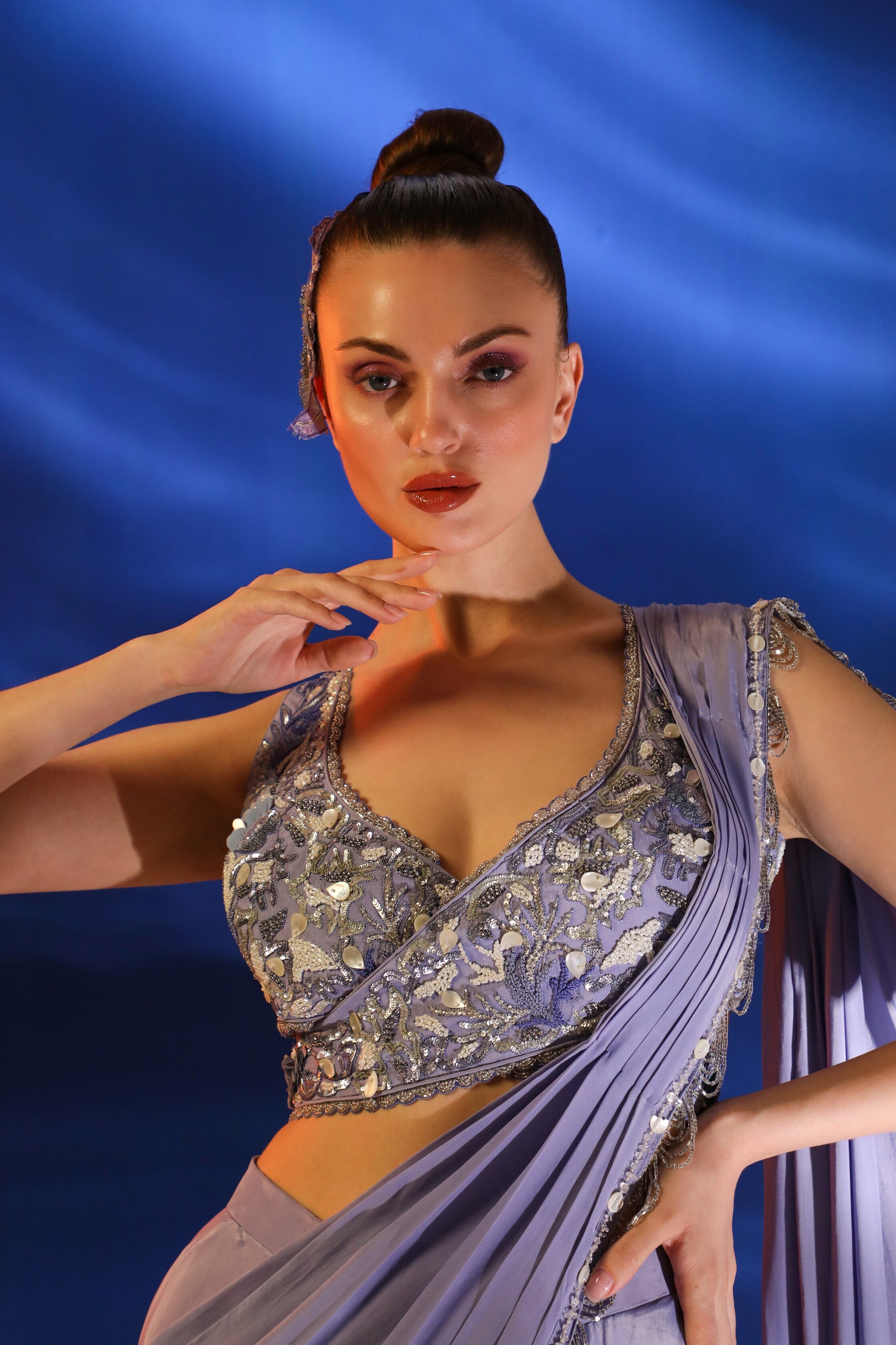 Una blusa cruzada con cuello en V profundo combinada con un sari drapeado plisado y acampanado es el conjunto perfecto para hacer una declaración. El drapeado Asherah es un sari en tonos púrpura jaspeado que es tan elegante como exclusivo.