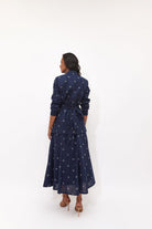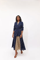 The blazer is double-breasted with a notch collar with front buttoned closure.